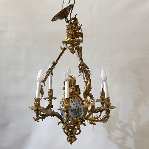 Antique Gilded European Rococo 6-Light Chandelier with Porcelain Center