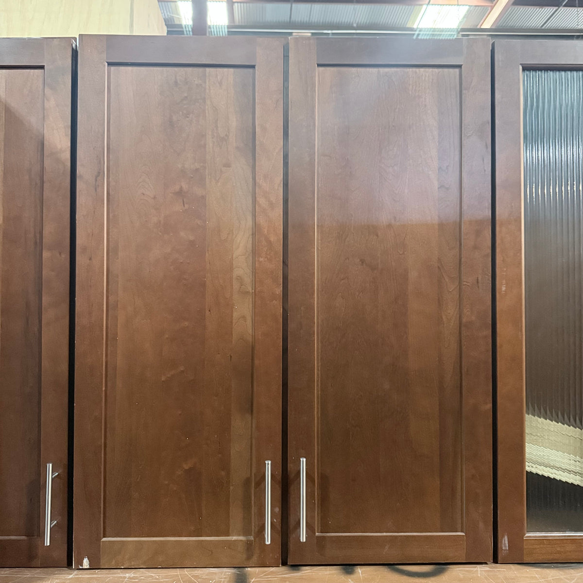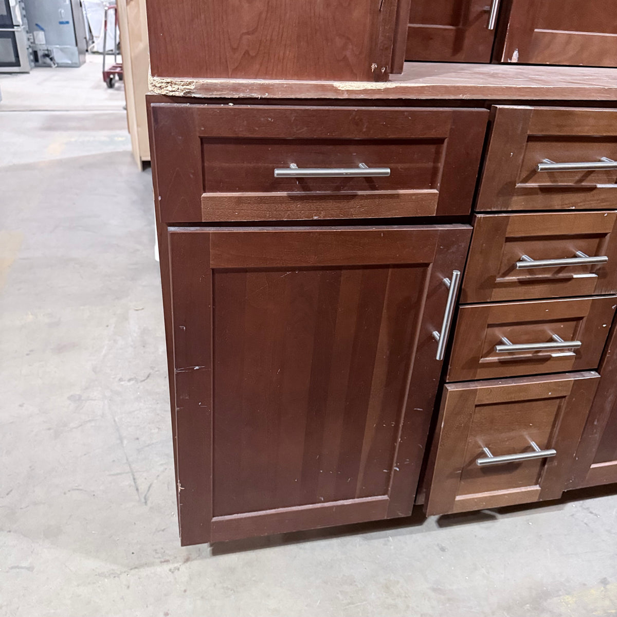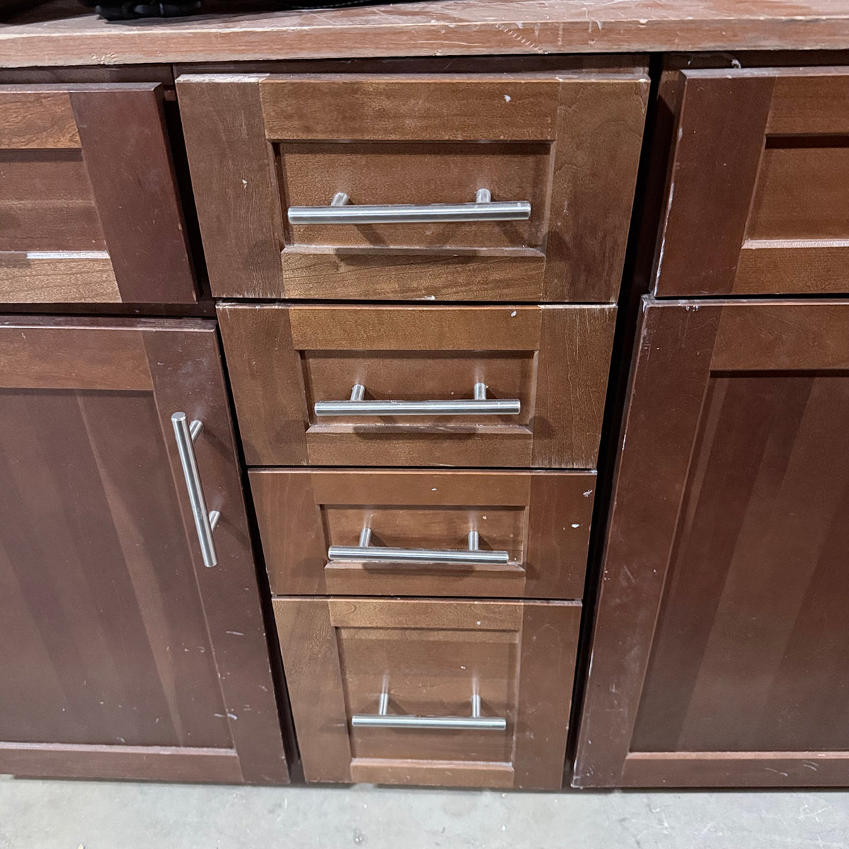 This 11 piece set of dark stained kitchen cabinets features: