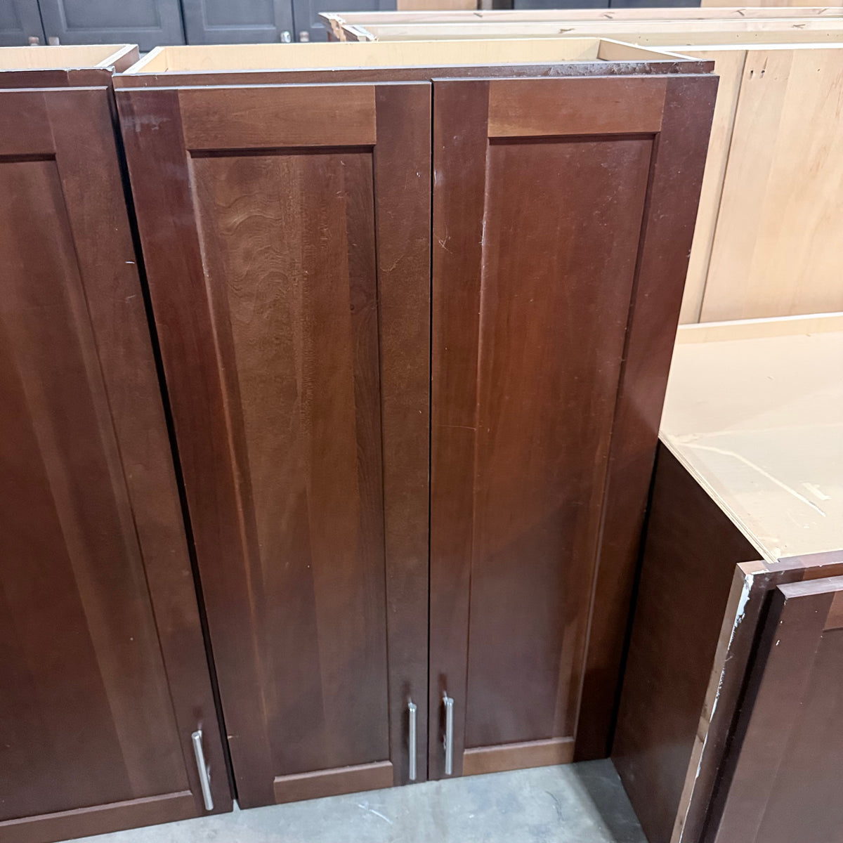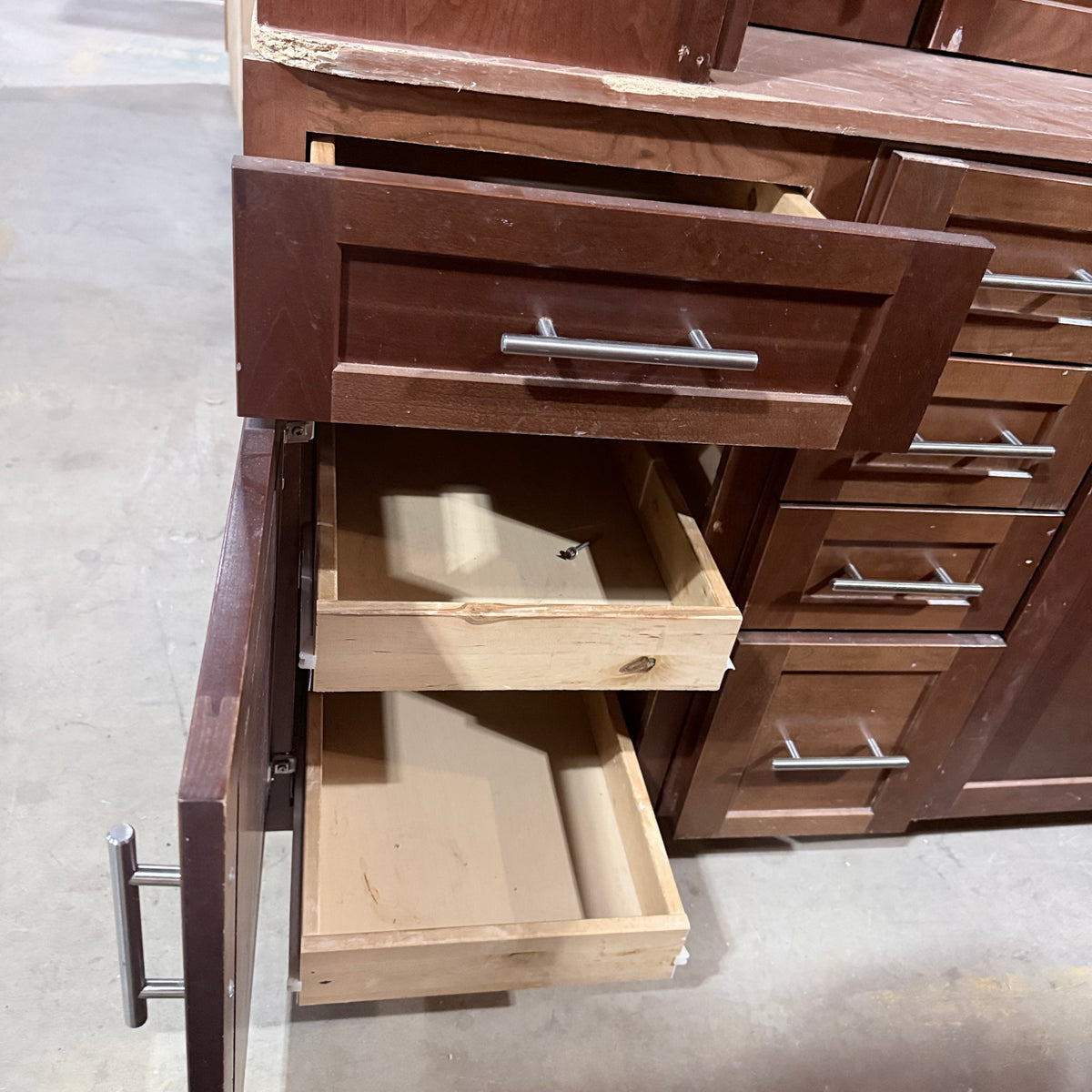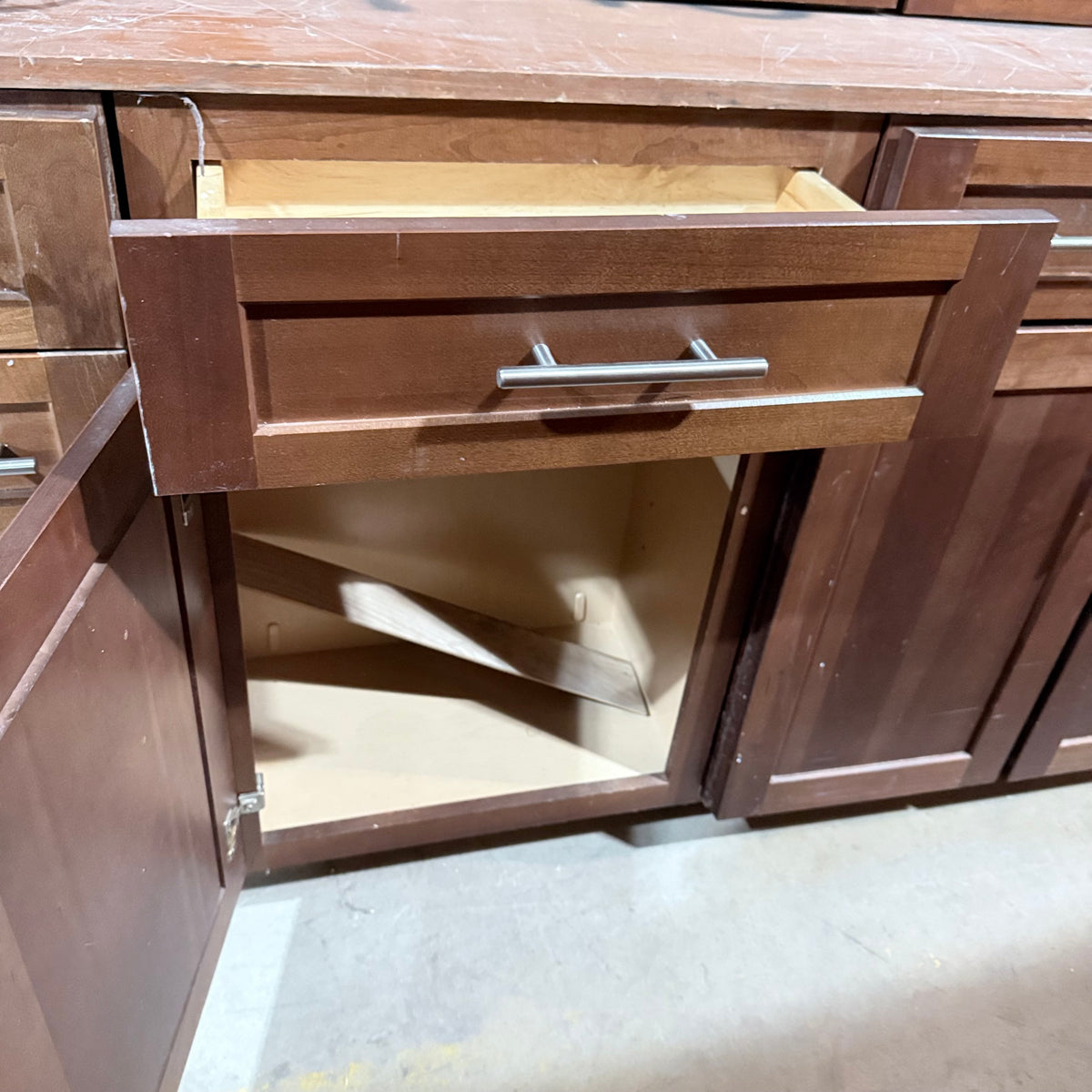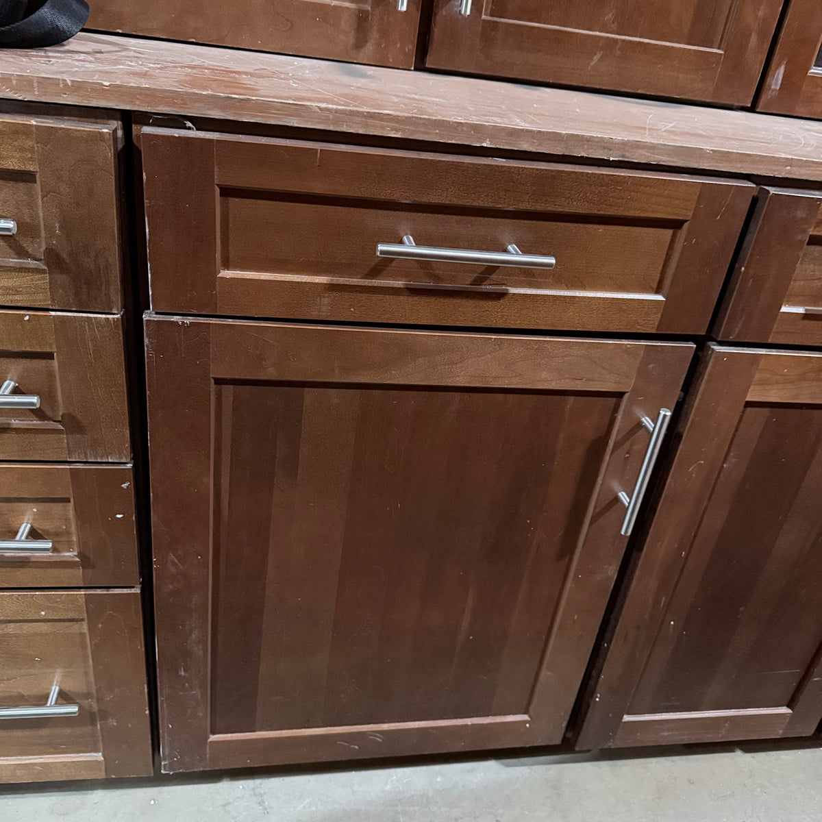 This 11 piece set of dark stained kitchen cabinets features: