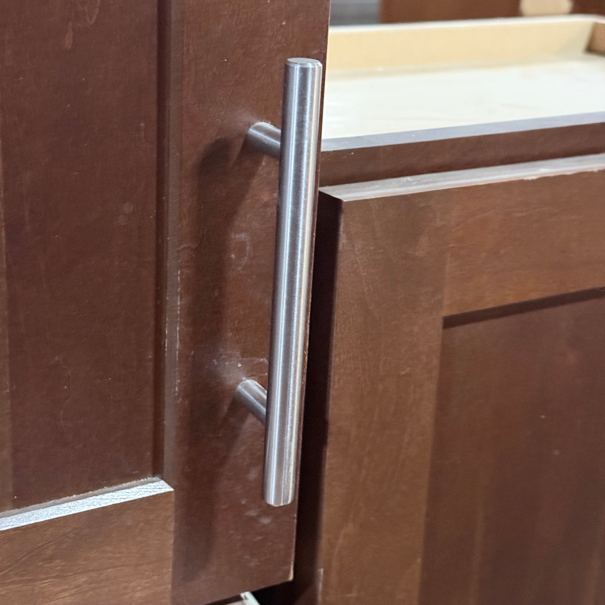 - Brushed nickel bar pulls
