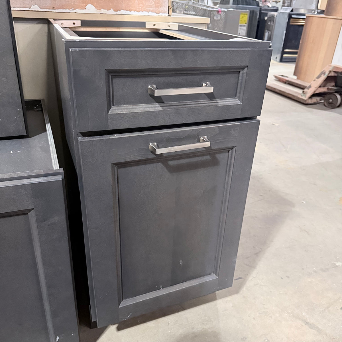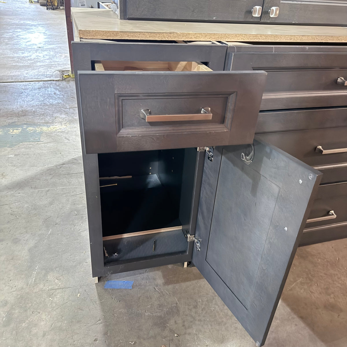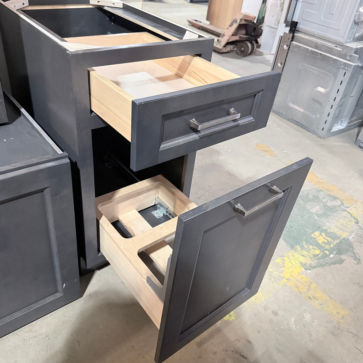 - Trash/recycling bin pull-out compartment in one of the bases