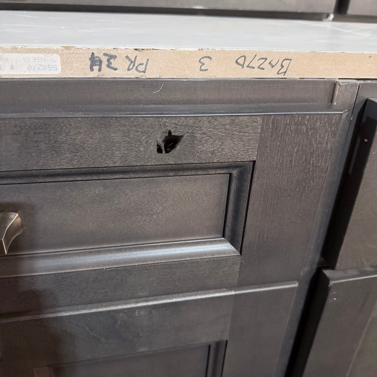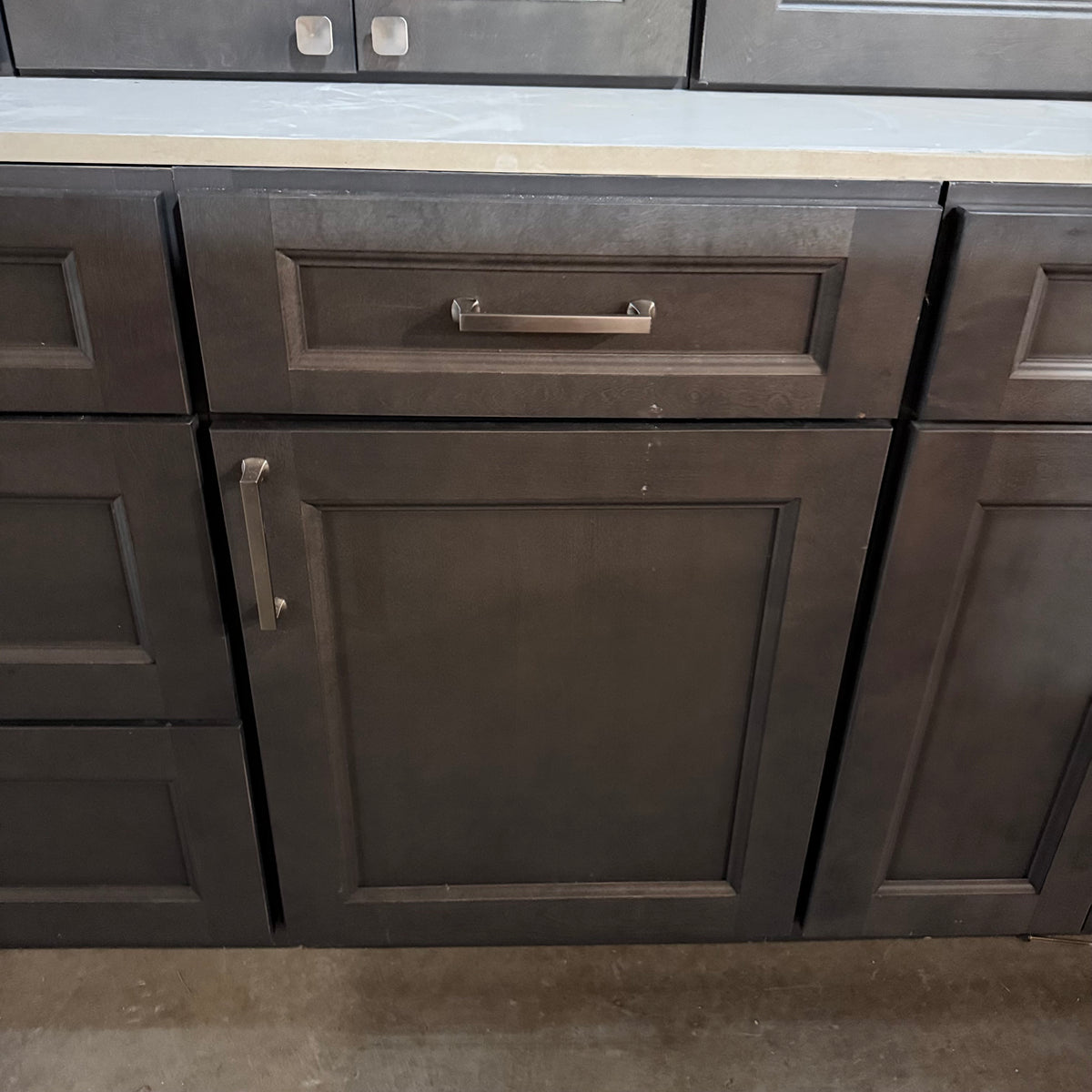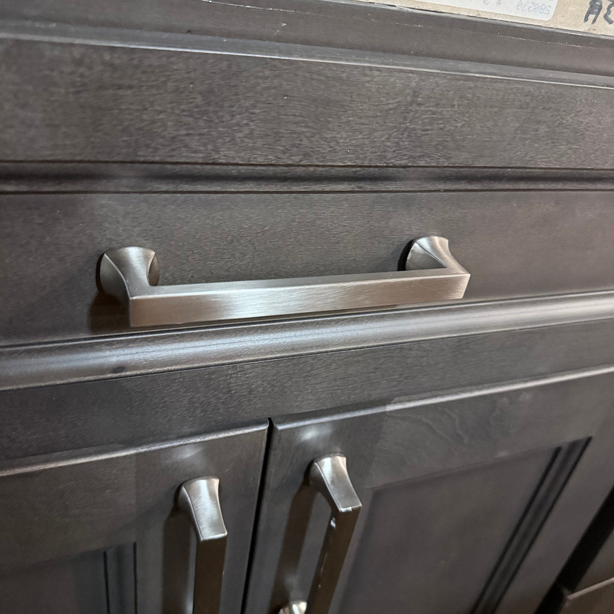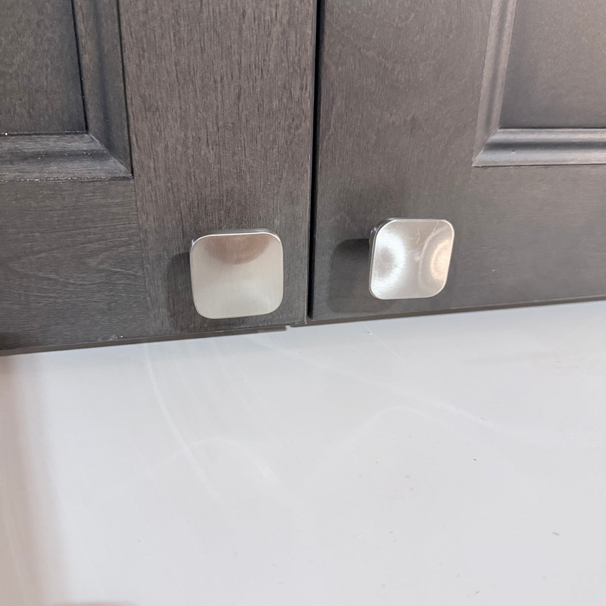 - Nickel brushed pulls and square knobs