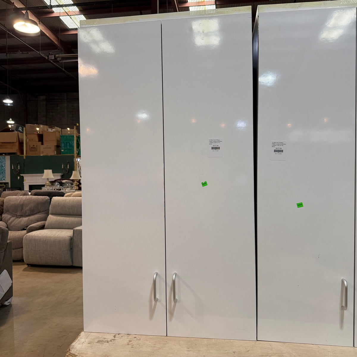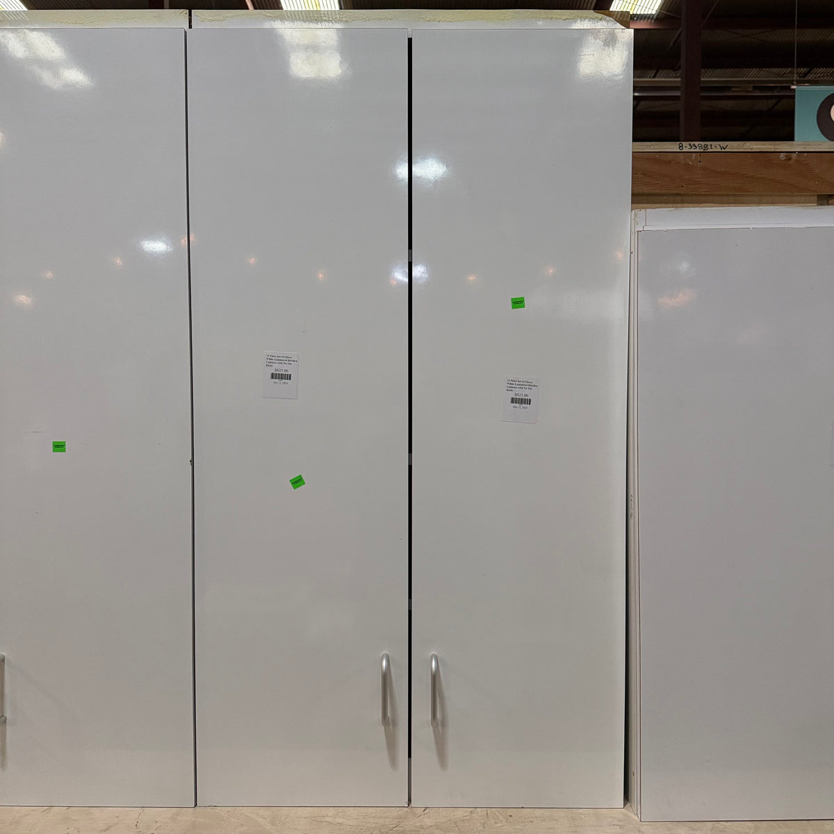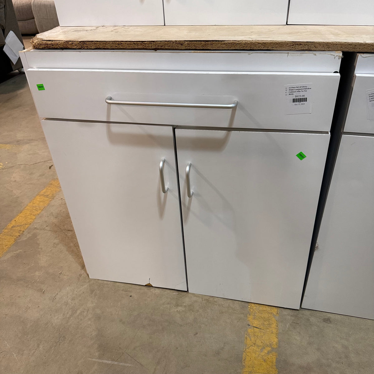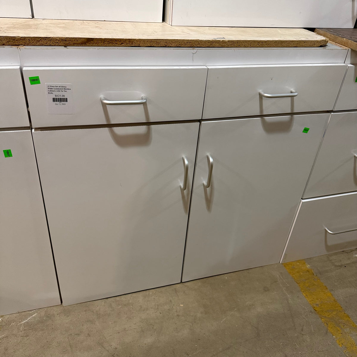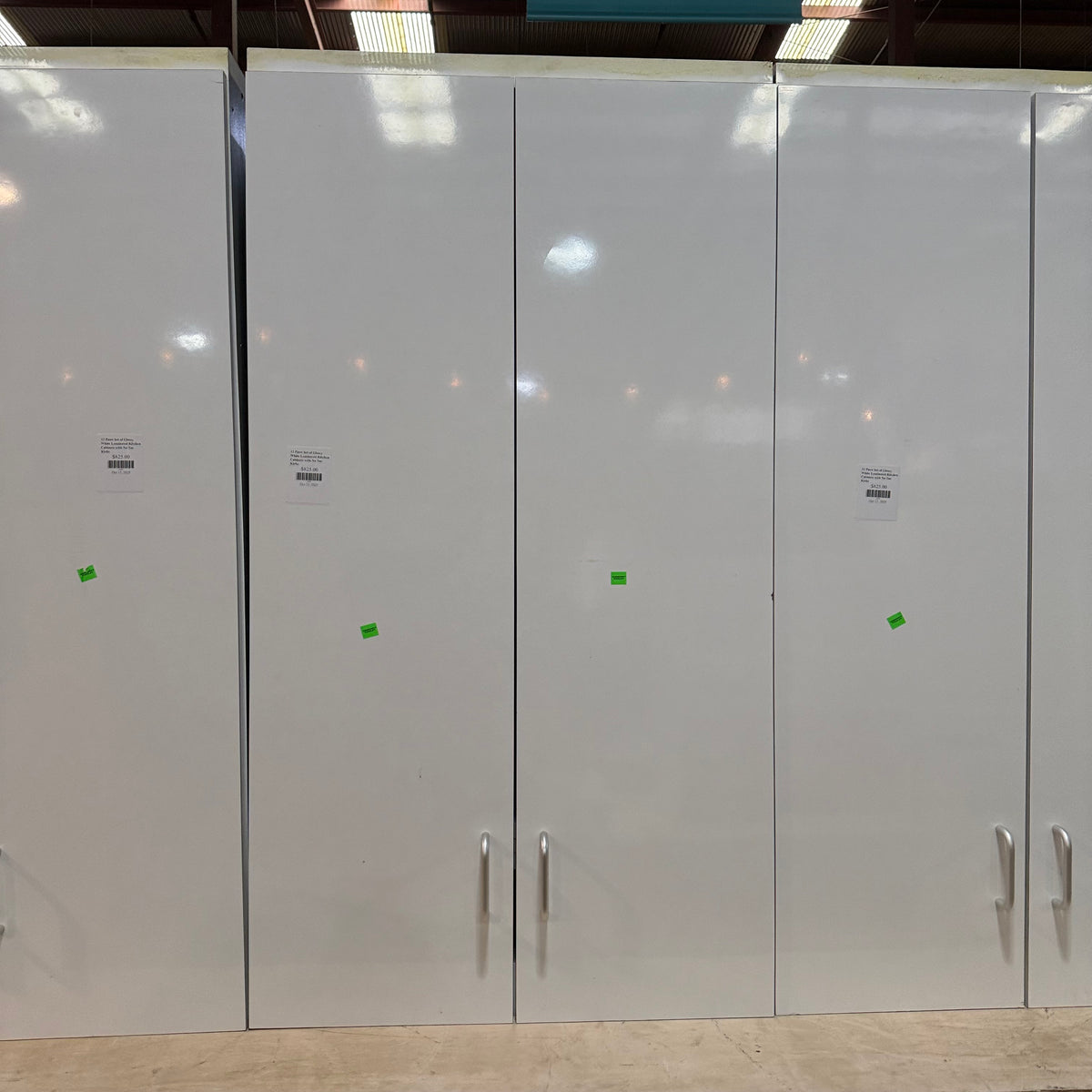 This 12 piece set of glossy white laminated kitchen cabinets features: