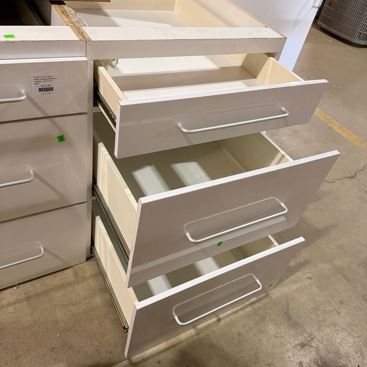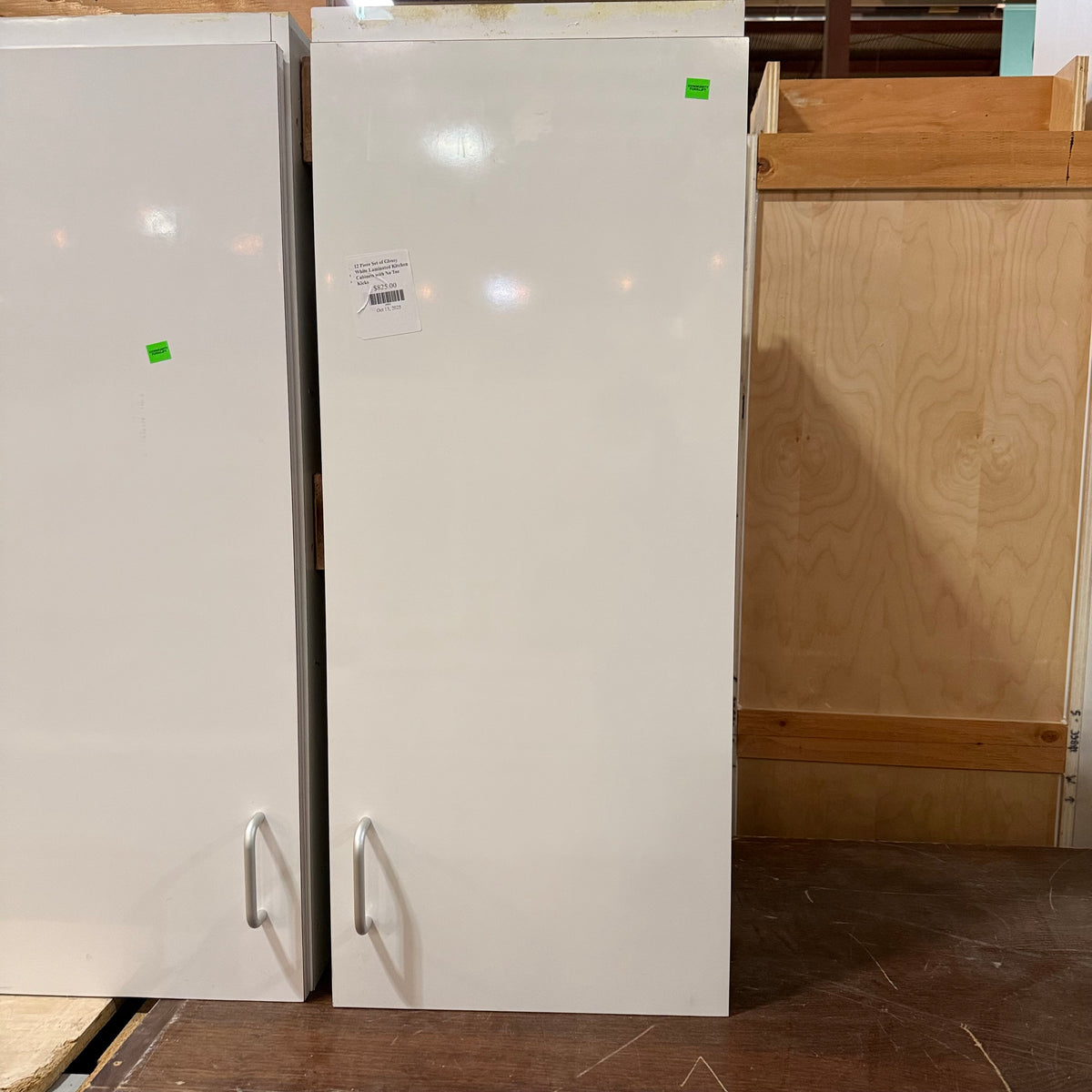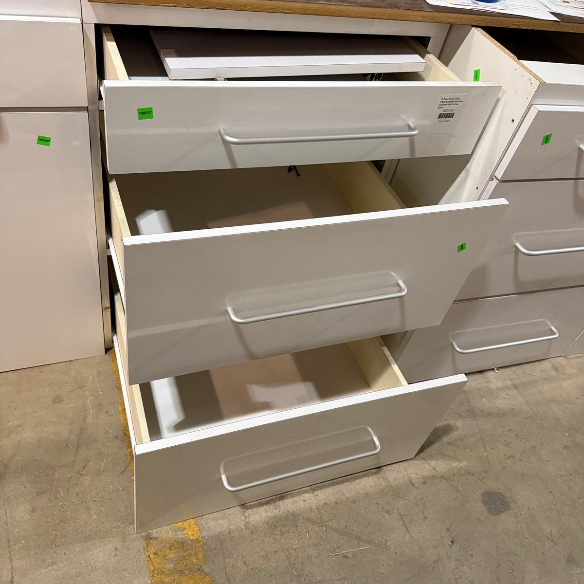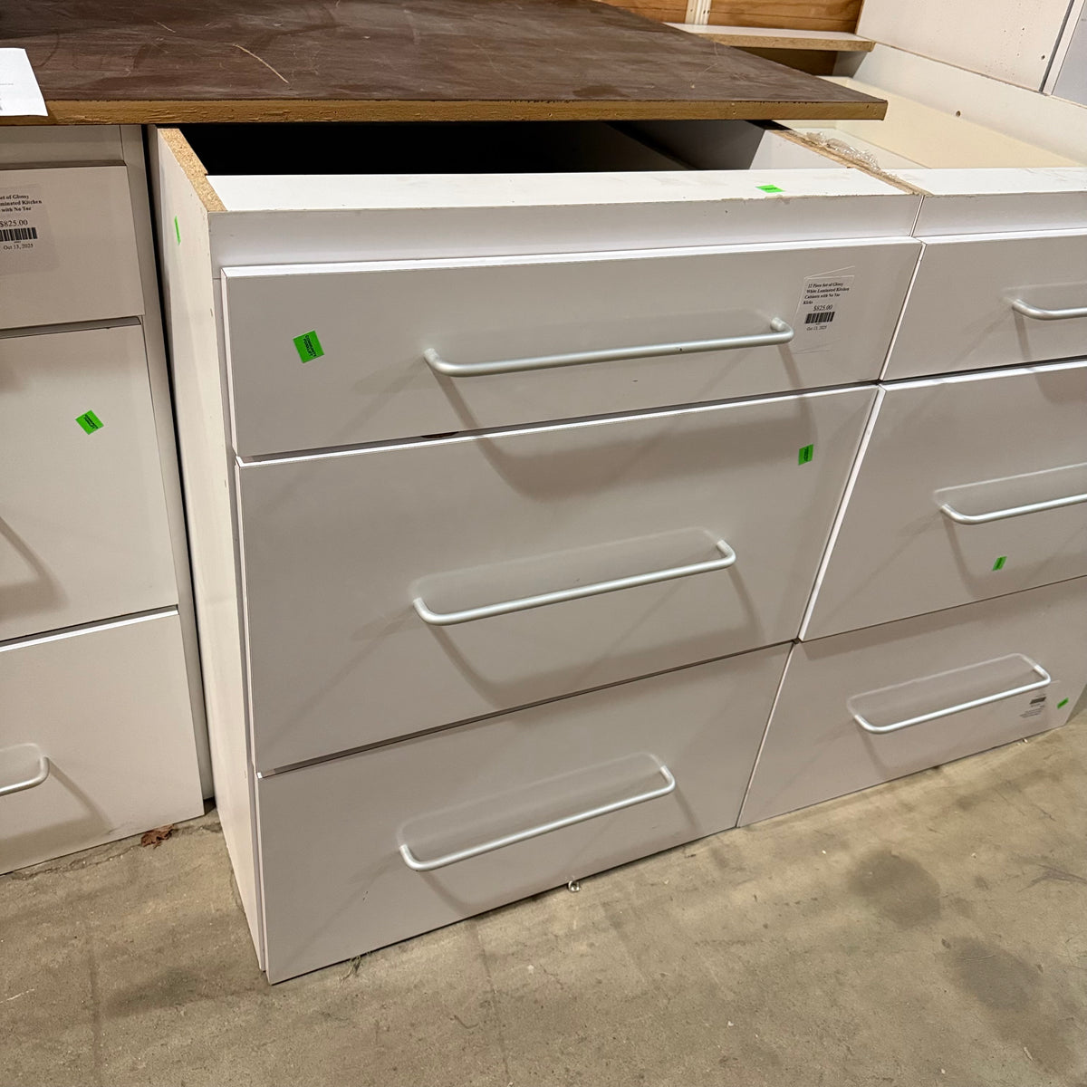 This 12 piece set of glossy white laminated kitchen cabinets features: