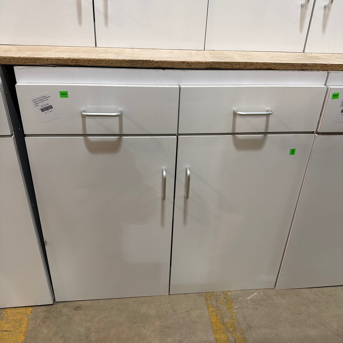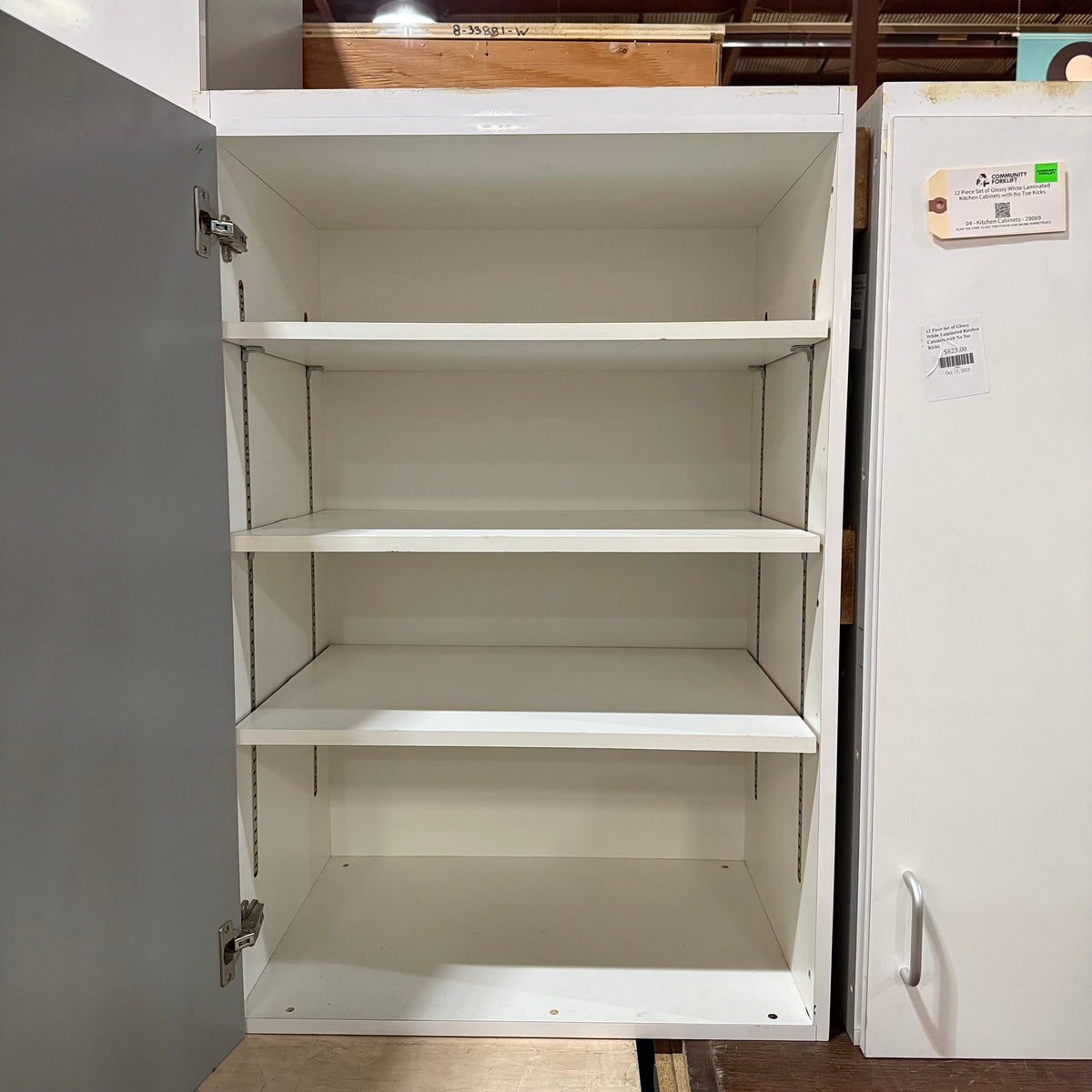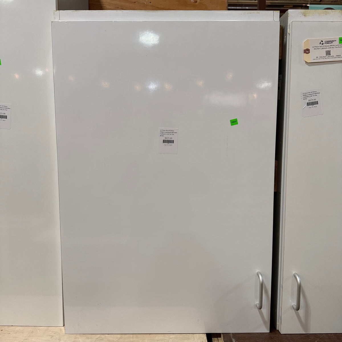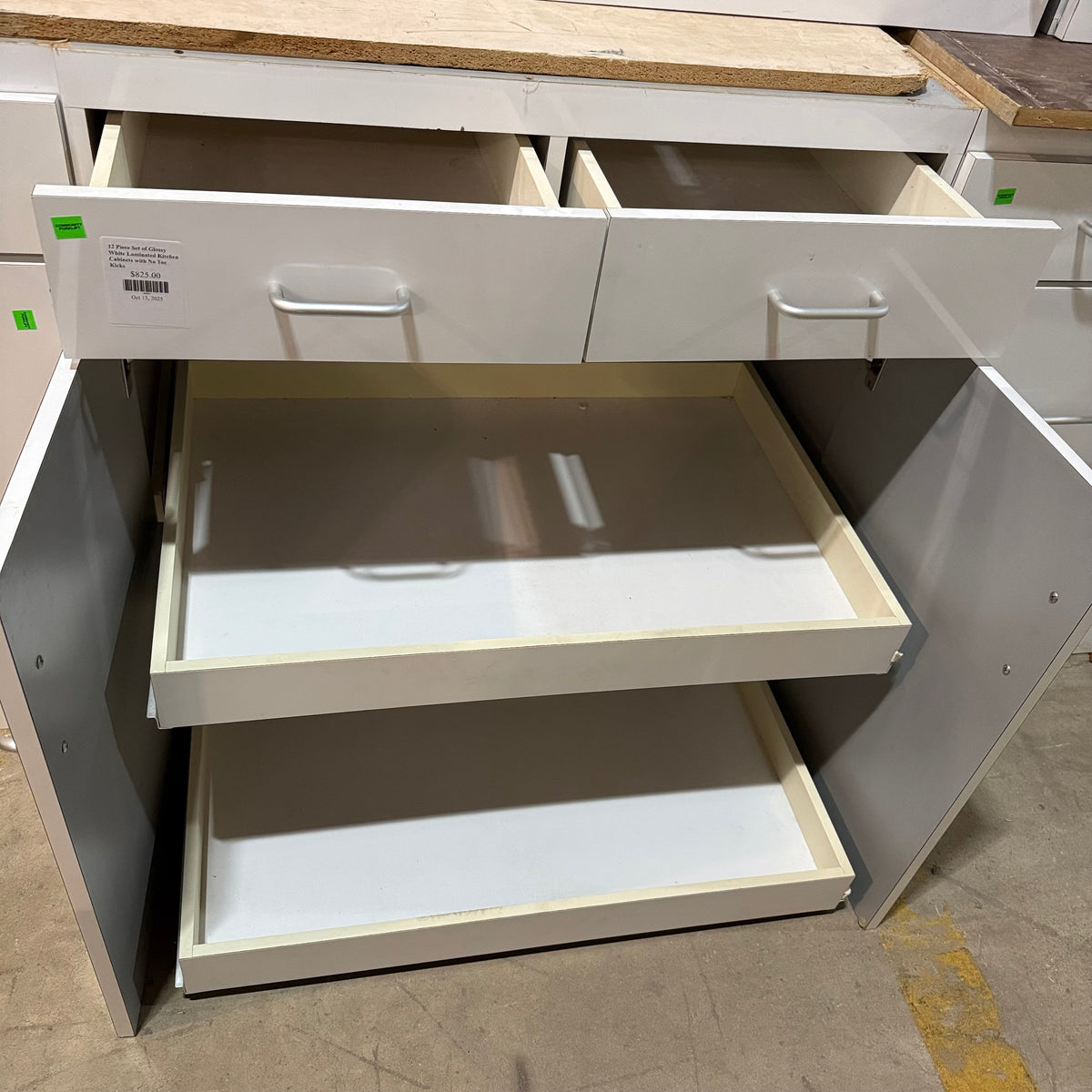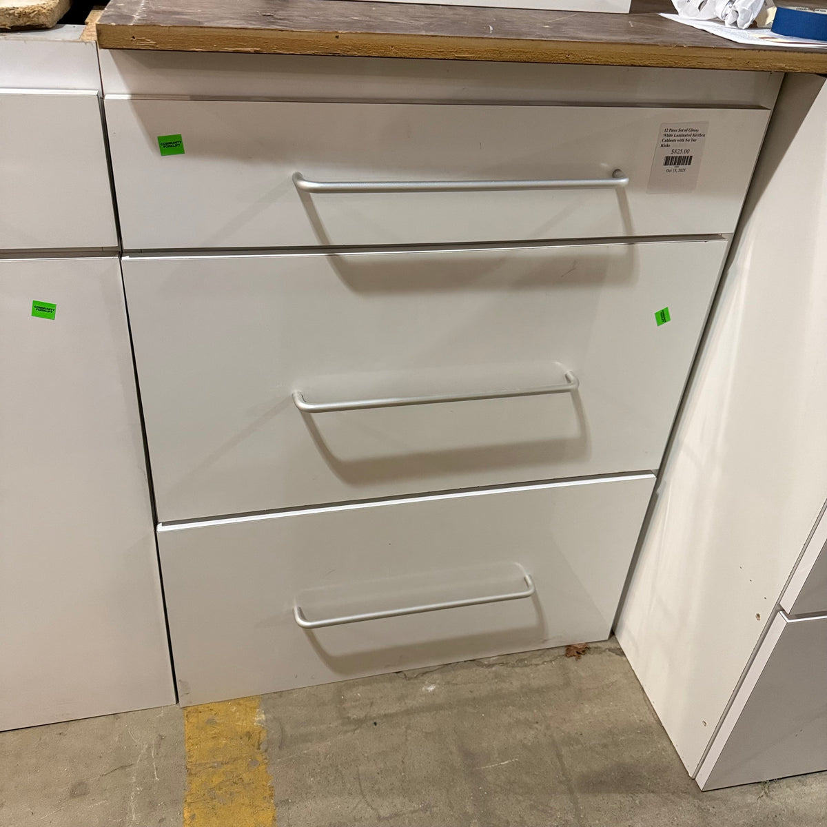 This 12 piece set of glossy white laminated kitchen cabinets features: