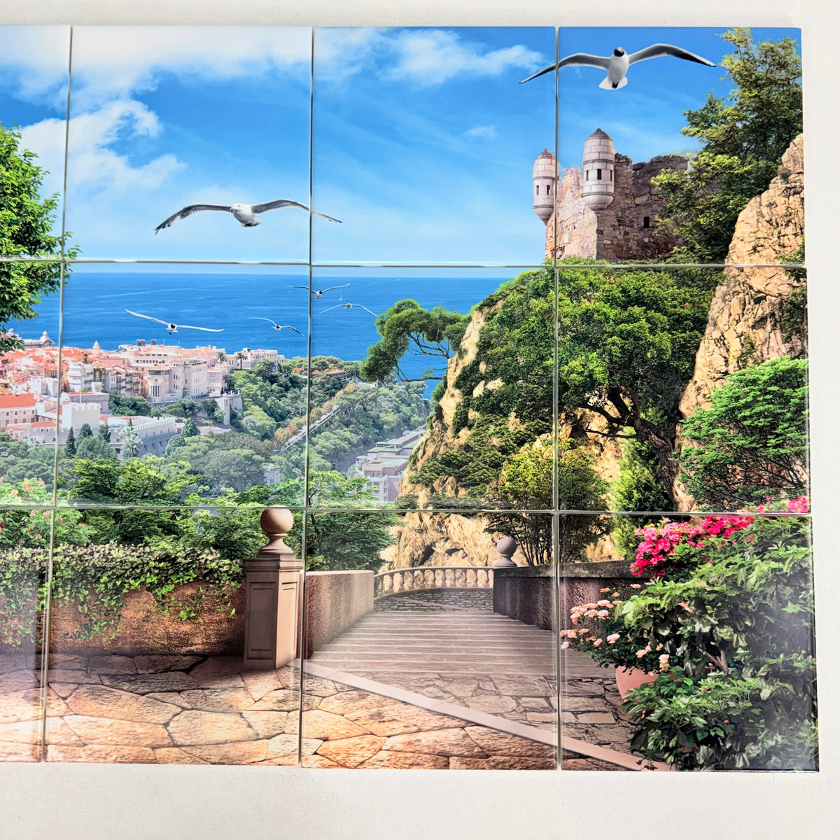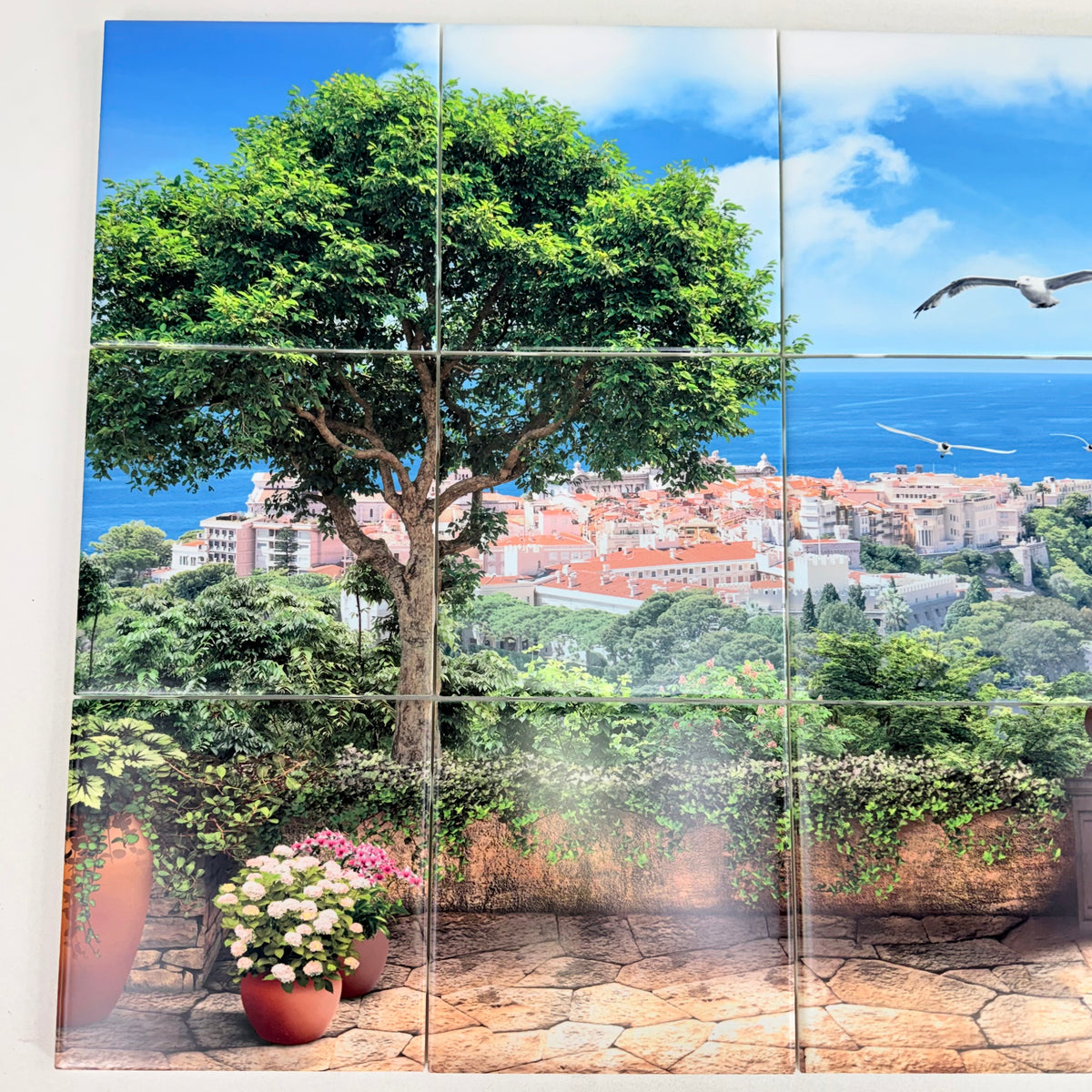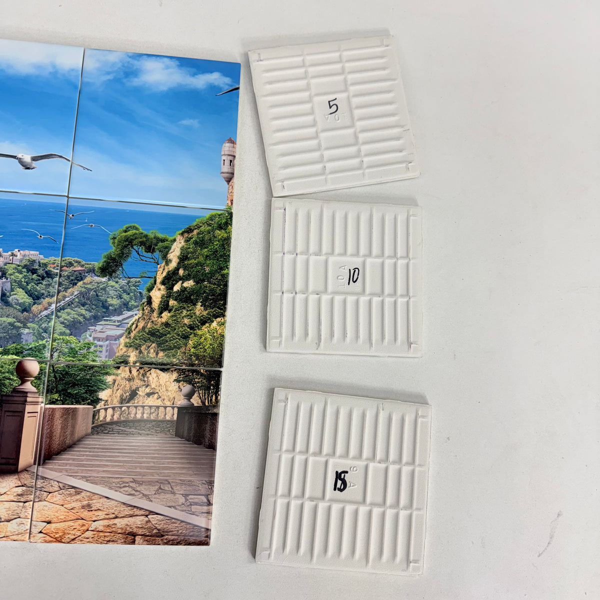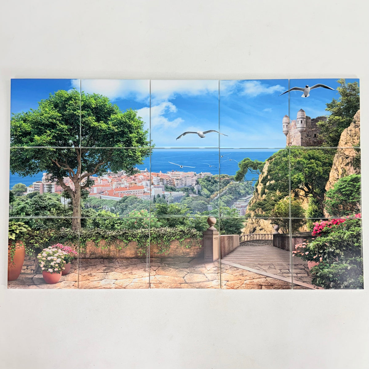 This is a new, in open-box 15-piece tile mural of a Mediterranean-style coastal landscape overlooking a seaside town. Each tile is marked on the back in numerical order and each measures 6 inches by 6 inches. The tiles are made of ceramic and in a satin finish.