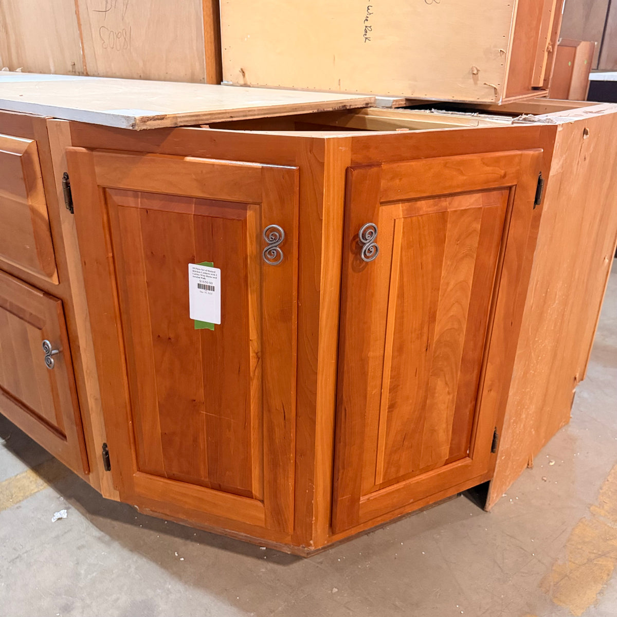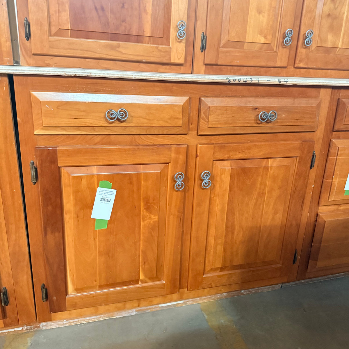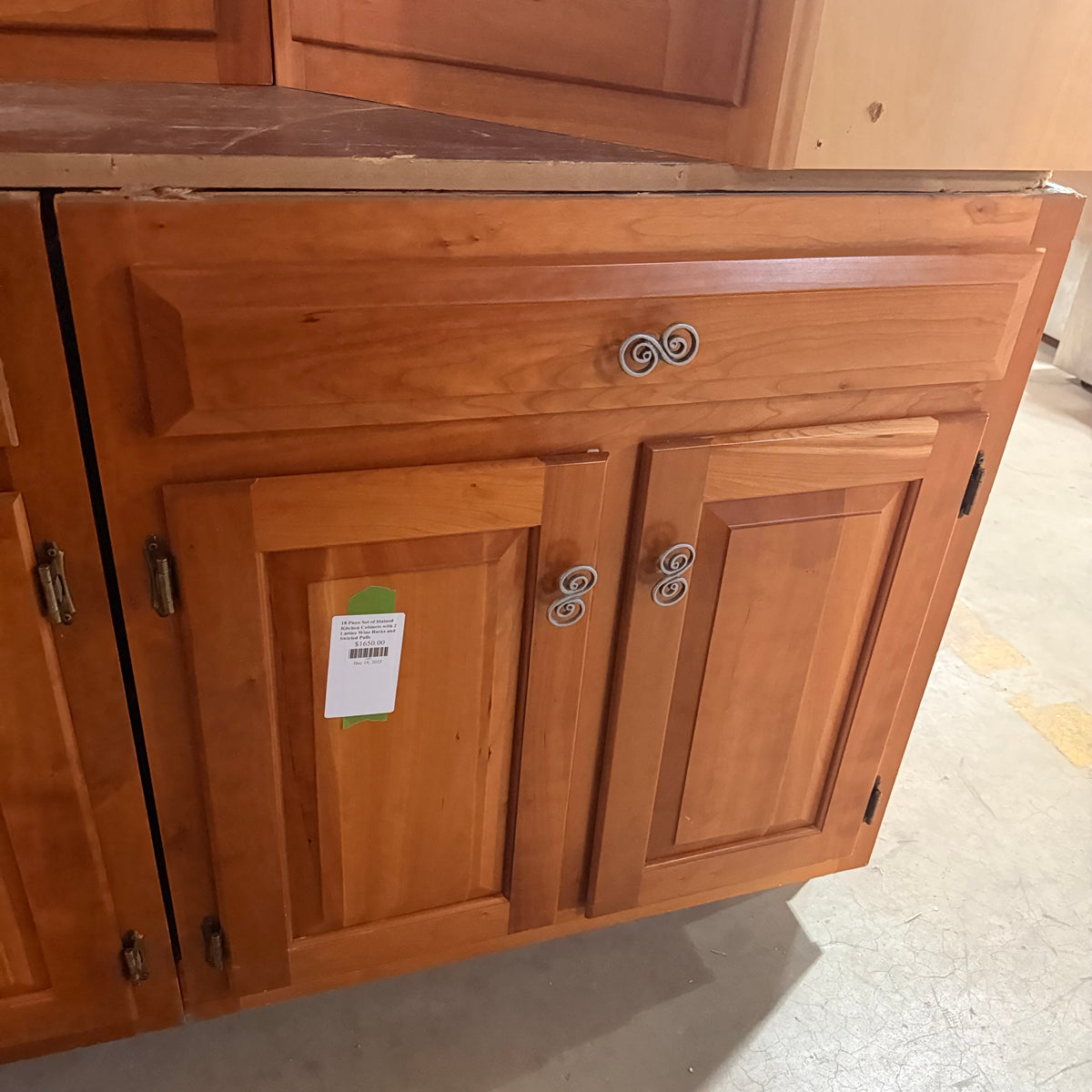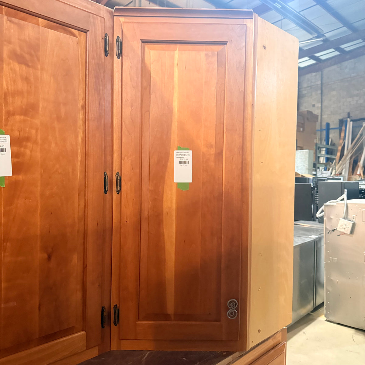 This 18 piece set of stained kitchen cabinets features: