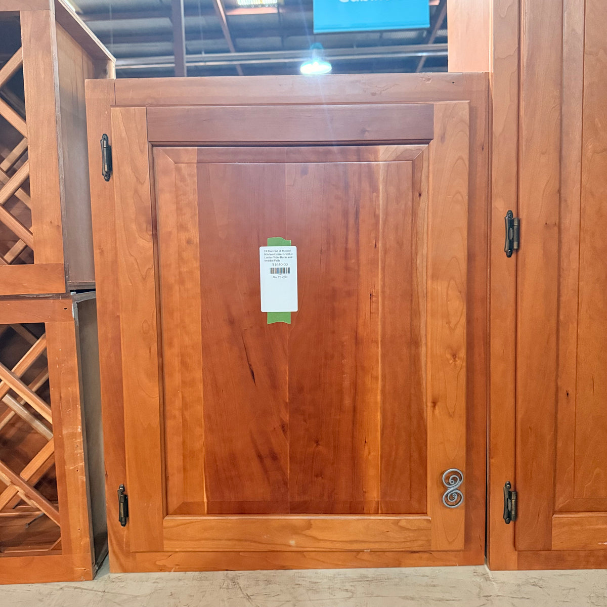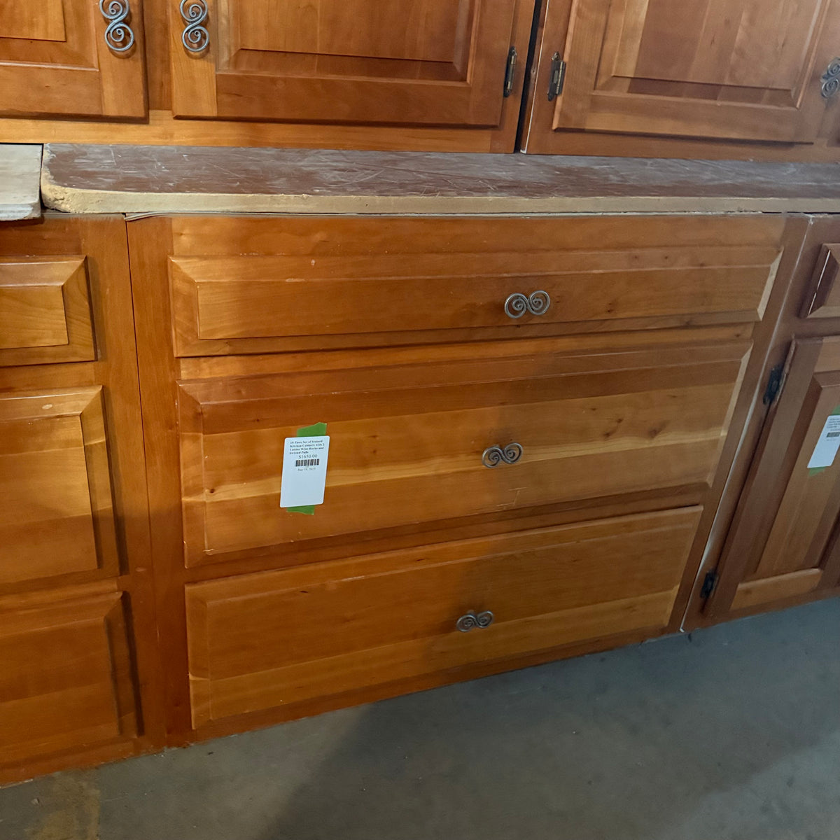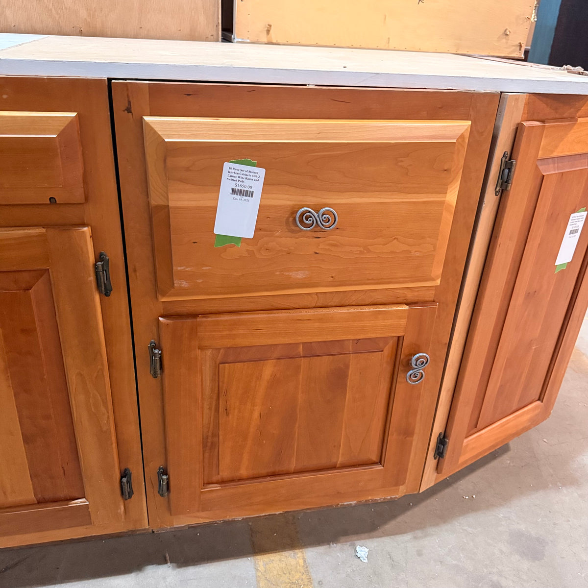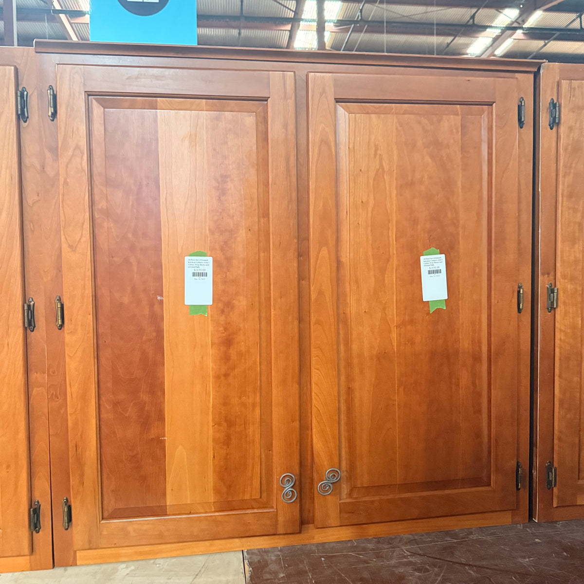This 18 piece set of stained kitchen cabinets features: