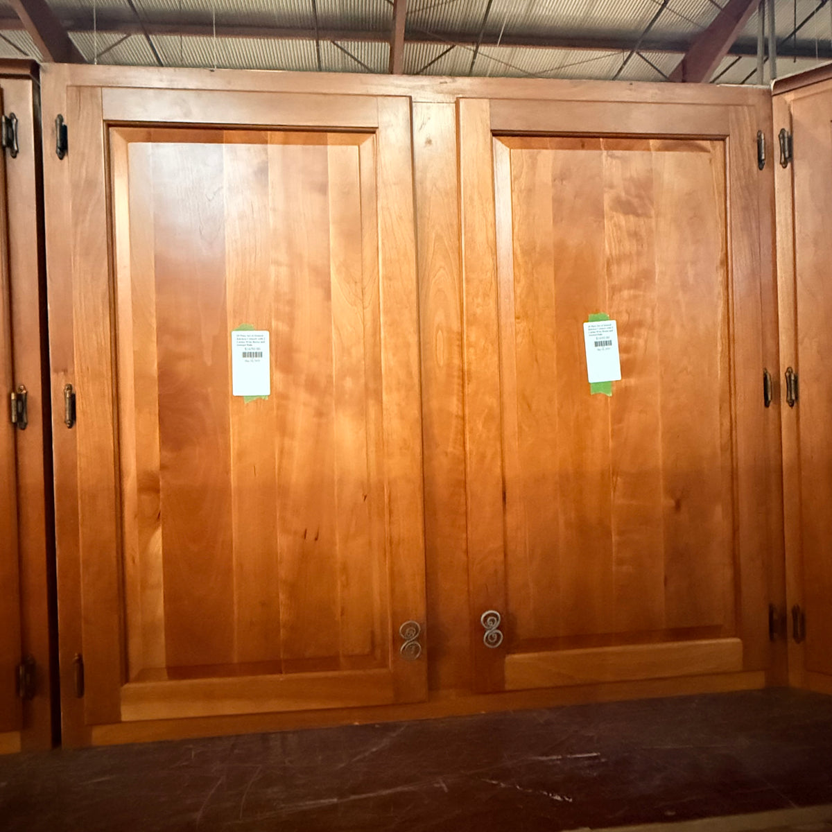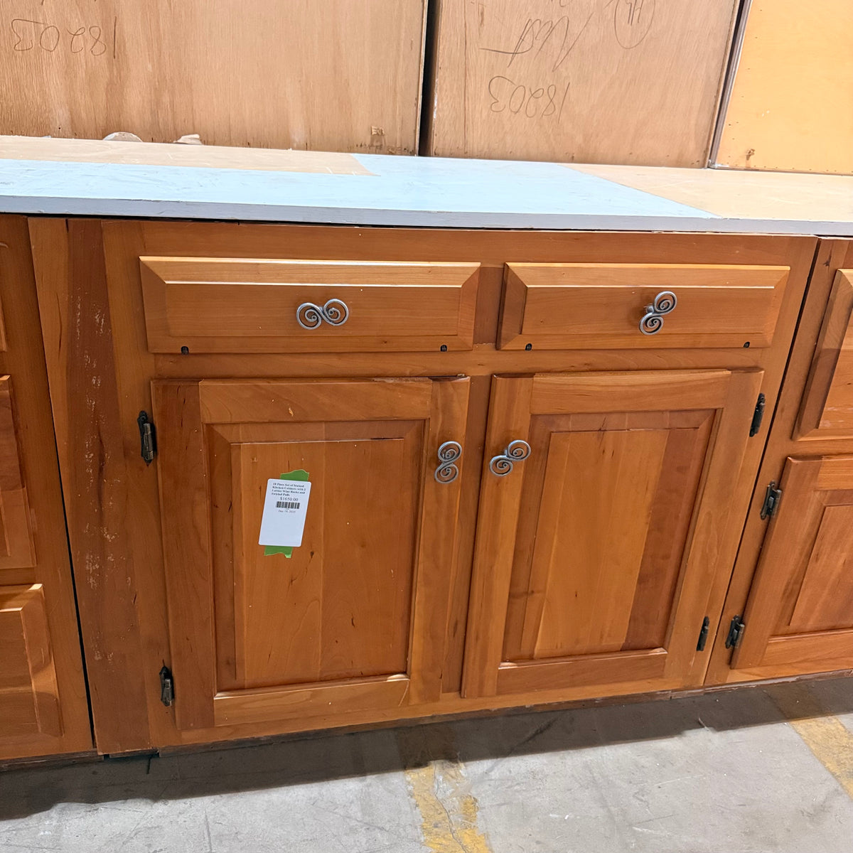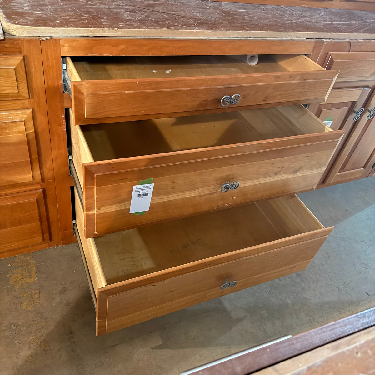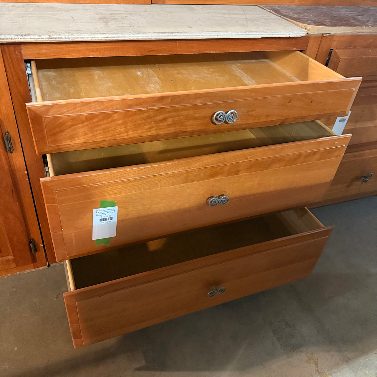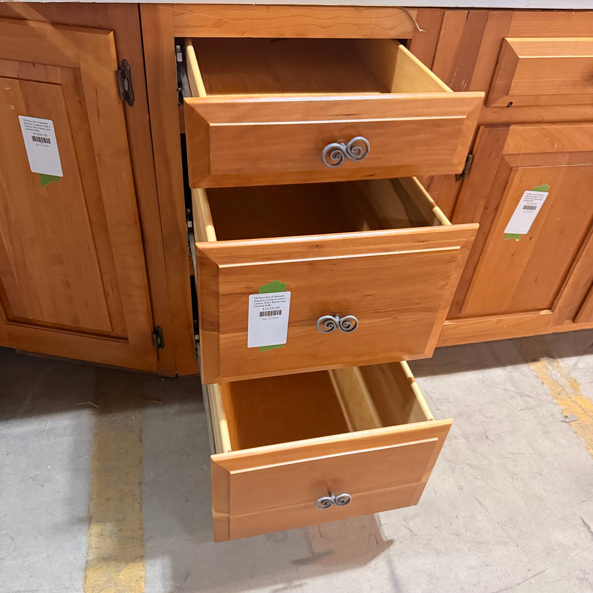 This 18 piece set of stained kitchen cabinets features: