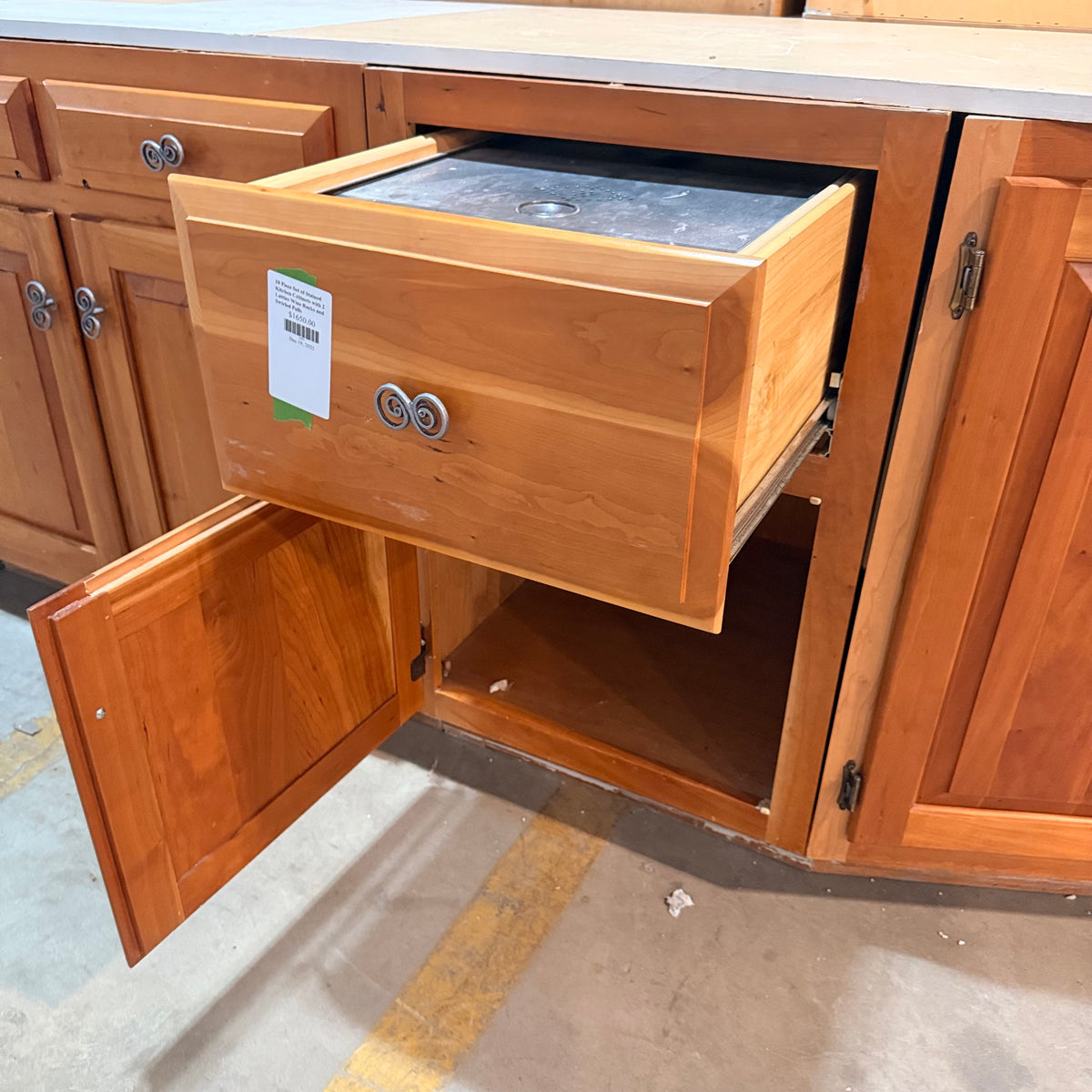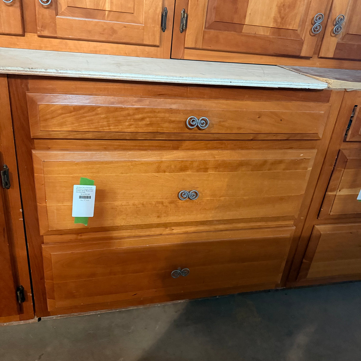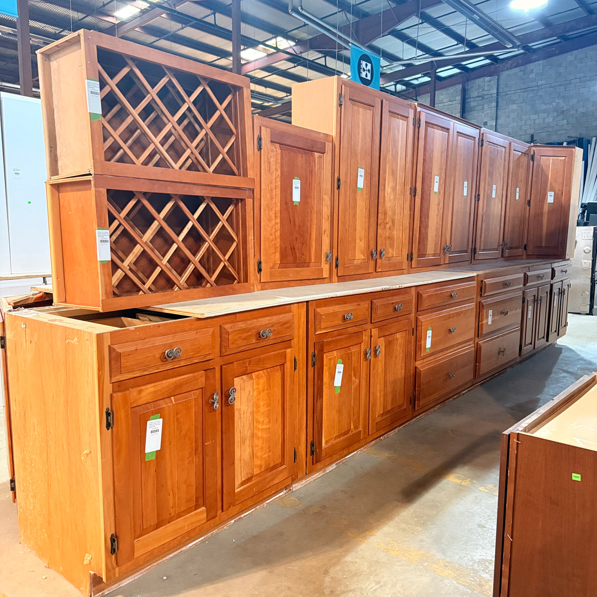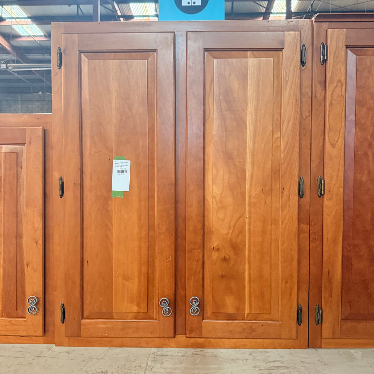This 18 piece set of stained kitchen cabinets features: