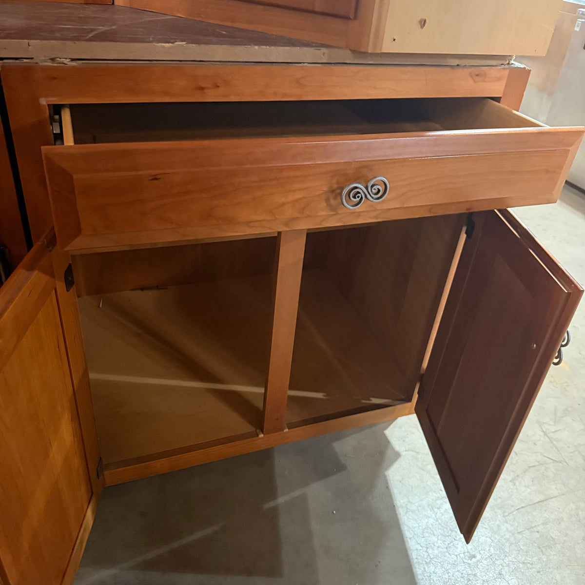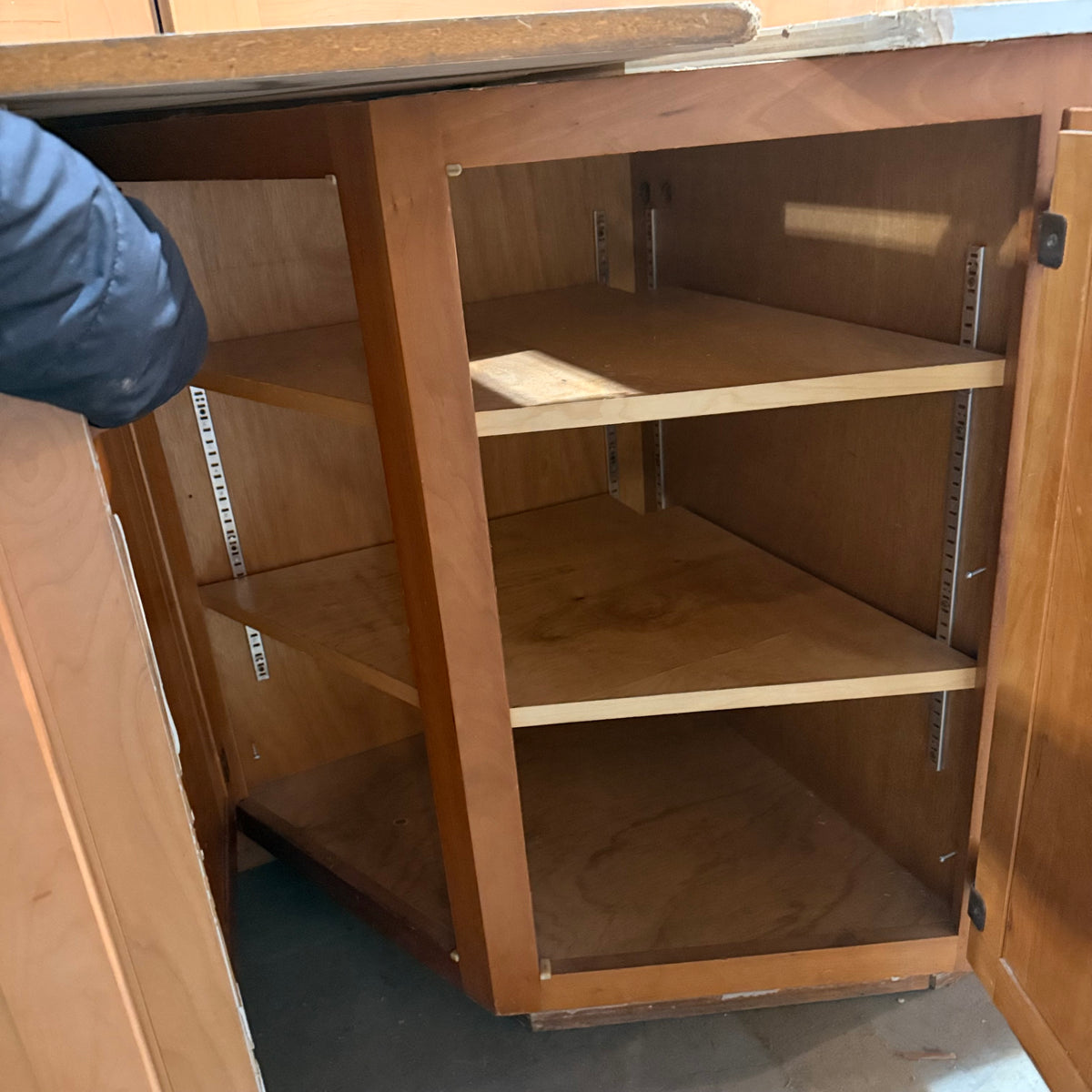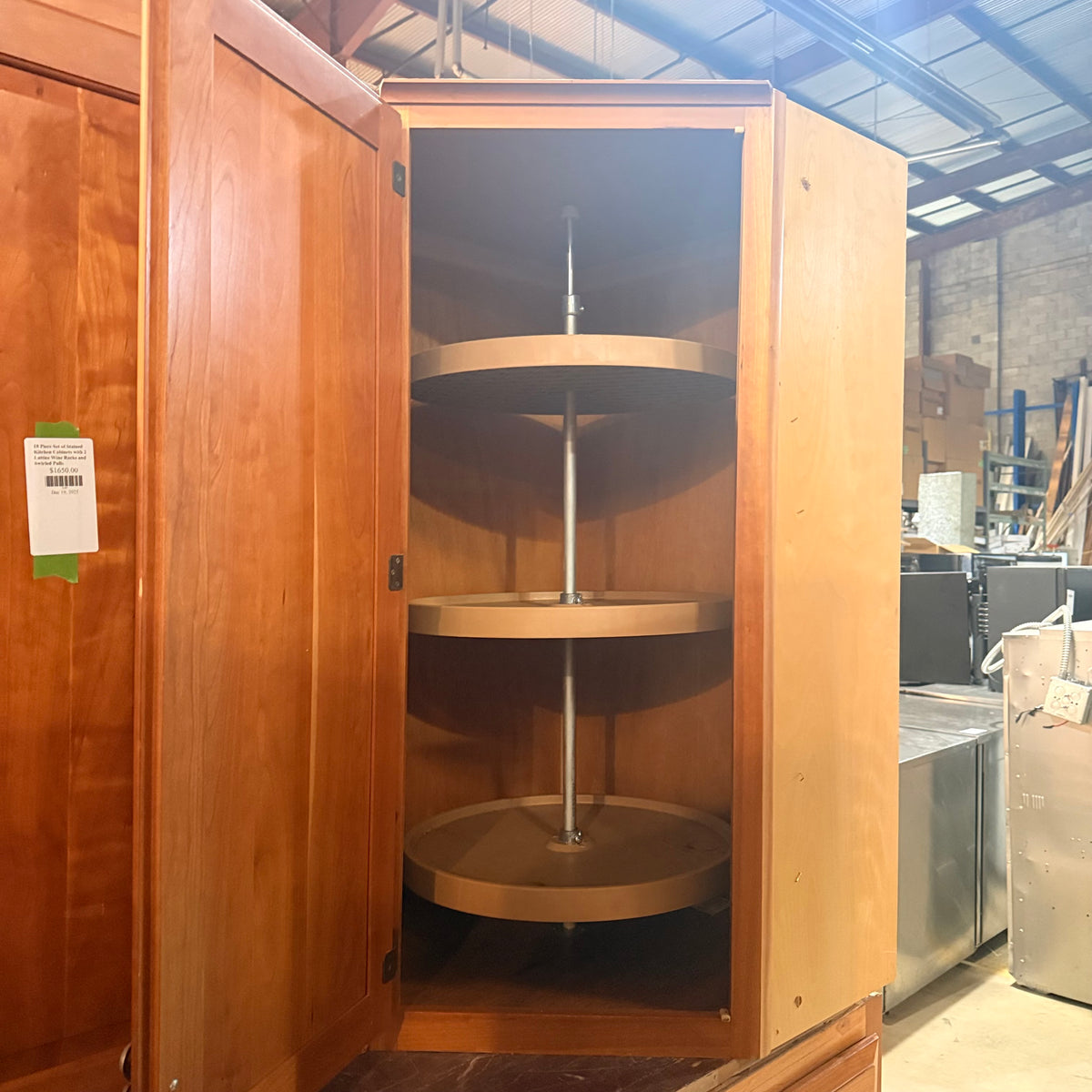 - Upper corner cabinet with tiered, lazy Susan shelving