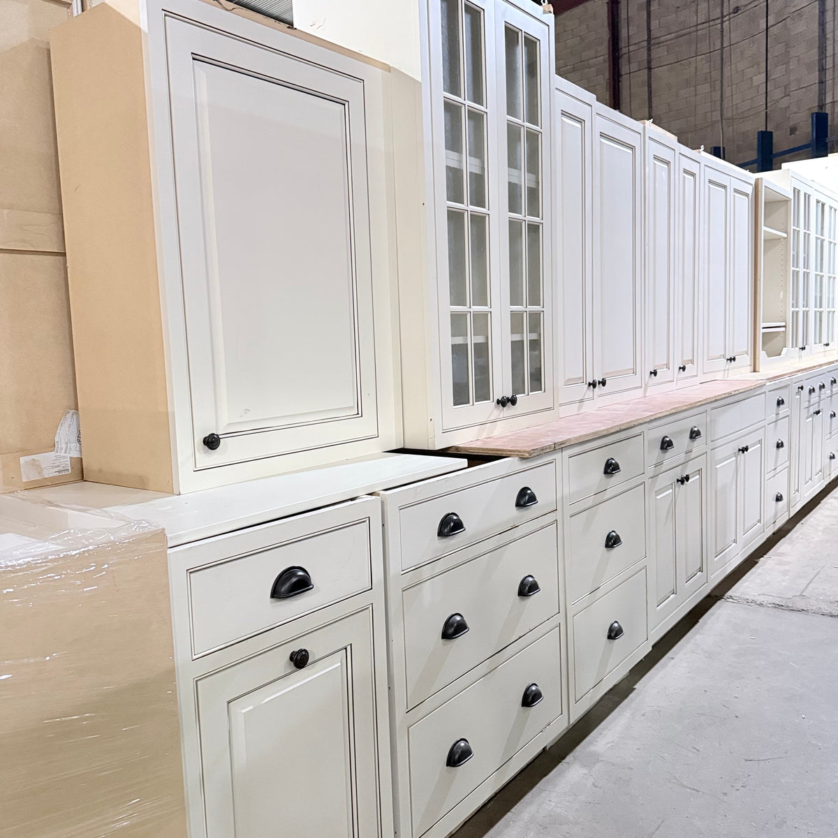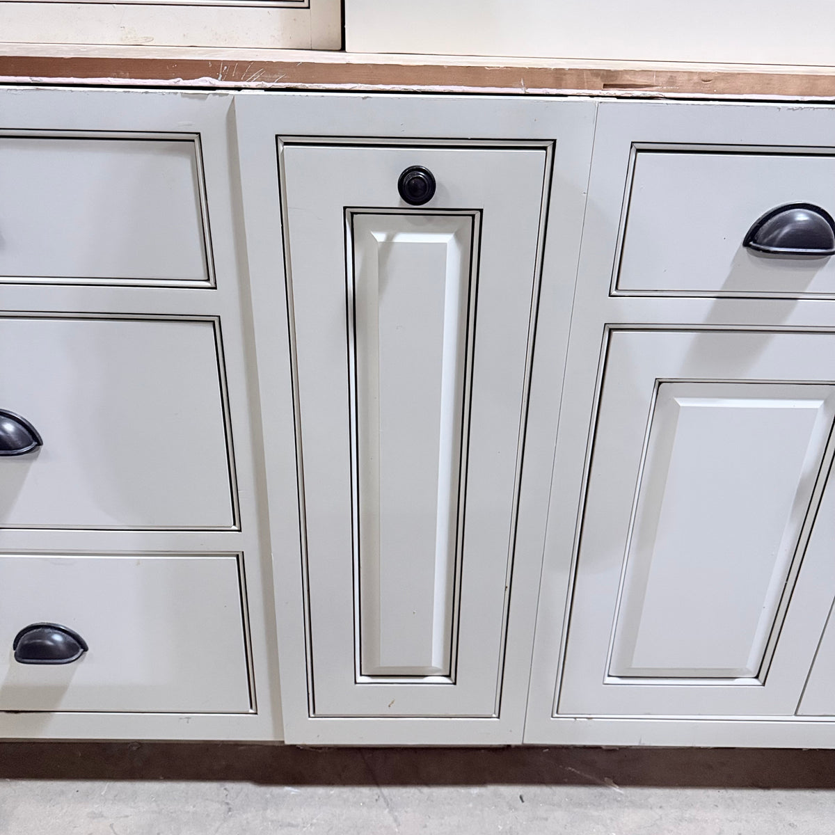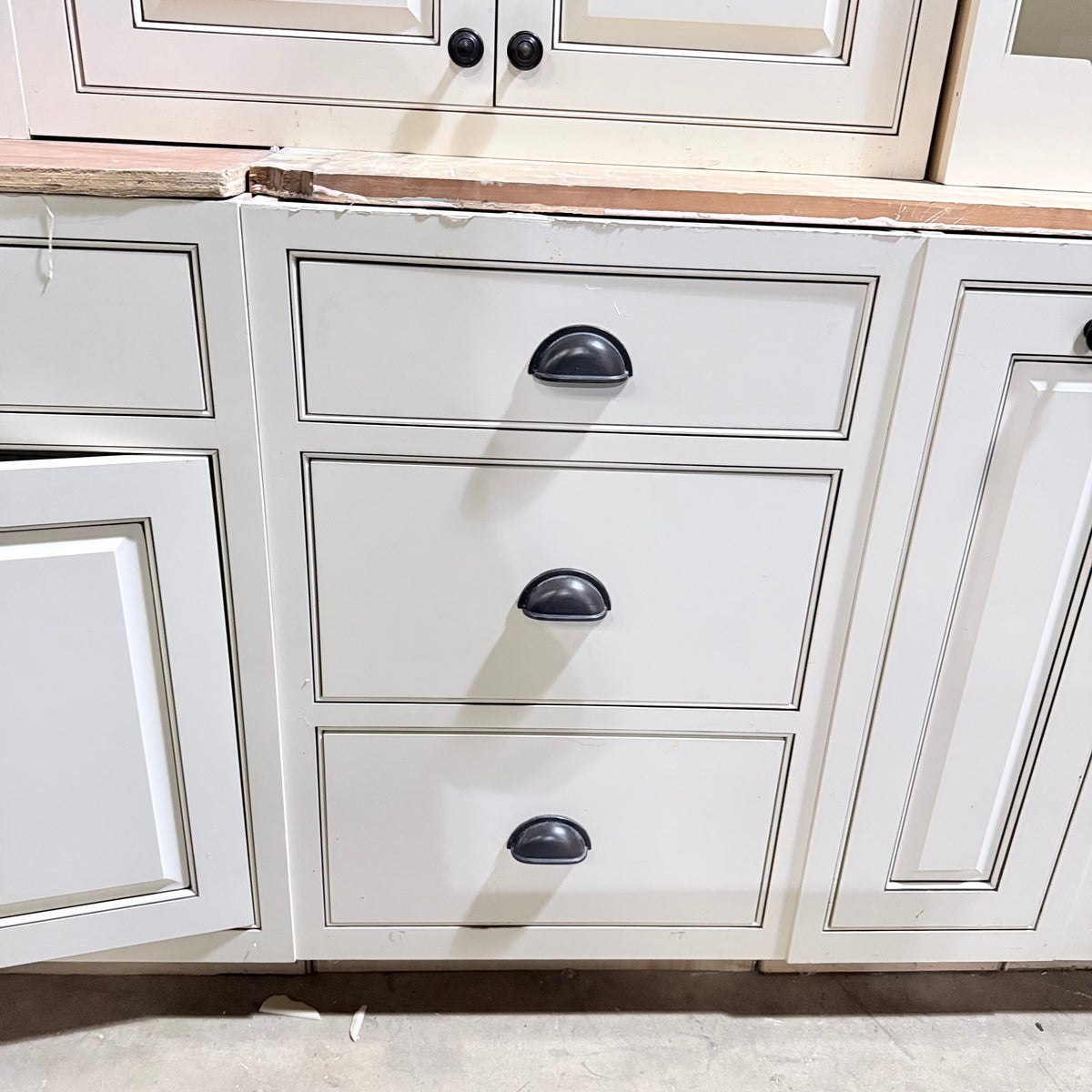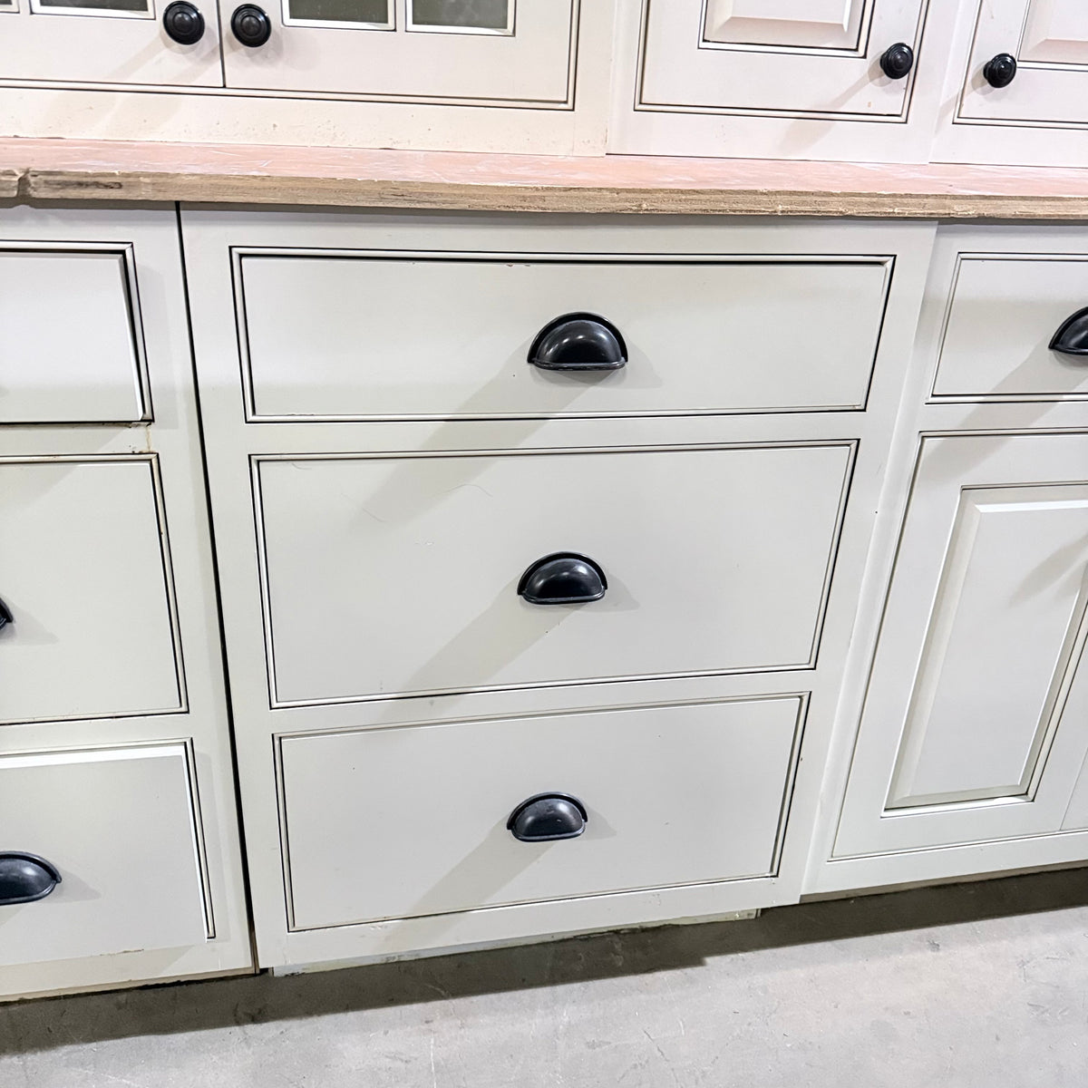 This 22 piece set of off-white kitchen cabinets features: