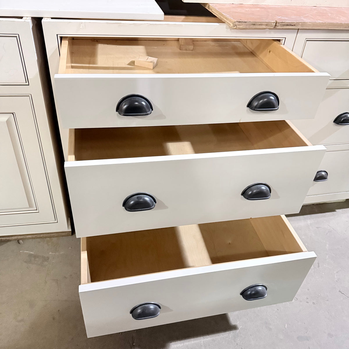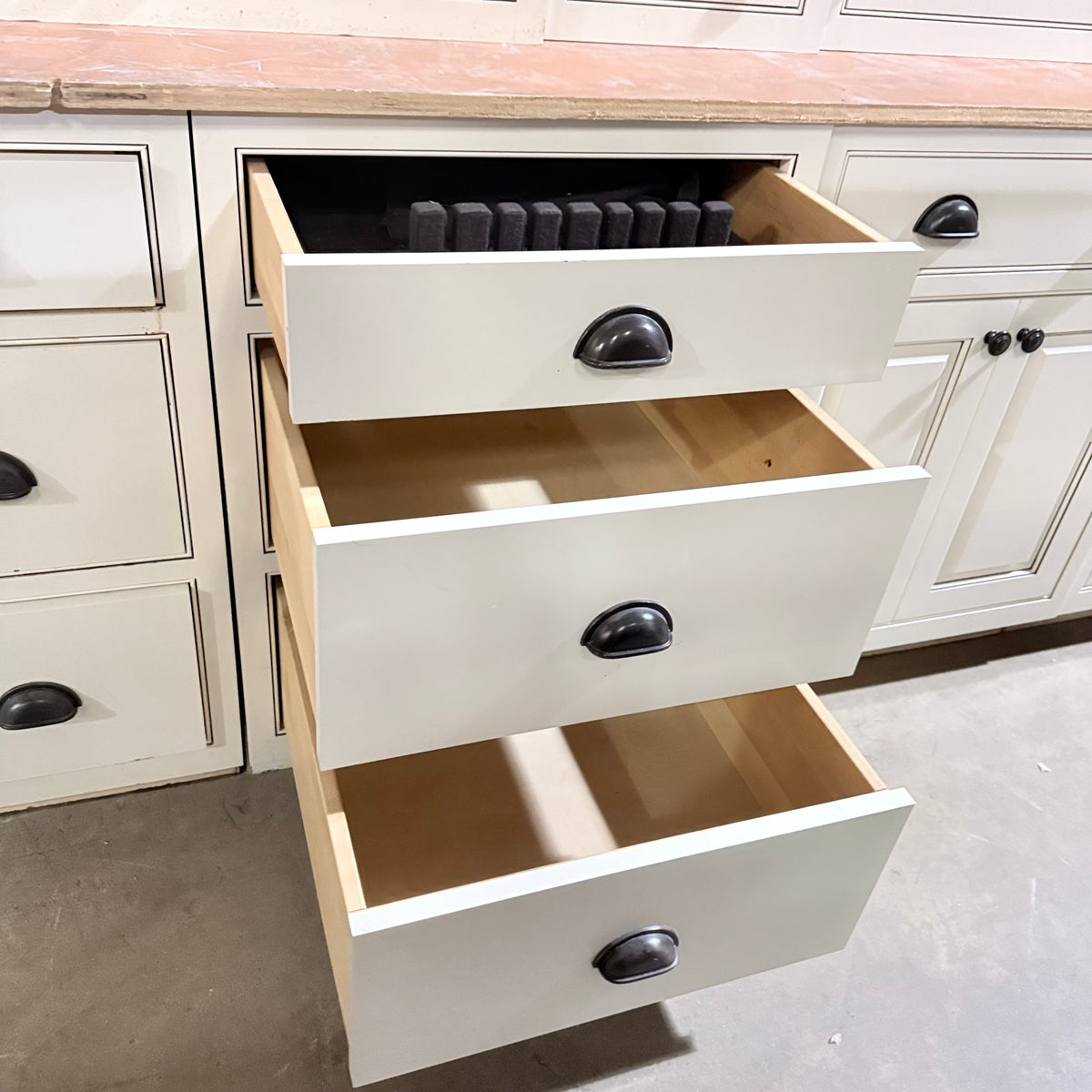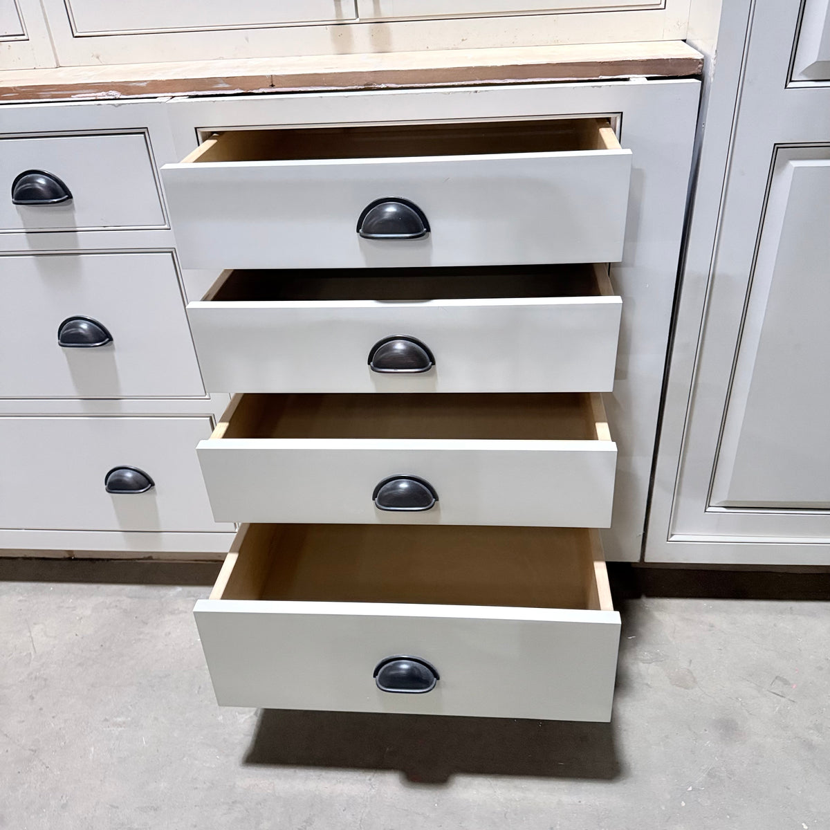 - Inset cabinet doors and drawers creating a flush, clean look to the front of the cabinetry when closed