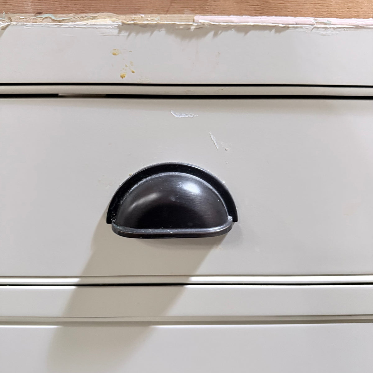 - Antique rubbed bronze finished rounded knobs and cove pulls
