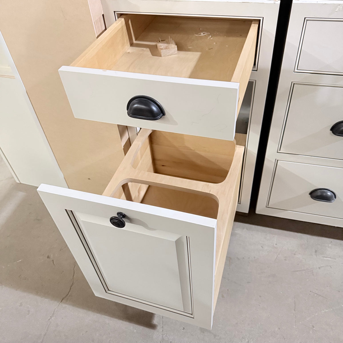 - Trash/recycling bin pull-out compartment in one of the bases