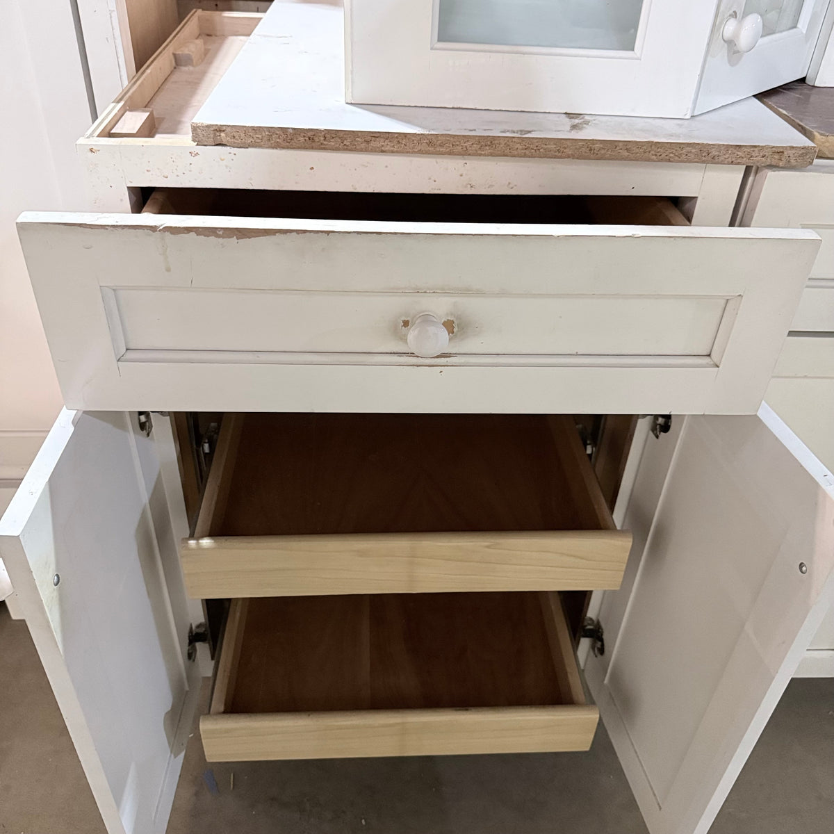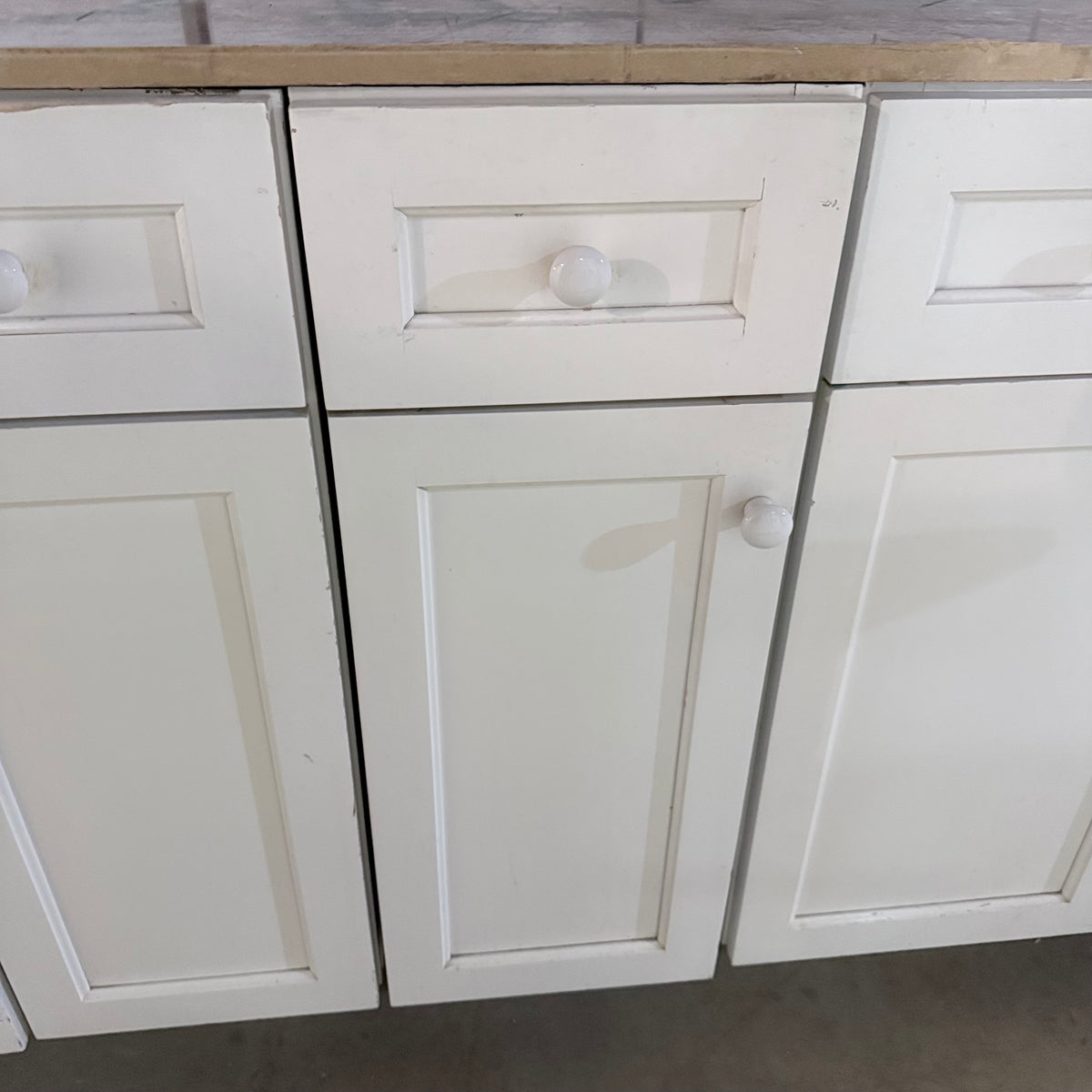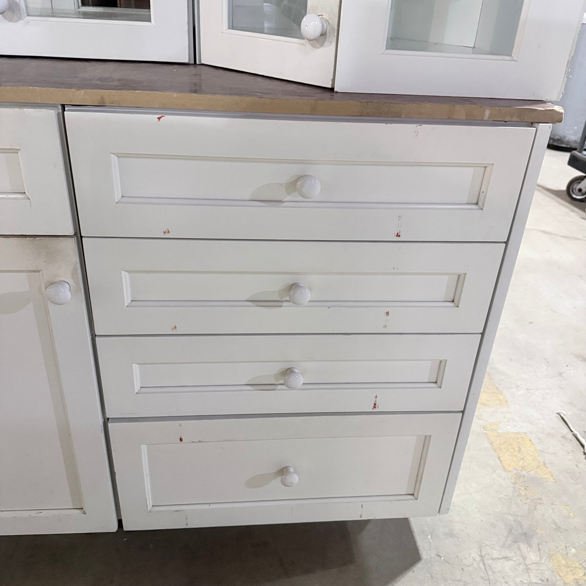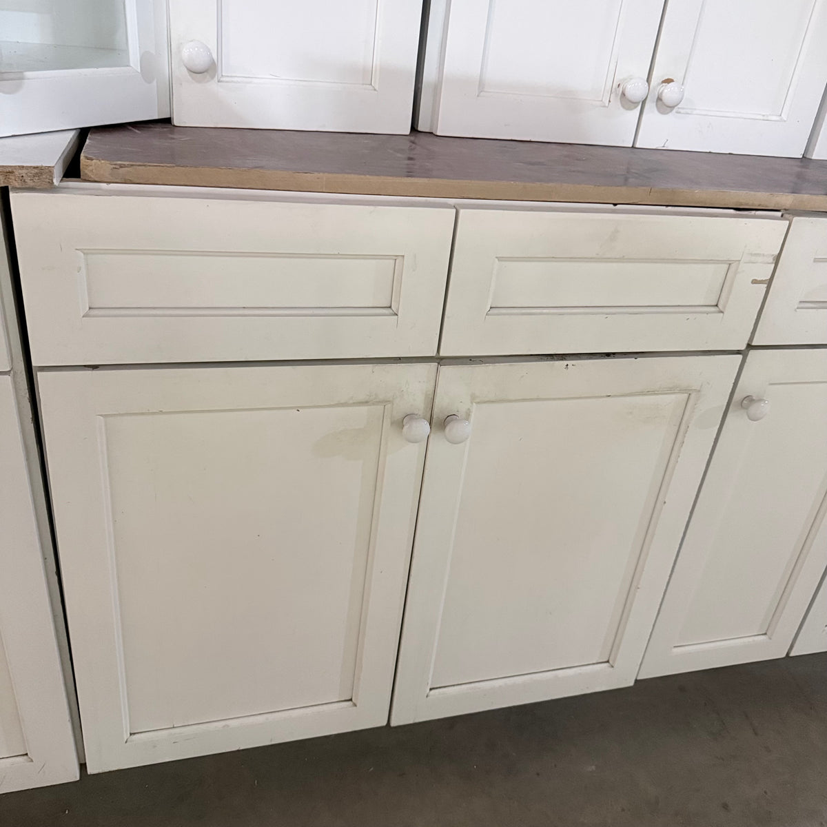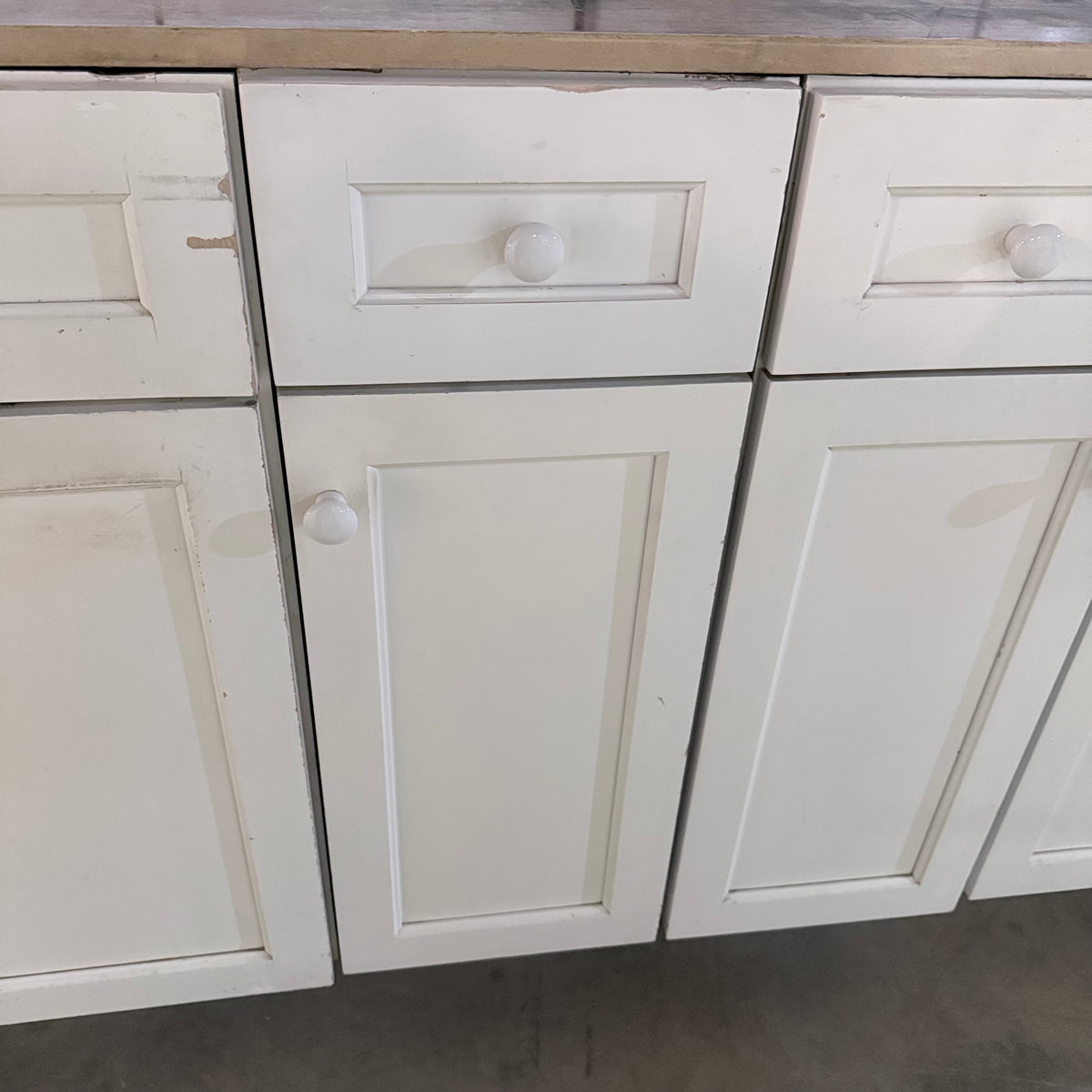 Please note, additional cleaning is recommended for this set. There is an extensive amount of general wear and overall chipping to the paint on this cabinet set (see photos).