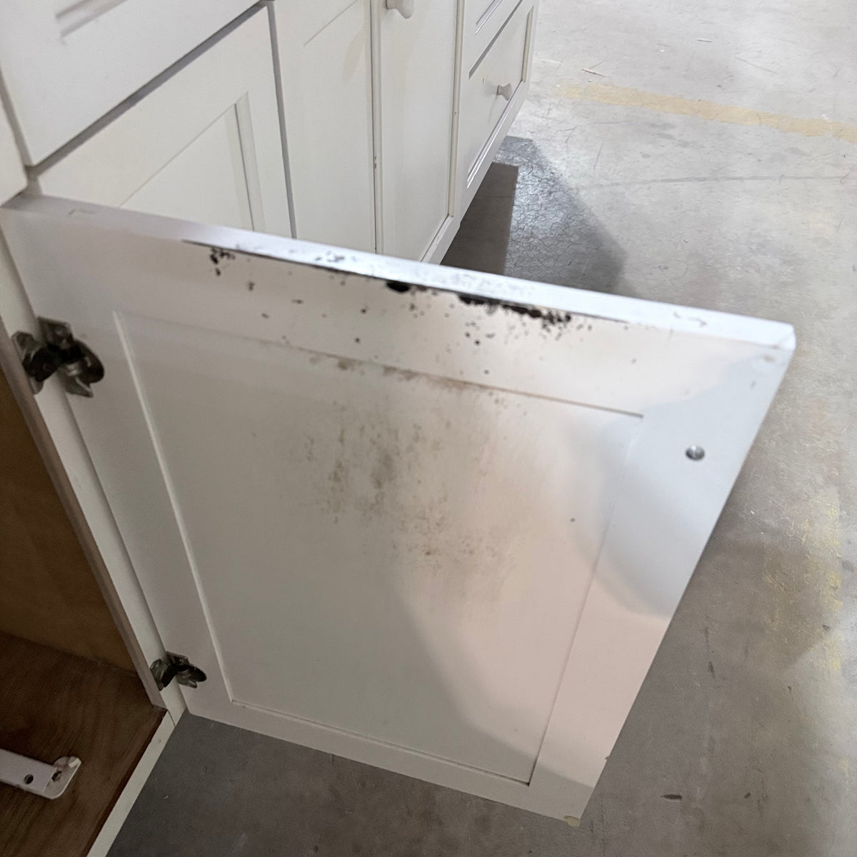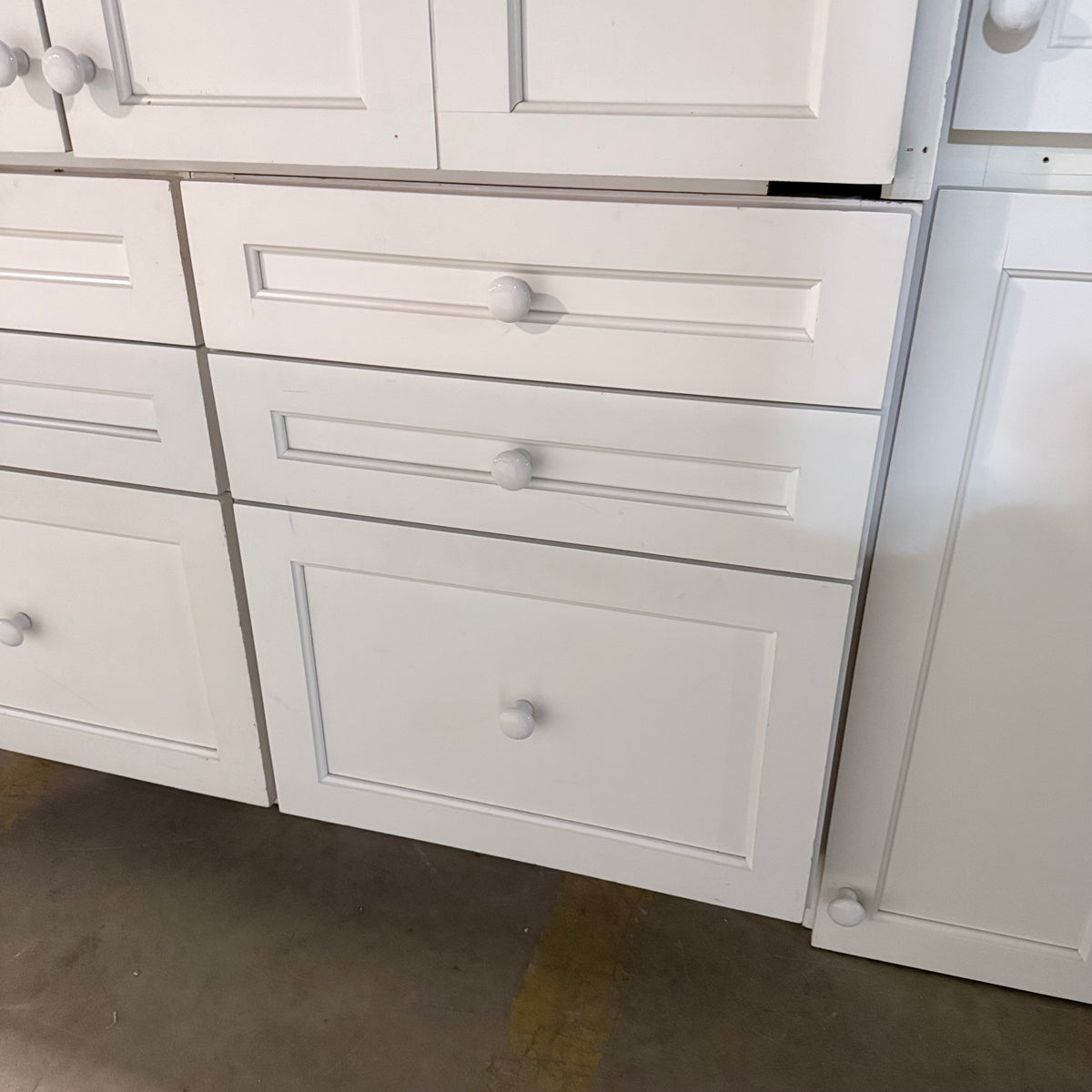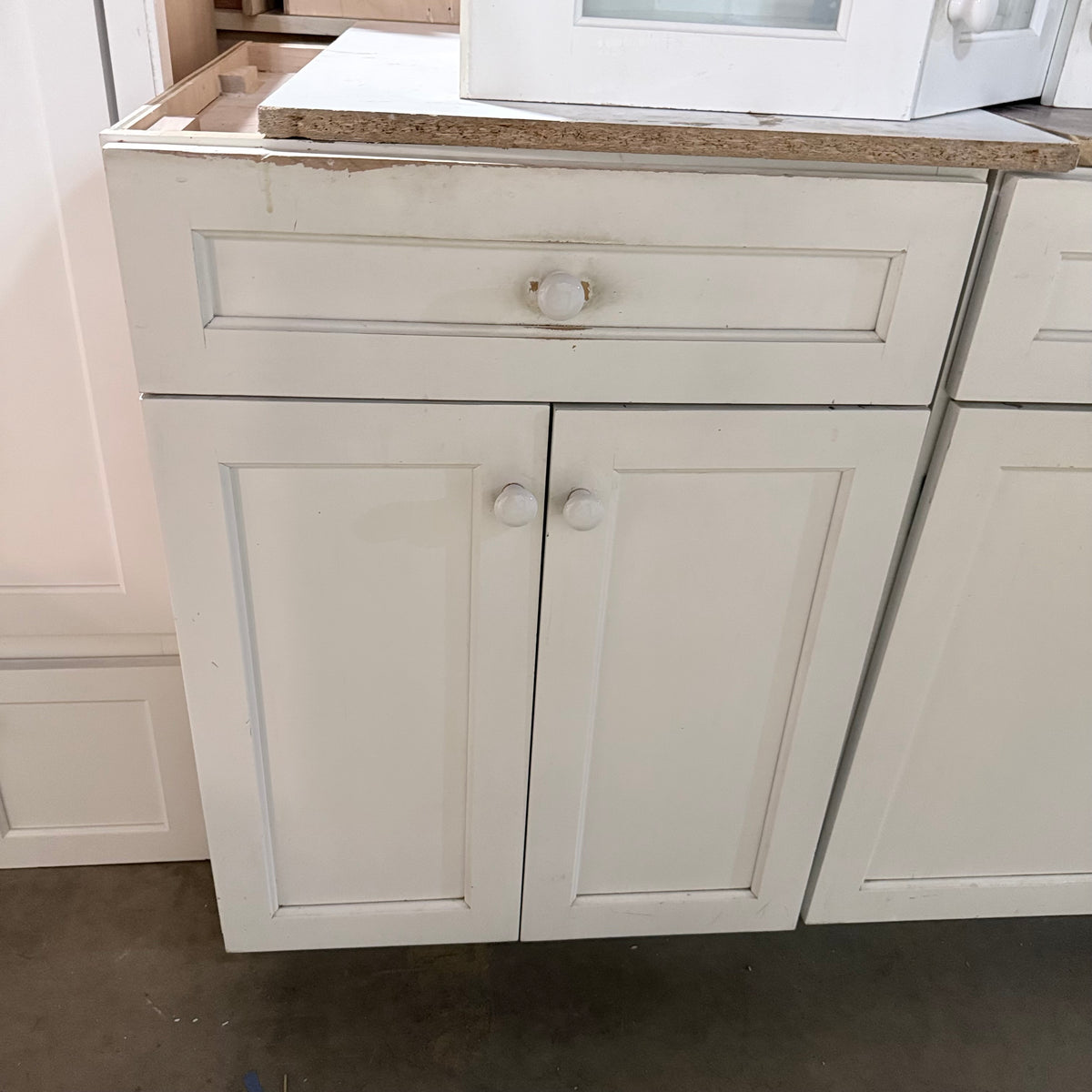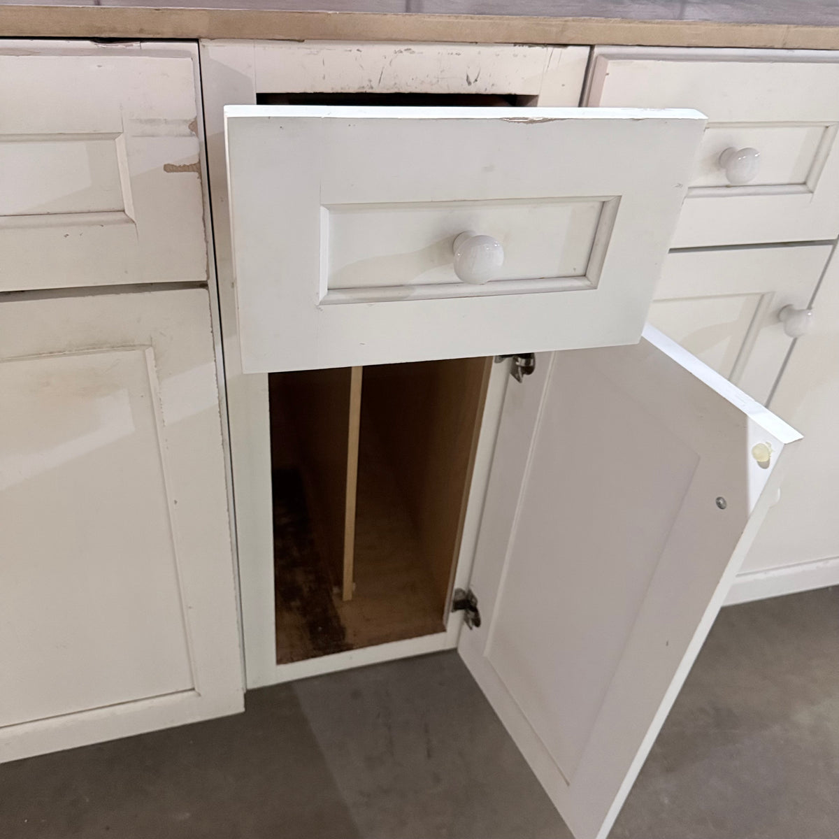 Please note, additional cleaning is recommended for this set. There is an extensive amount of general wear and overall chipping to the paint on this cabinet set (see photos).