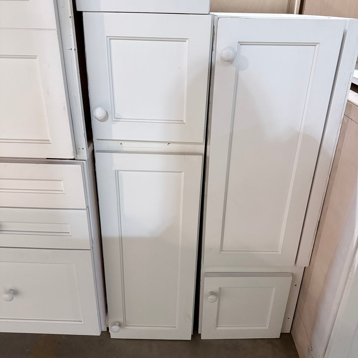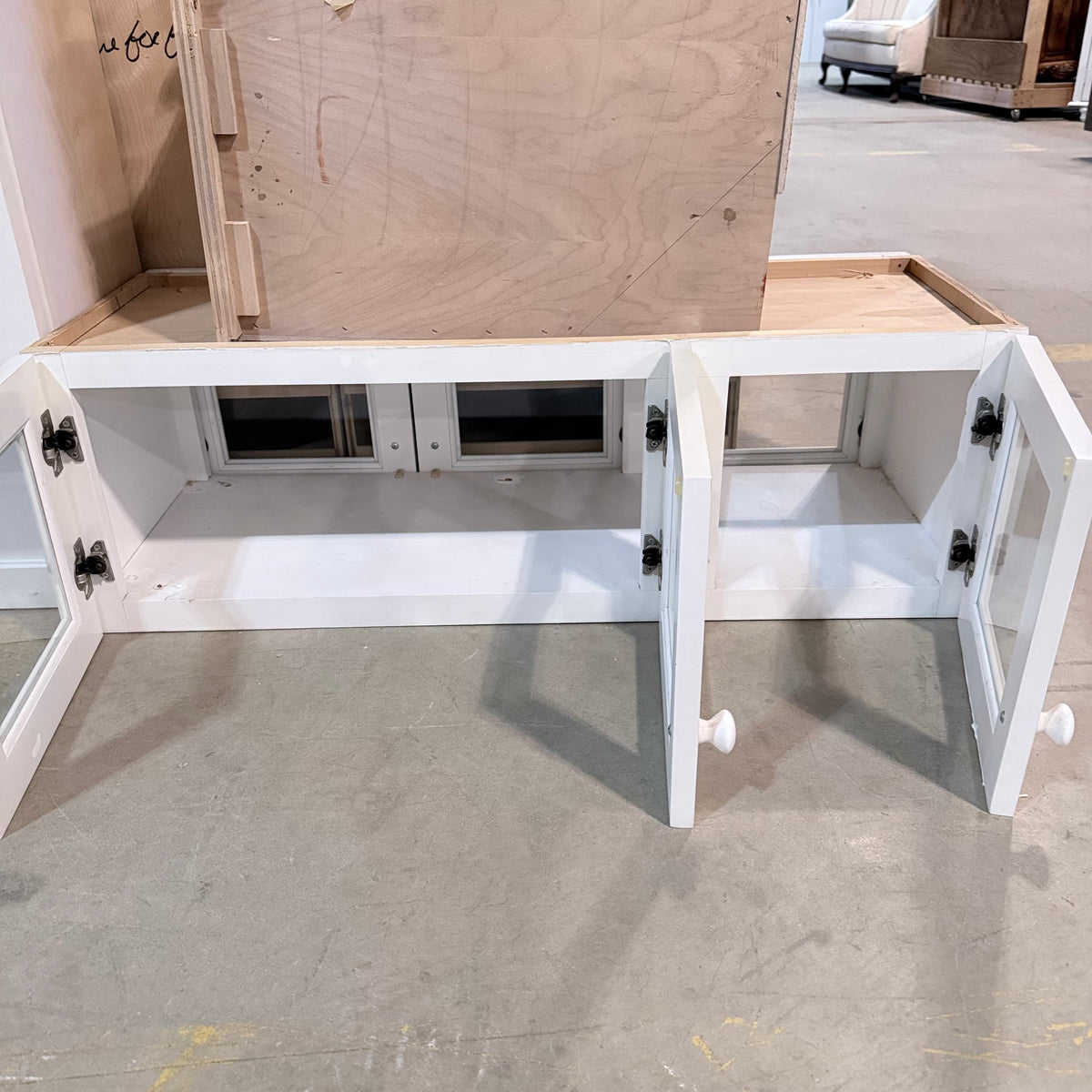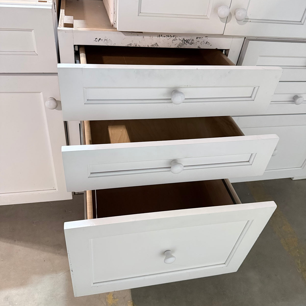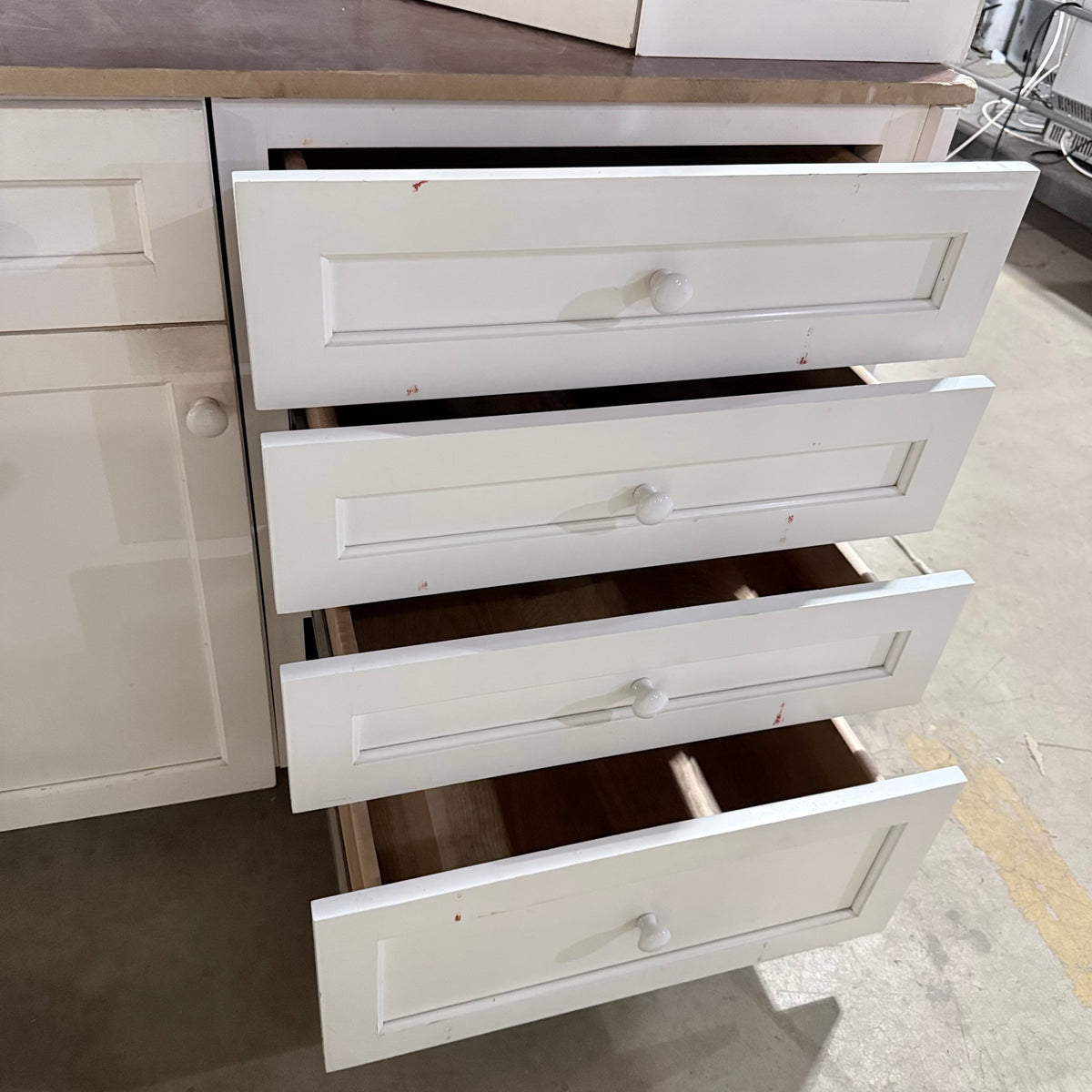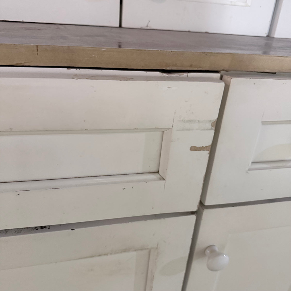 Please note, additional cleaning is recommended for this set. There is an extensive amount of general wear and overall chipping to the paint on this cabinet set (see photos).