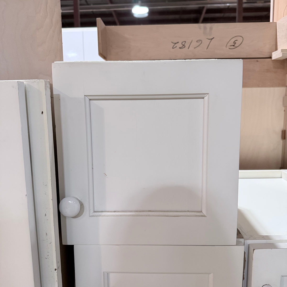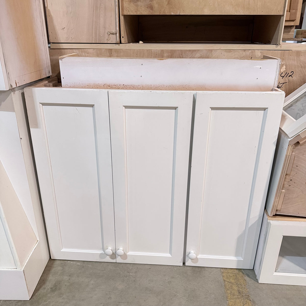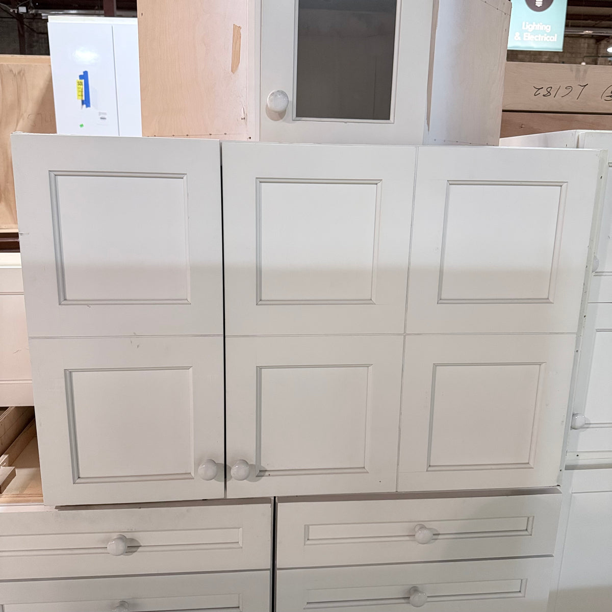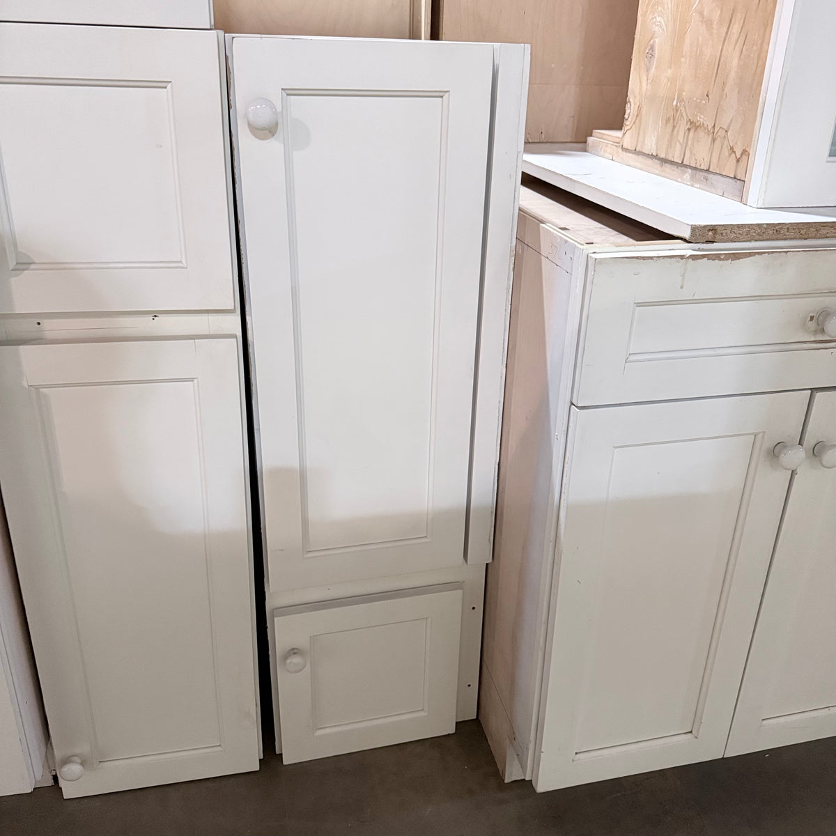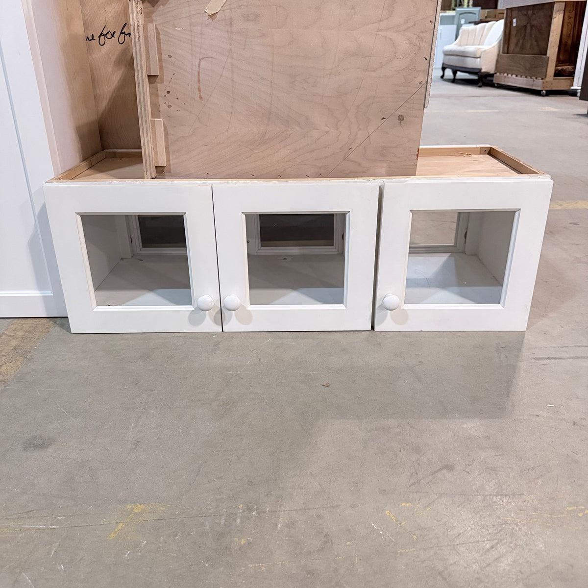 Please note, additional cleaning is recommended for this set. There is an extensive amount of general wear and overall chipping to the paint on this cabinet set (see photos).