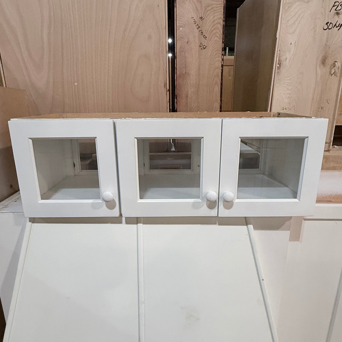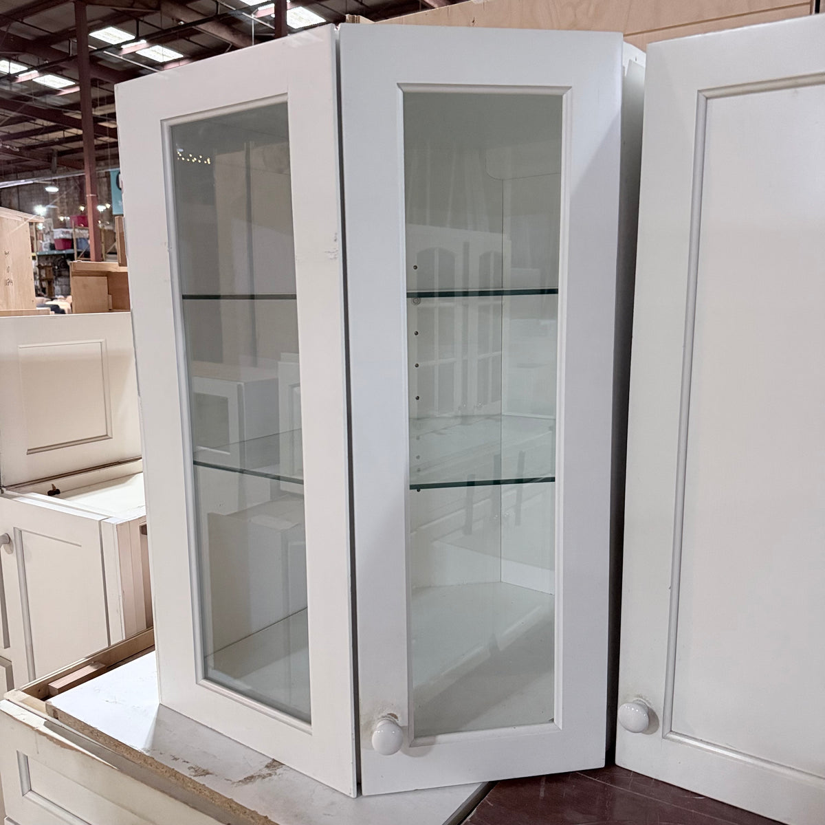 30" High x 21" Wide x 21" Deep (upper corner cabinet with glass panel door)