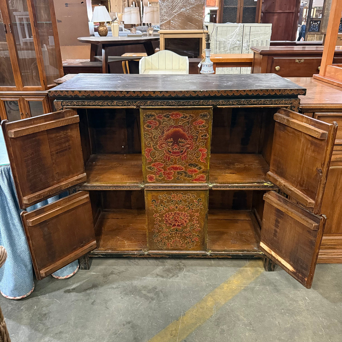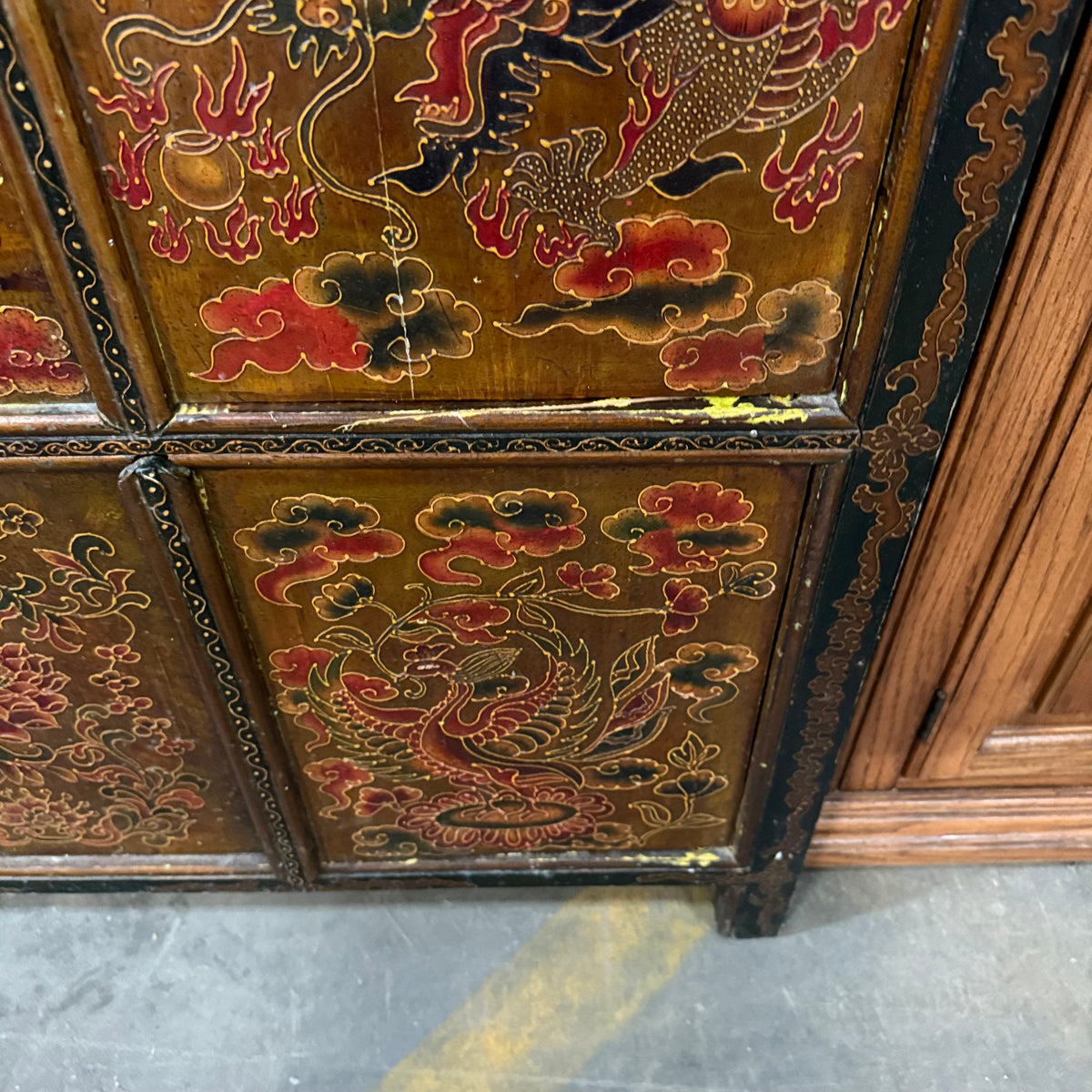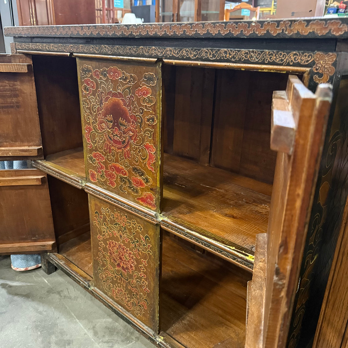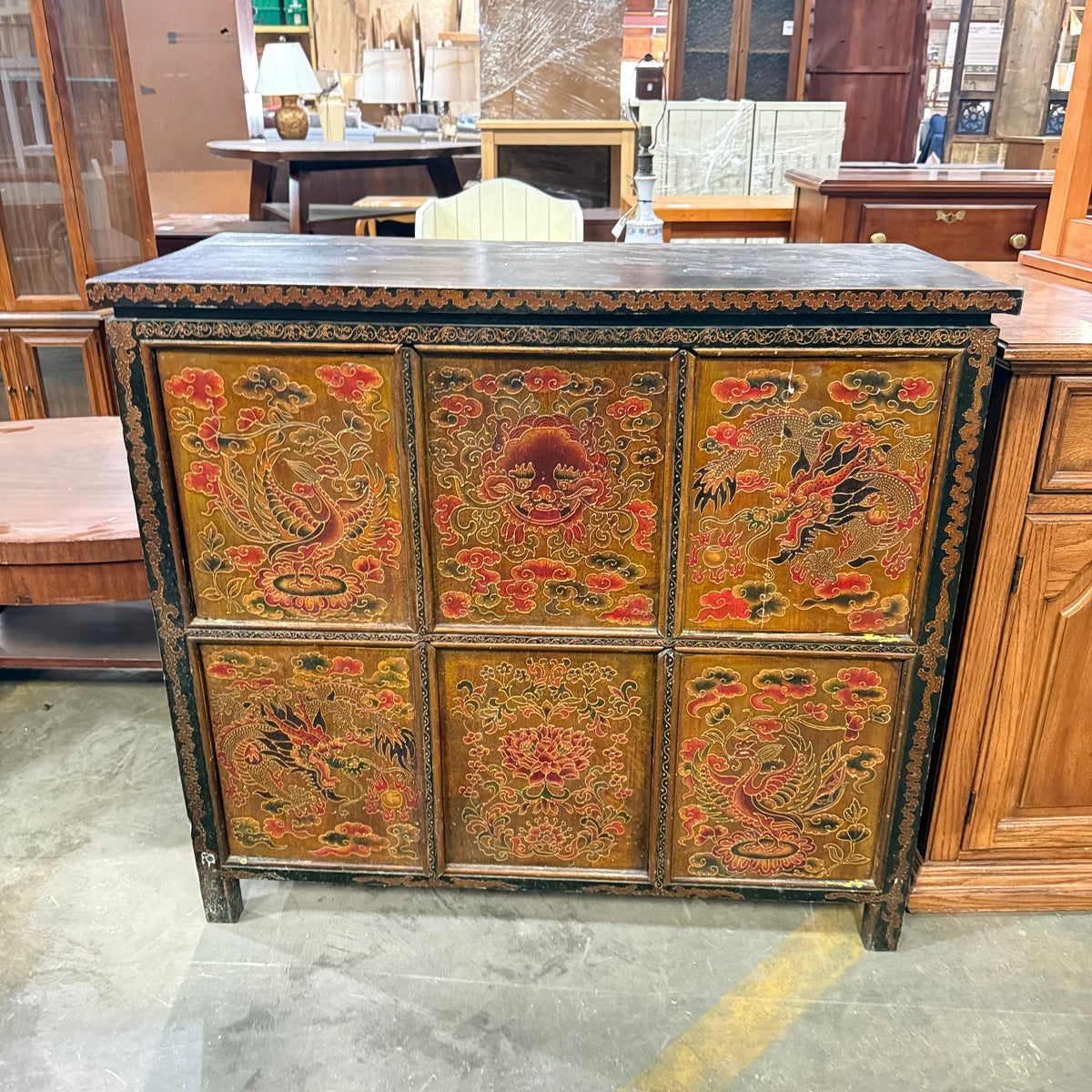 This product is a previously owned antique Sino-Tibetan cabinet with polychromatic painted dragons and flowers. It features solid wood construction with a storage compartment divided by a single shelf in the middle. The cabinet has polychromatic hand-painted depictions of dragons, phoenix birds and flowers along the front doors and a large, lotus flower painted at either side.