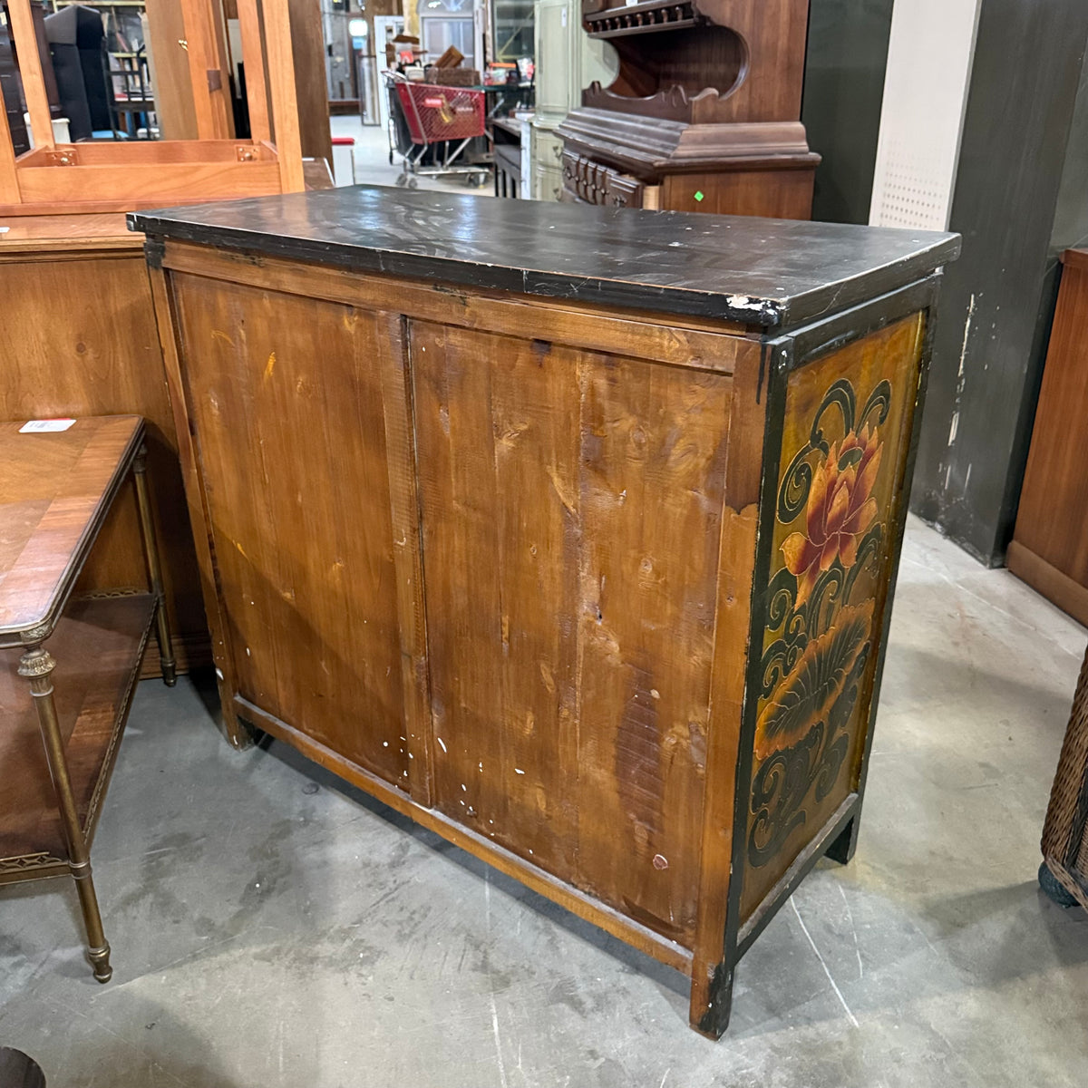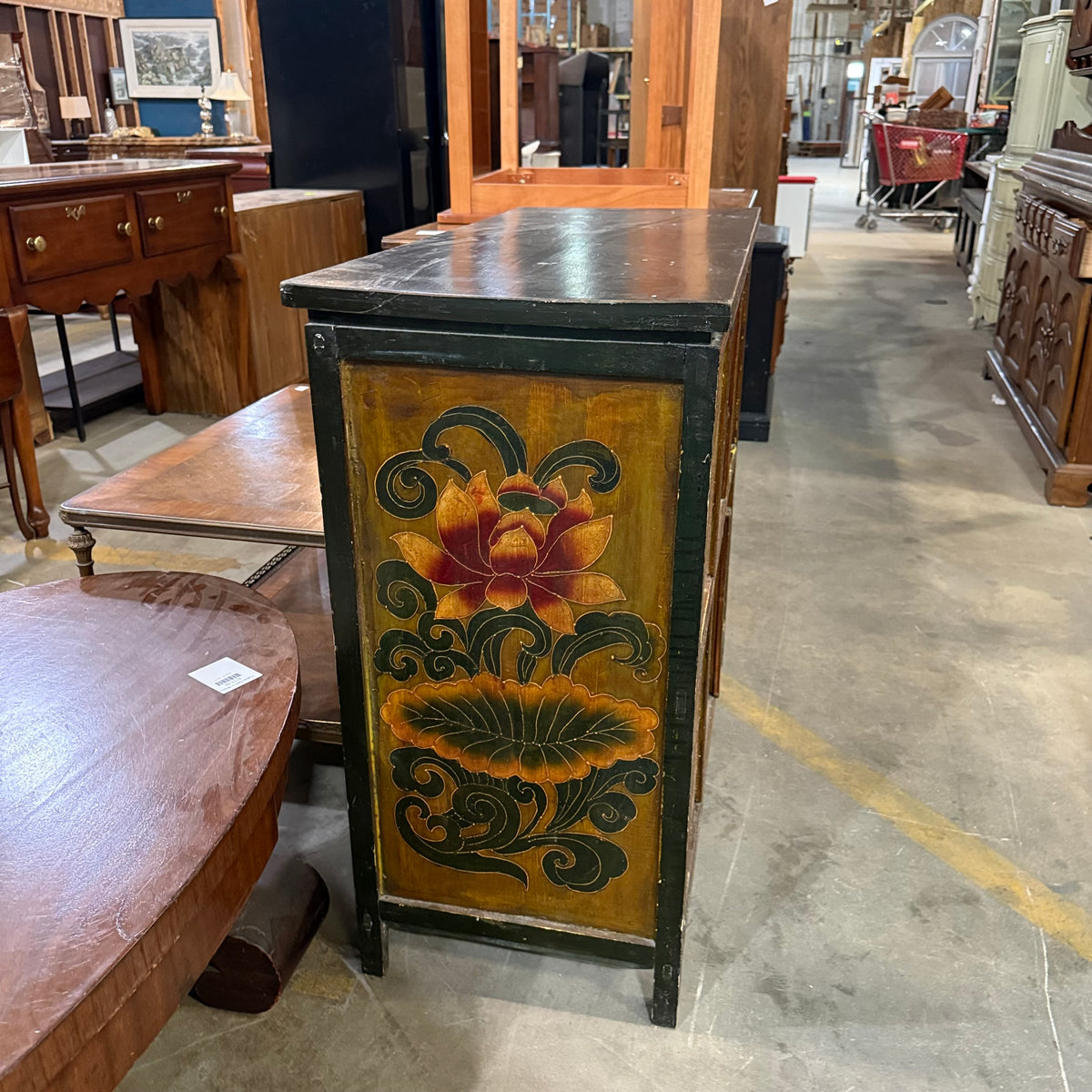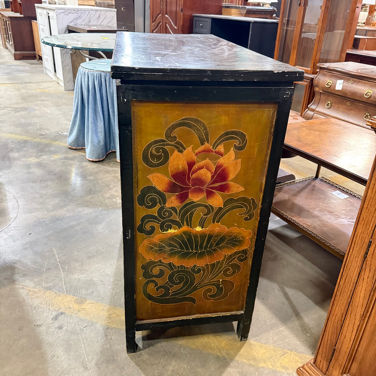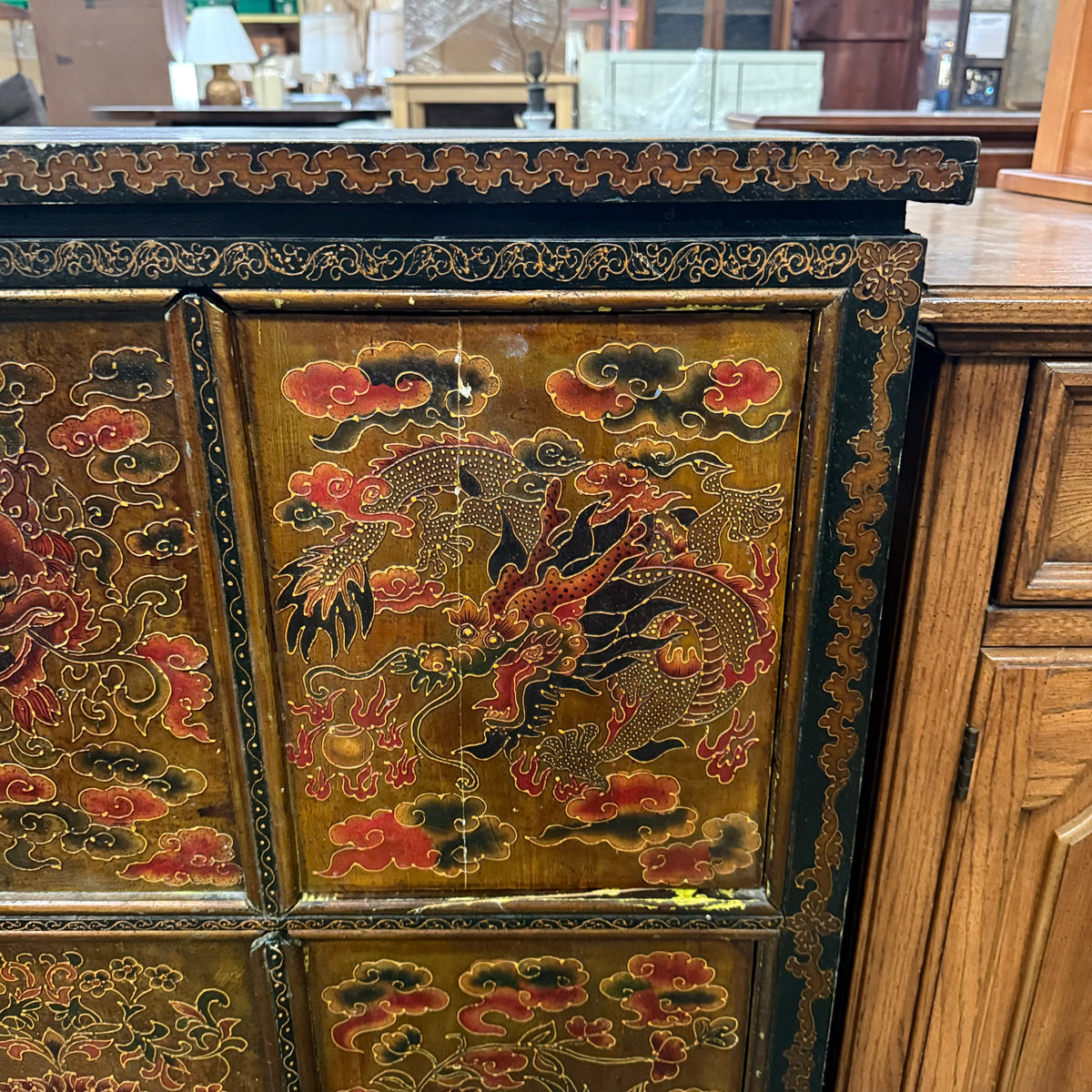 This product is a previously owned antique Sino-Tibetan cabinet with polychromatic painted dragons and flowers. It features solid wood construction with a storage compartment divided by a single shelf in the middle. The cabinet has polychromatic hand-painted depictions of dragons, phoenix birds and flowers along the front doors and a large, lotus flower painted at either side.
