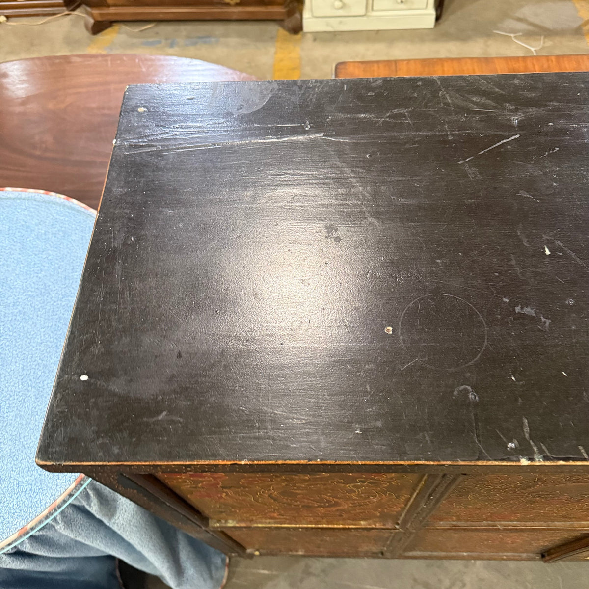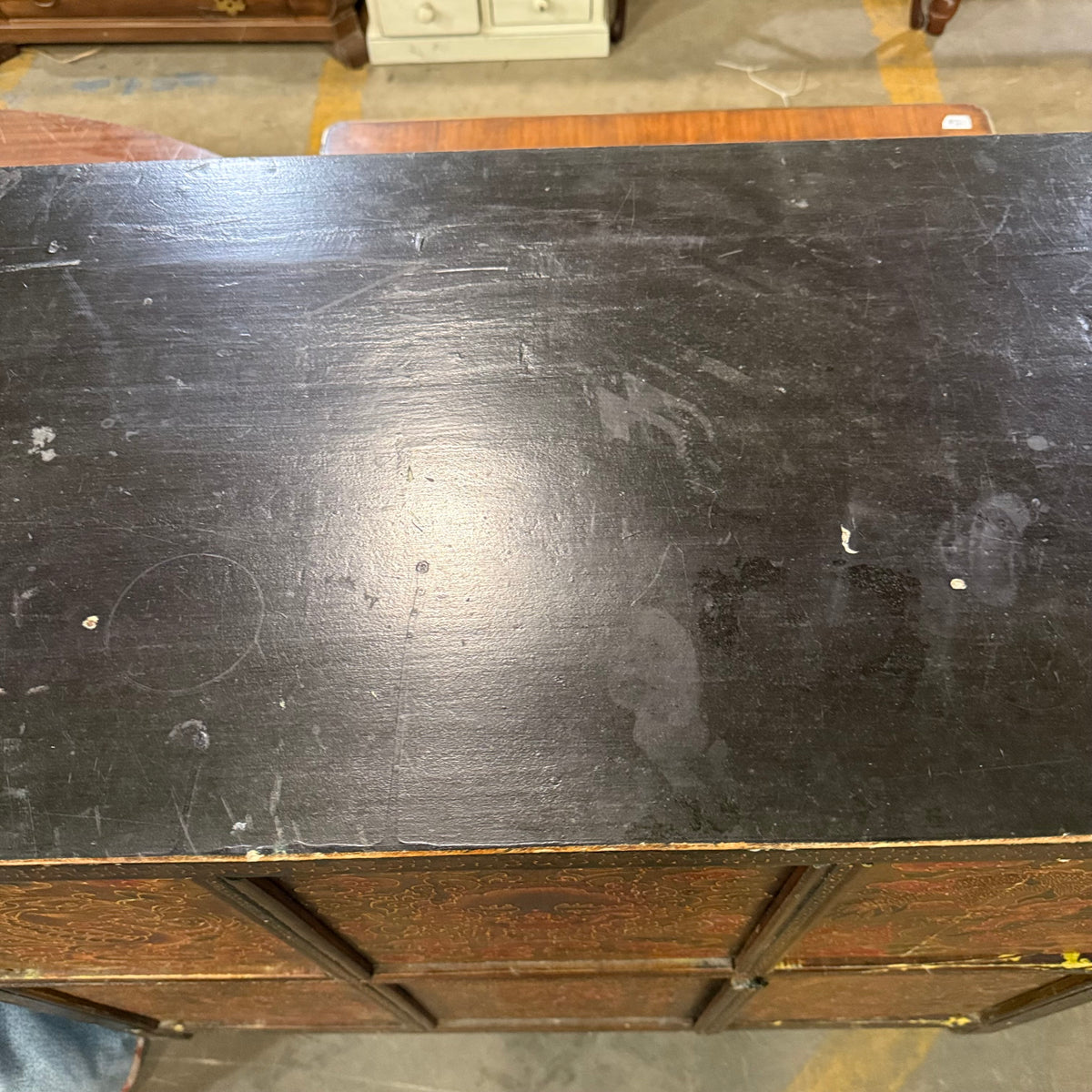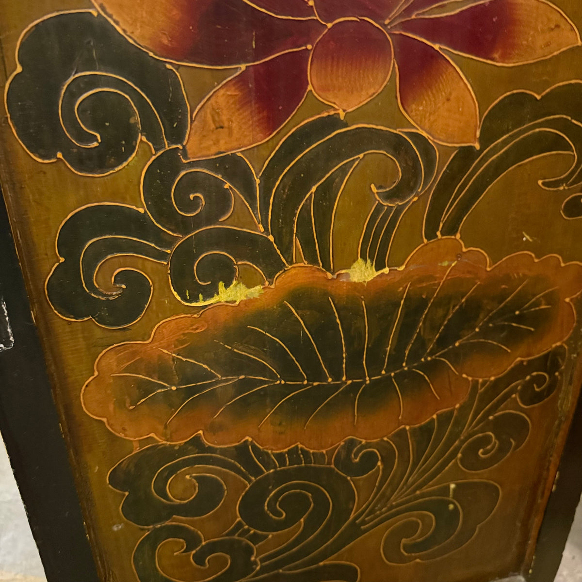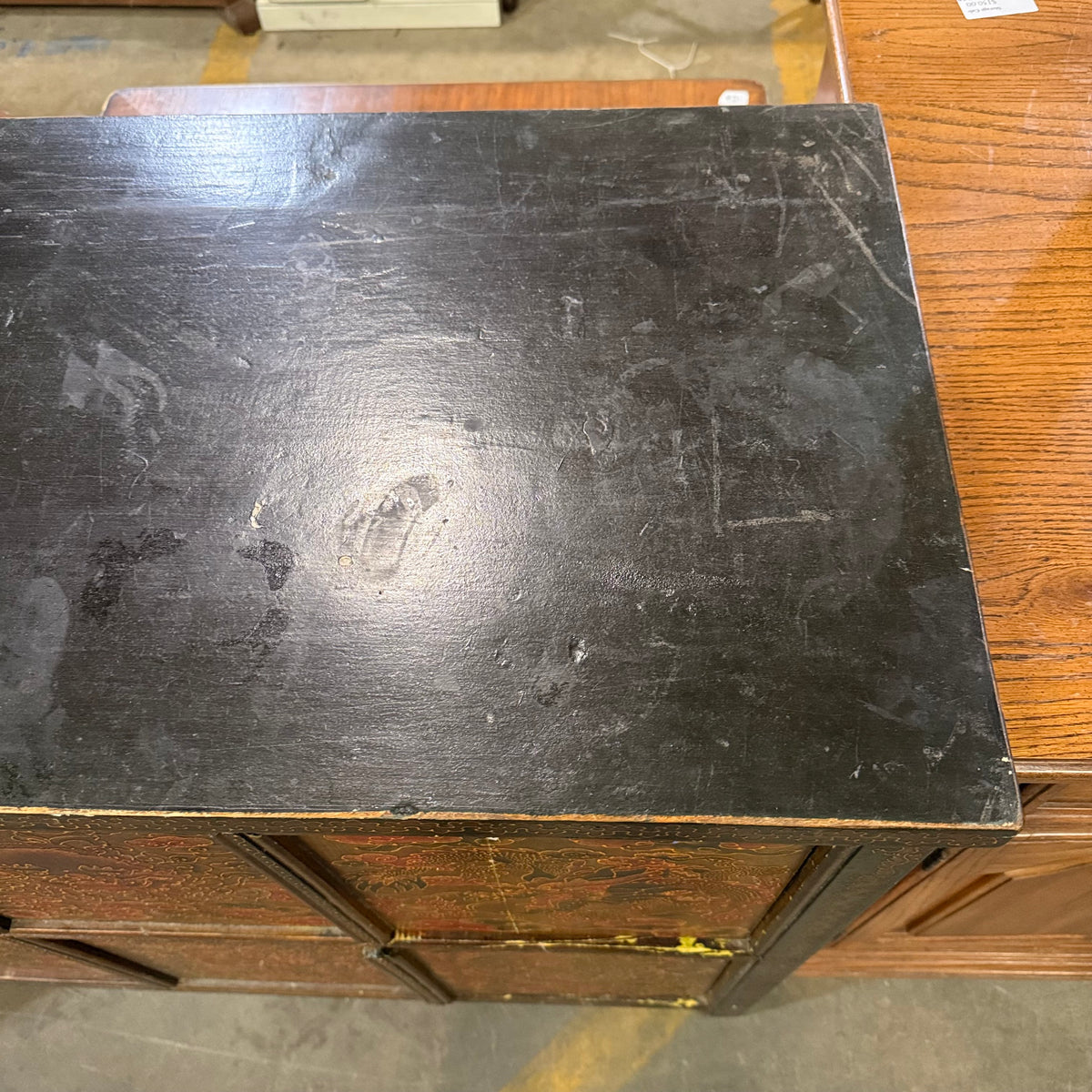 This product is a previously owned antique Sino-Tibetan cabinet with polychromatic painted dragons and flowers. It features solid wood construction with a storage compartment divided by a single shelf in the middle. The cabinet has polychromatic hand-painted depictions of dragons, phoenix birds and flowers along the front doors and a large, lotus flower painted at either side.