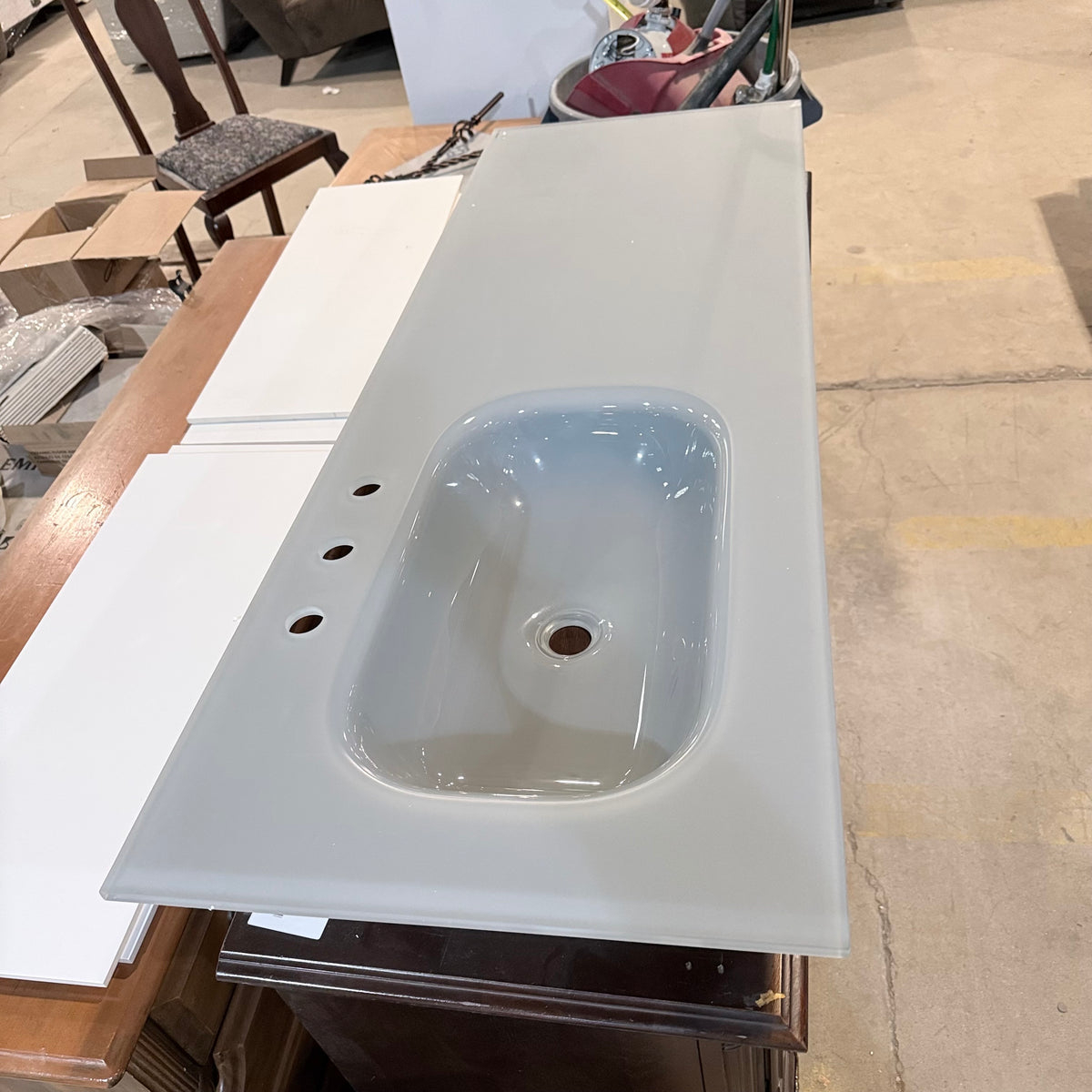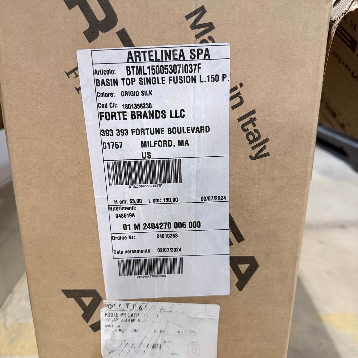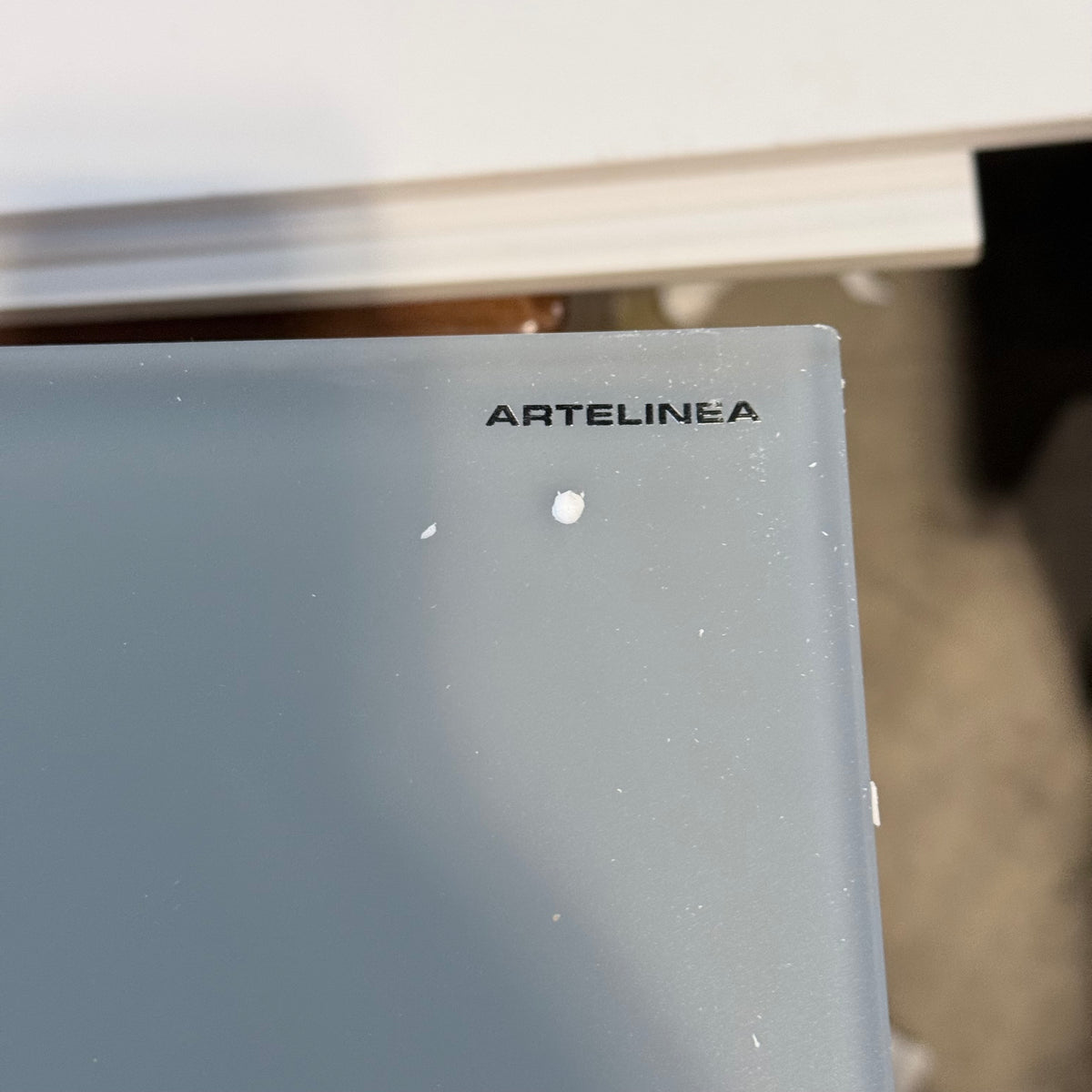 This product is a new-in box Artelinea Fusion, left-side faucet, single basin glass bathroom sink. Faucet and draining hardware is not included.