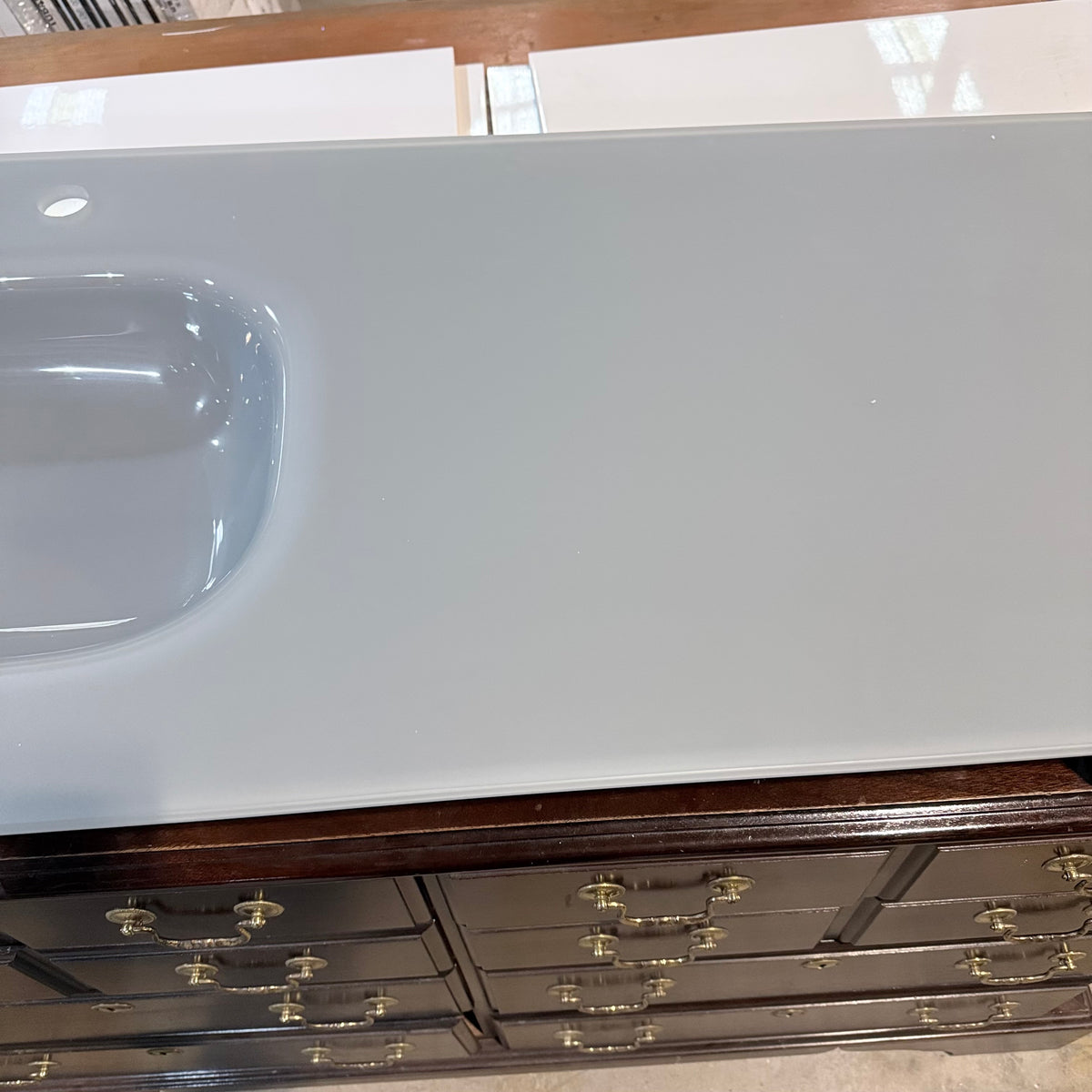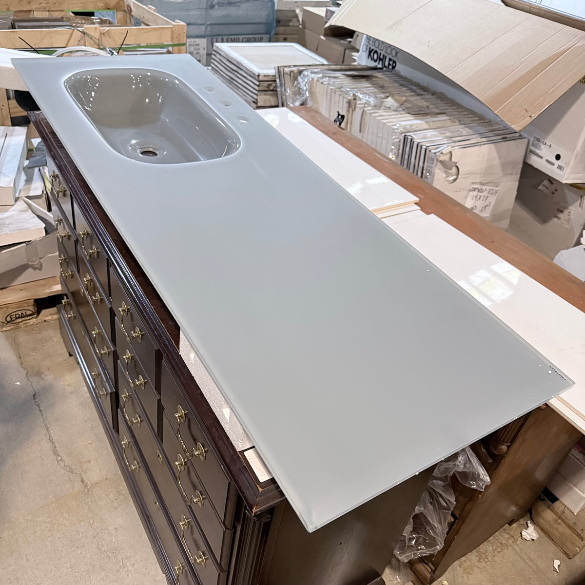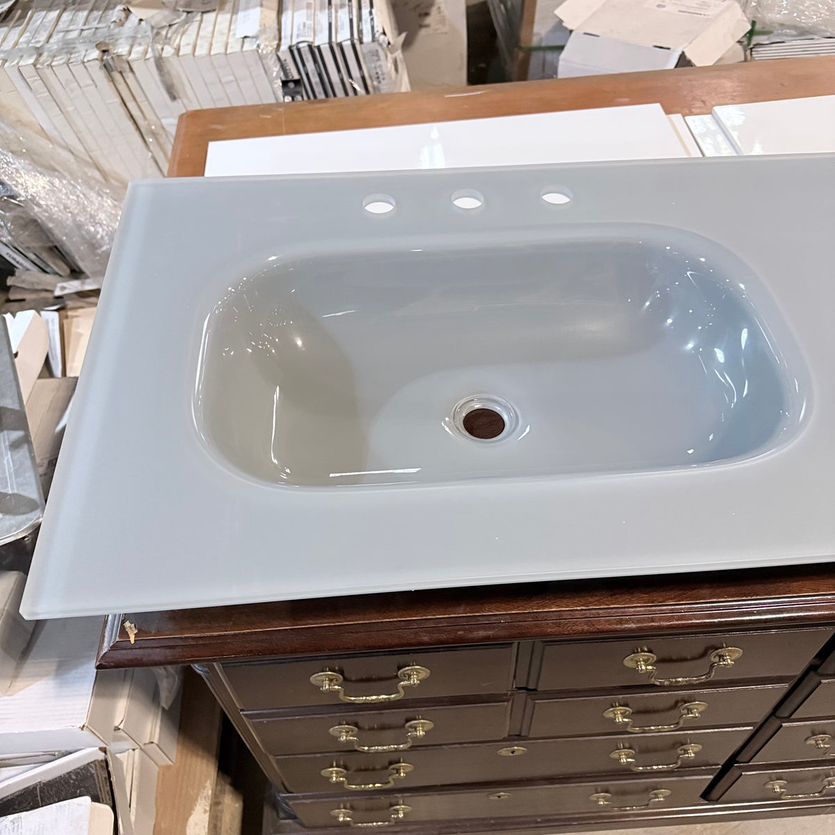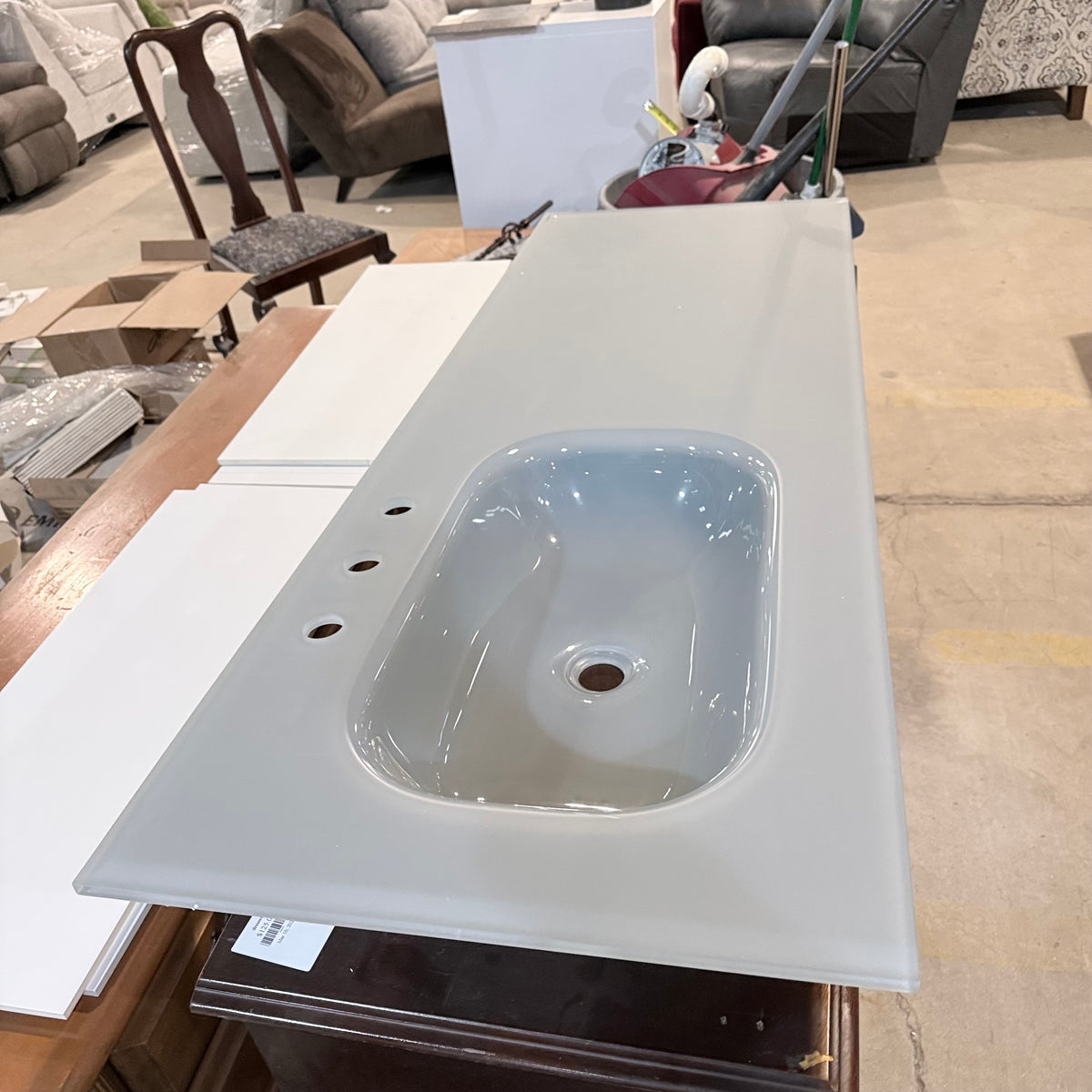 This product is a new-in box Artelinea Fusion, left-side faucet, single basin glass bathroom sink. Faucet and draining hardware is not included.