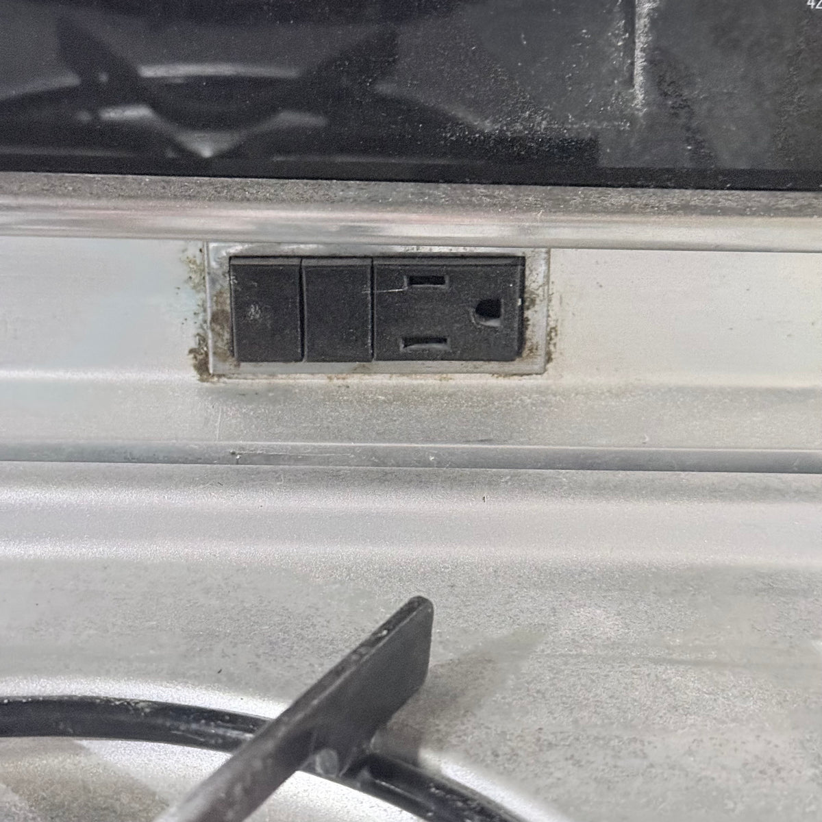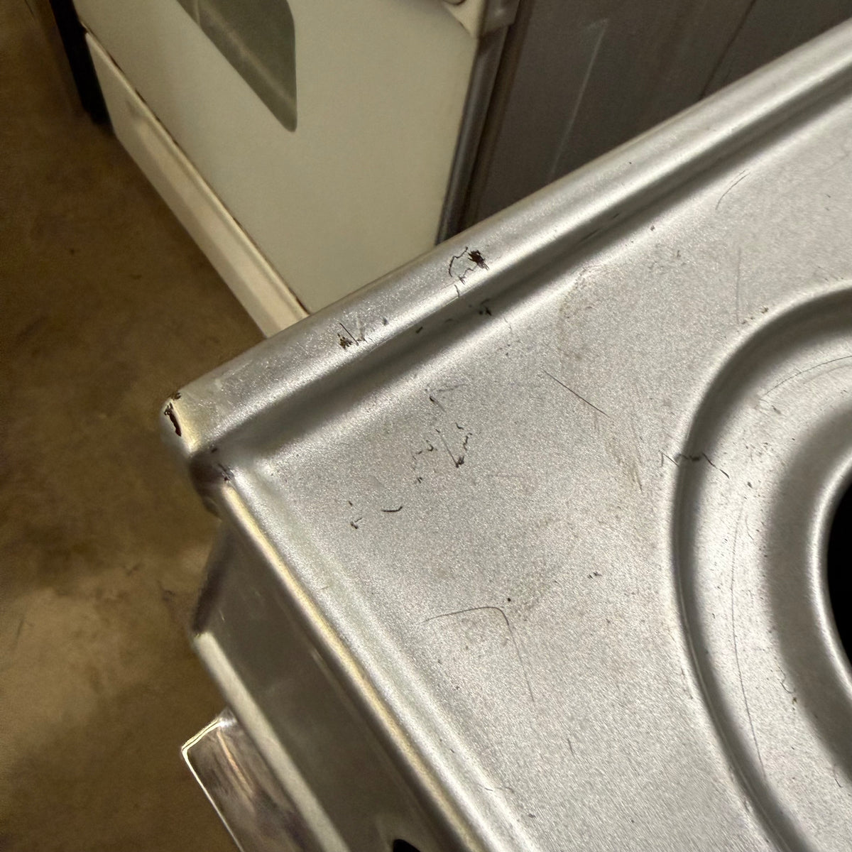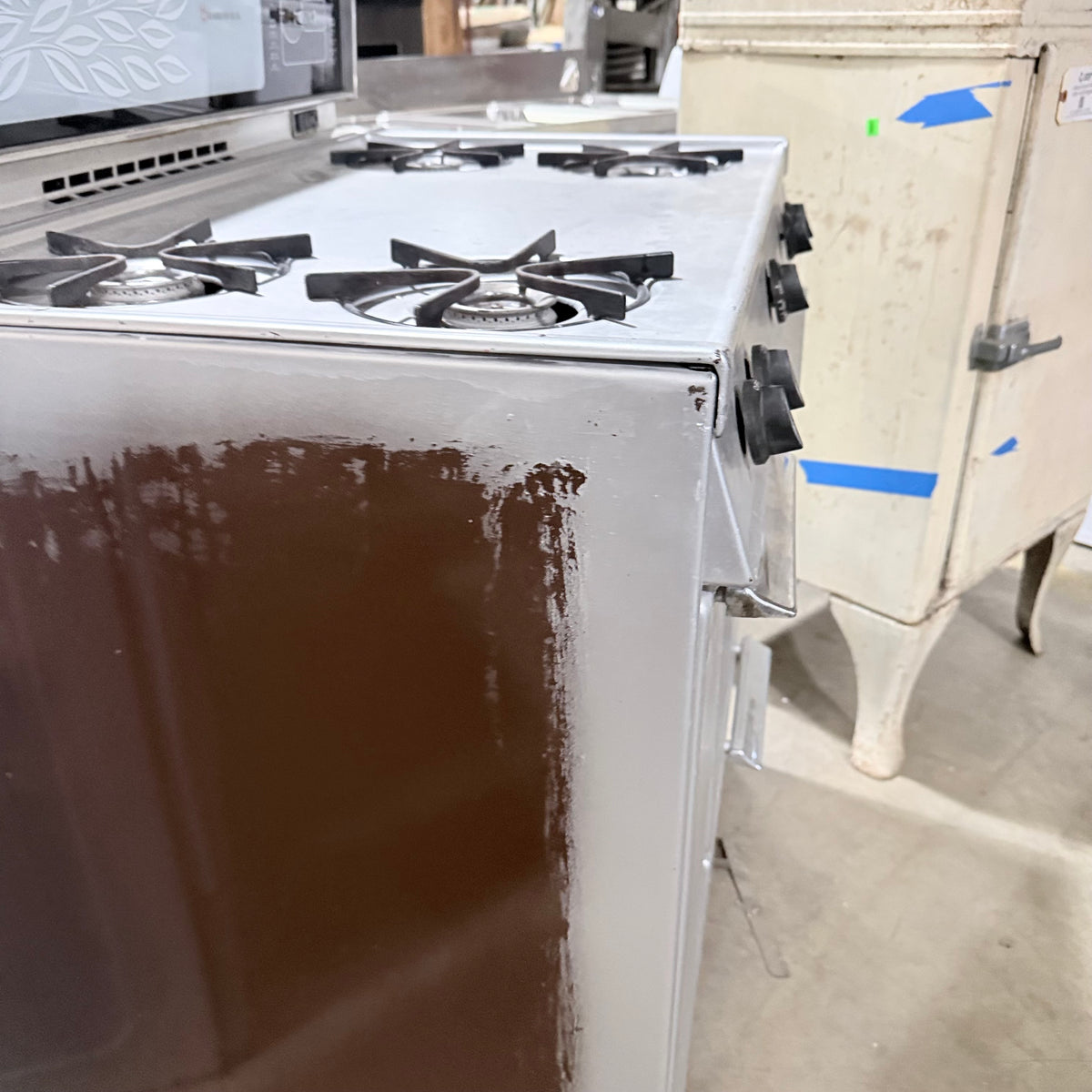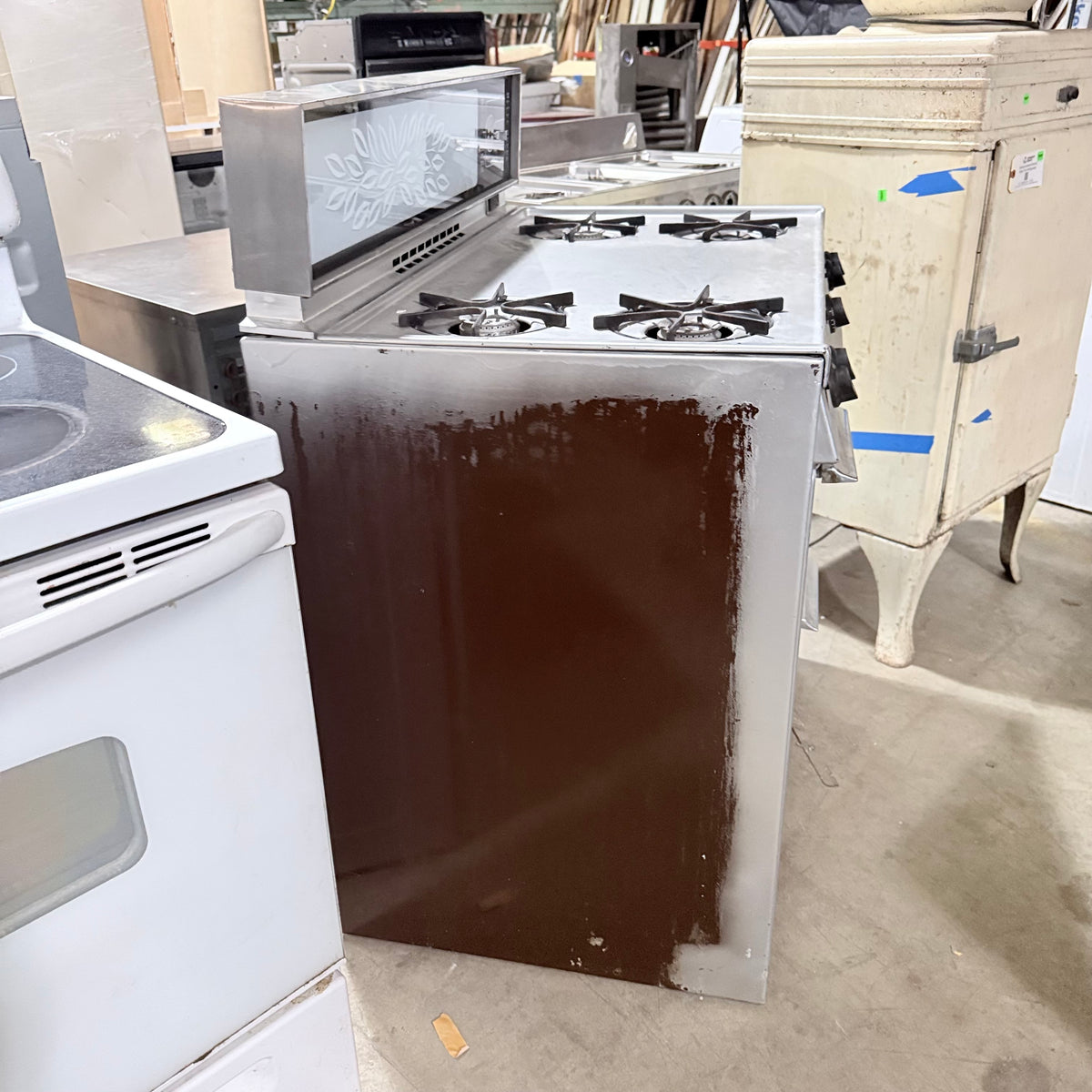 Please note, the plug has been damaged burnt so the entire cord and plug should be replaced immediately before testing or using this range. There is also an extensive amount of discoloration to this range's left sidewall either from possible previous prolonged heat exposure or some kind of cleaning chemical reaction (see photos).