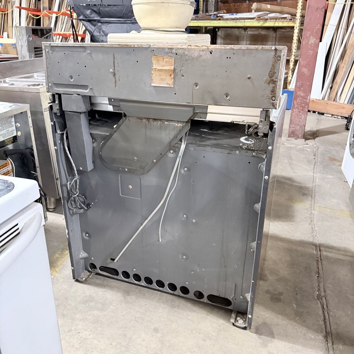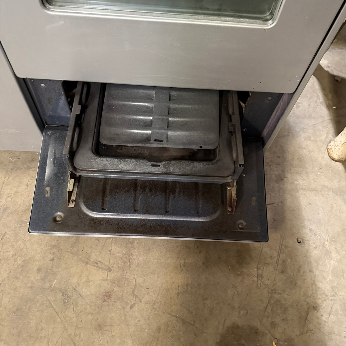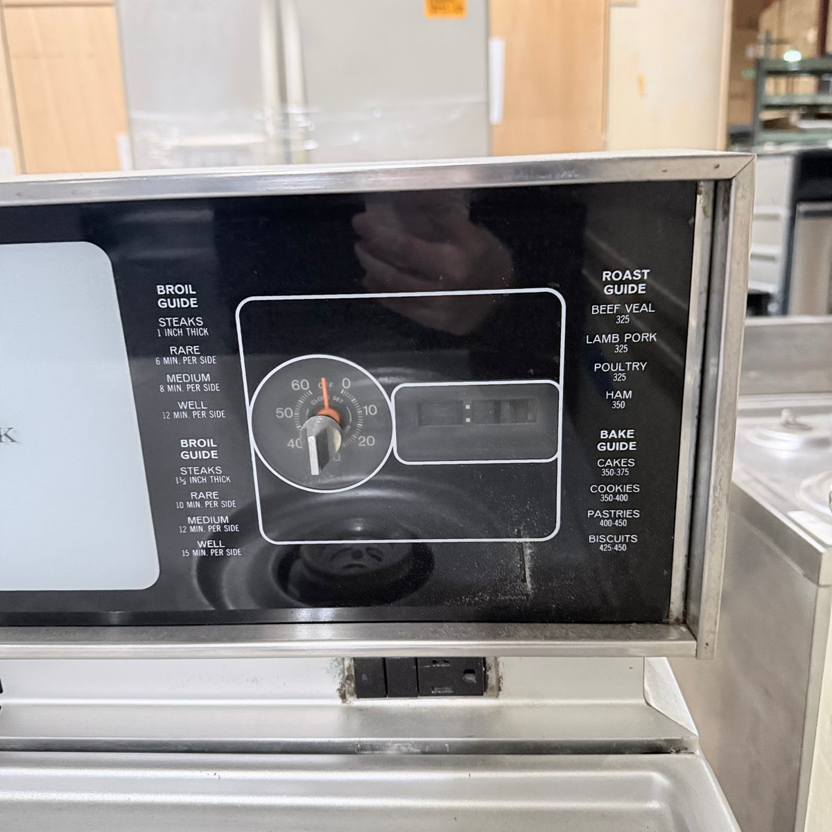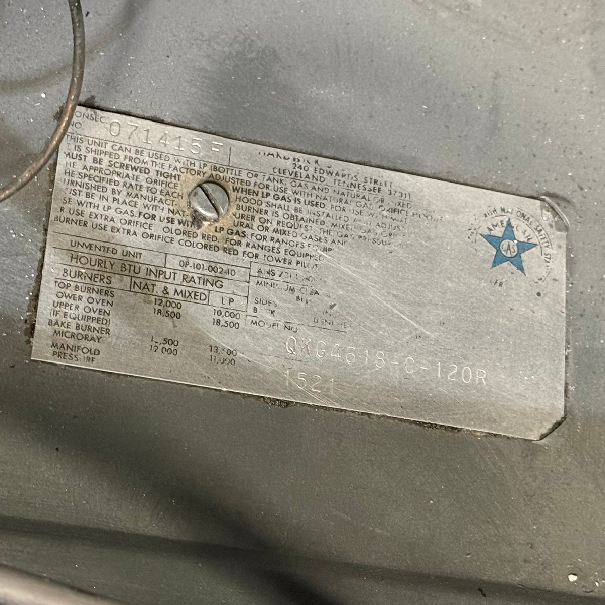 Please note, the plug has been damaged burnt so the entire cord and plug should be replaced immediately before testing or using this range. There is also an extensive amount of discoloration to this range's left sidewall either from possible previous prolonged heat exposure or some kind of cleaning chemical reaction (see photos).