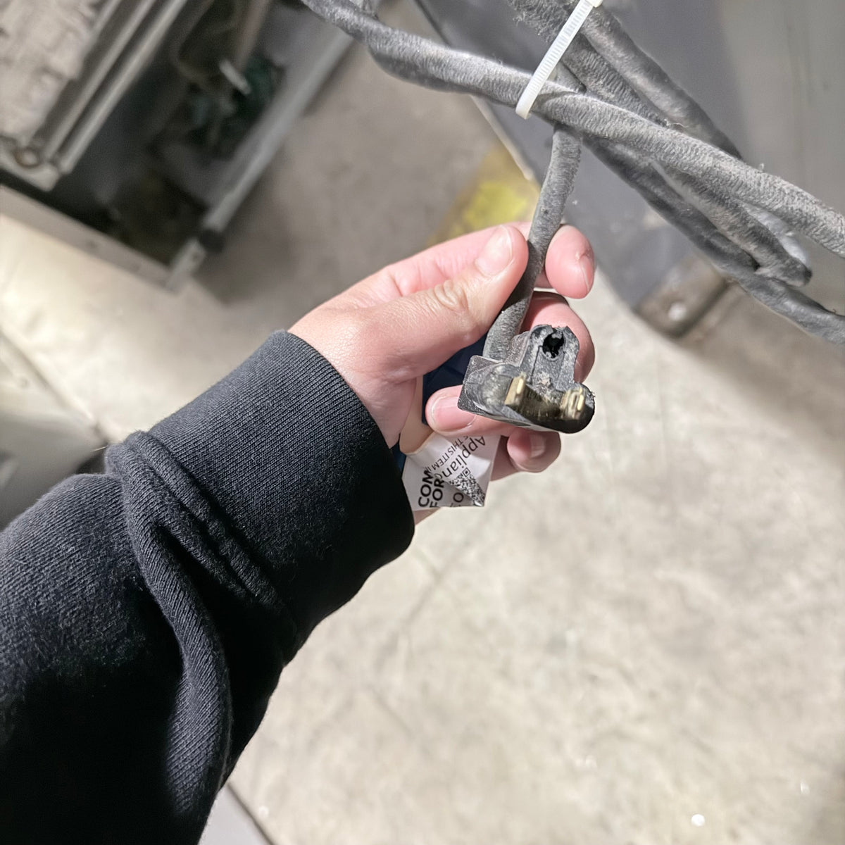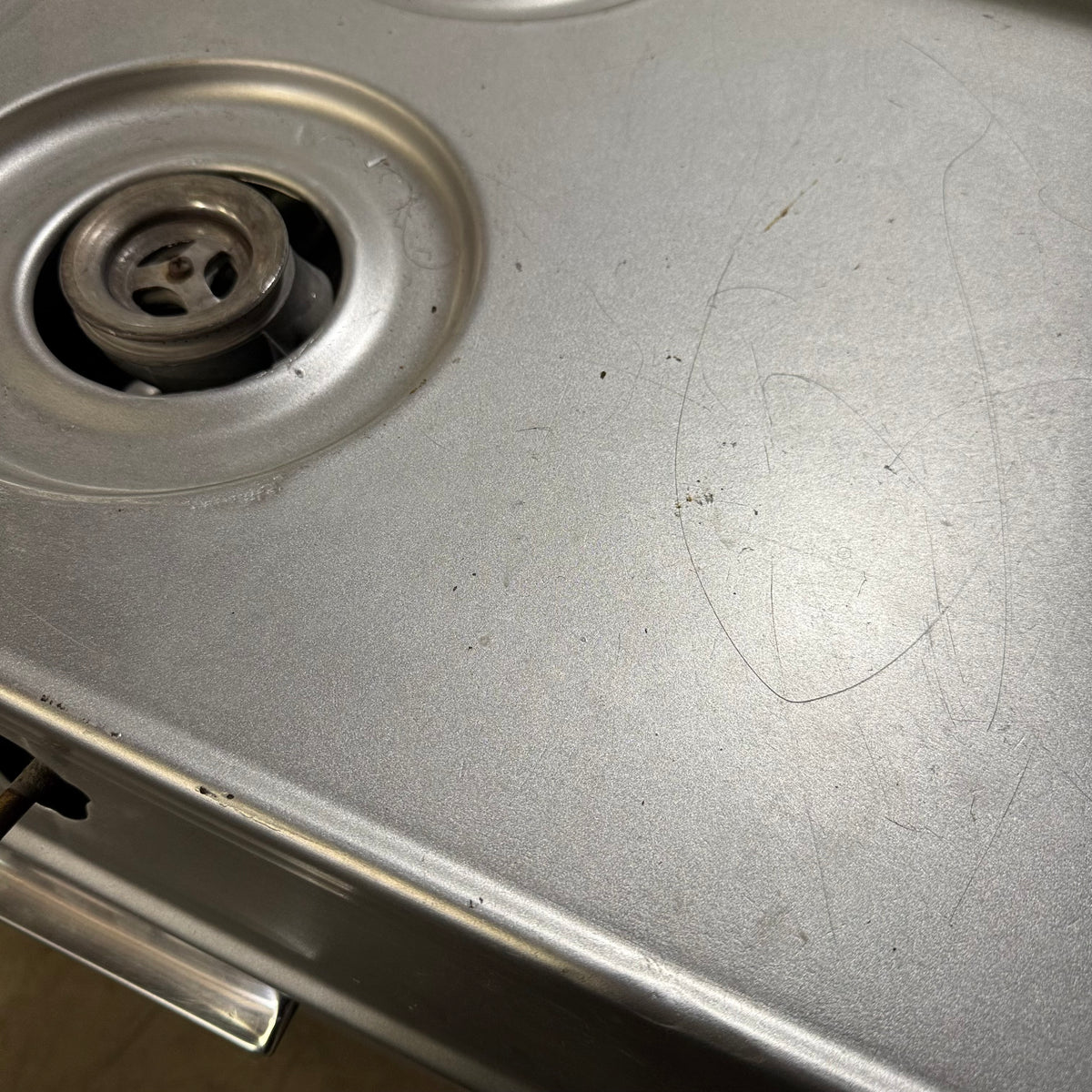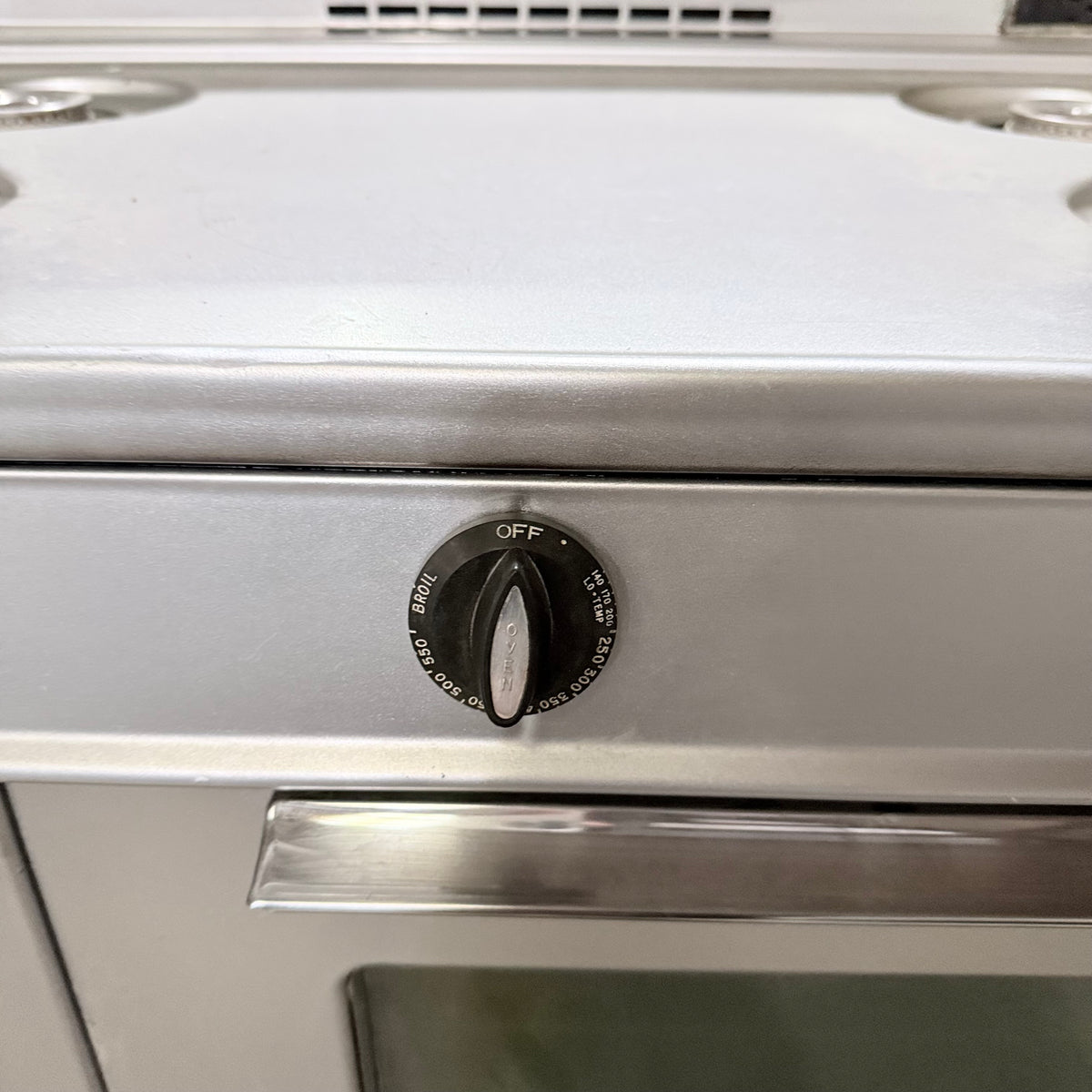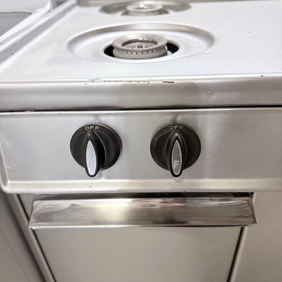 Please note, the plug has been damaged burnt so the entire cord and plug should be replaced immediately before testing or using this range. There is also an extensive amount of discoloration to this range's left sidewall either from possible previous prolonged heat exposure or some kind of cleaning chemical reaction (see photos).