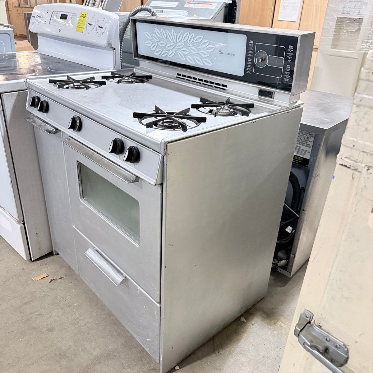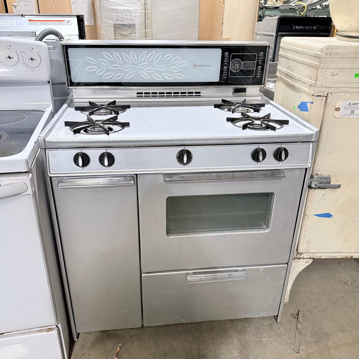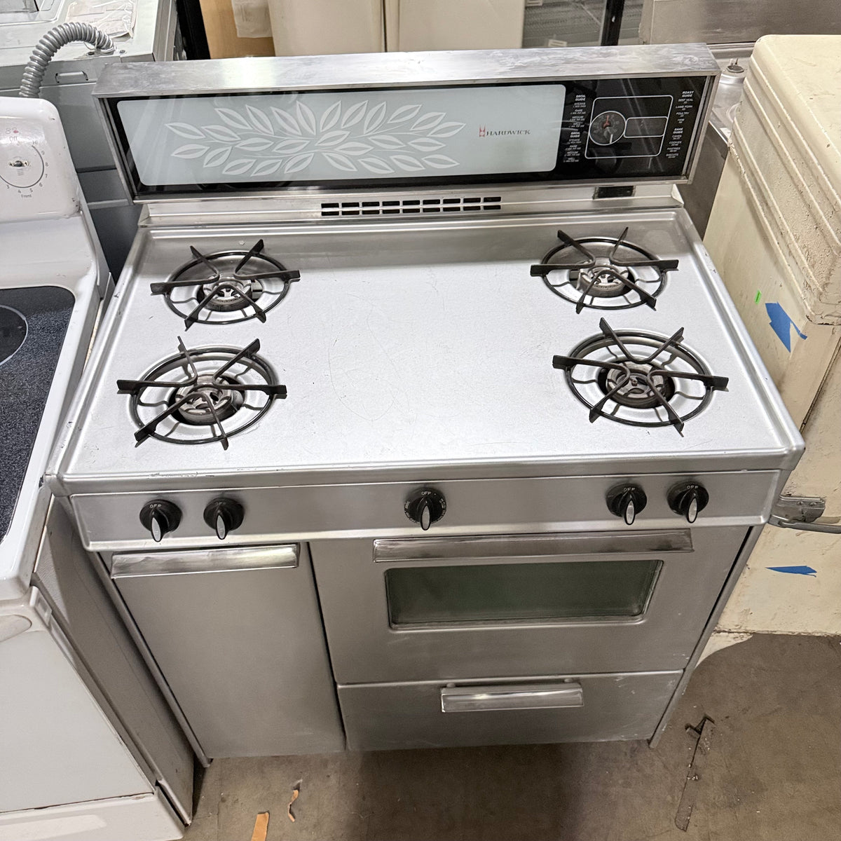 This late 1960s or early 1970's vintage Hardwick gas range is untested and being sold in as-is condition. It has 4 burners, a storage compartment on the left, an oven on the right, and a broiler compartment all the way at the bottom. It also has a backsplash with an air vent in the center, a small clock with a timer right next to it and a 2-prong outlet plug right underneath.