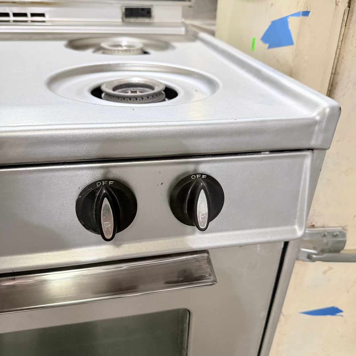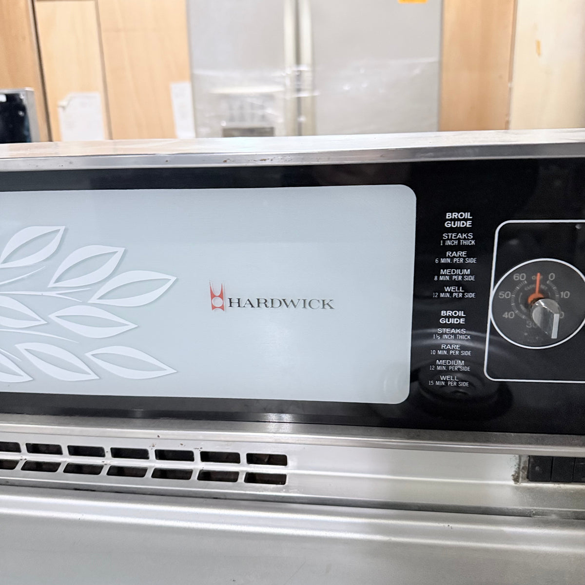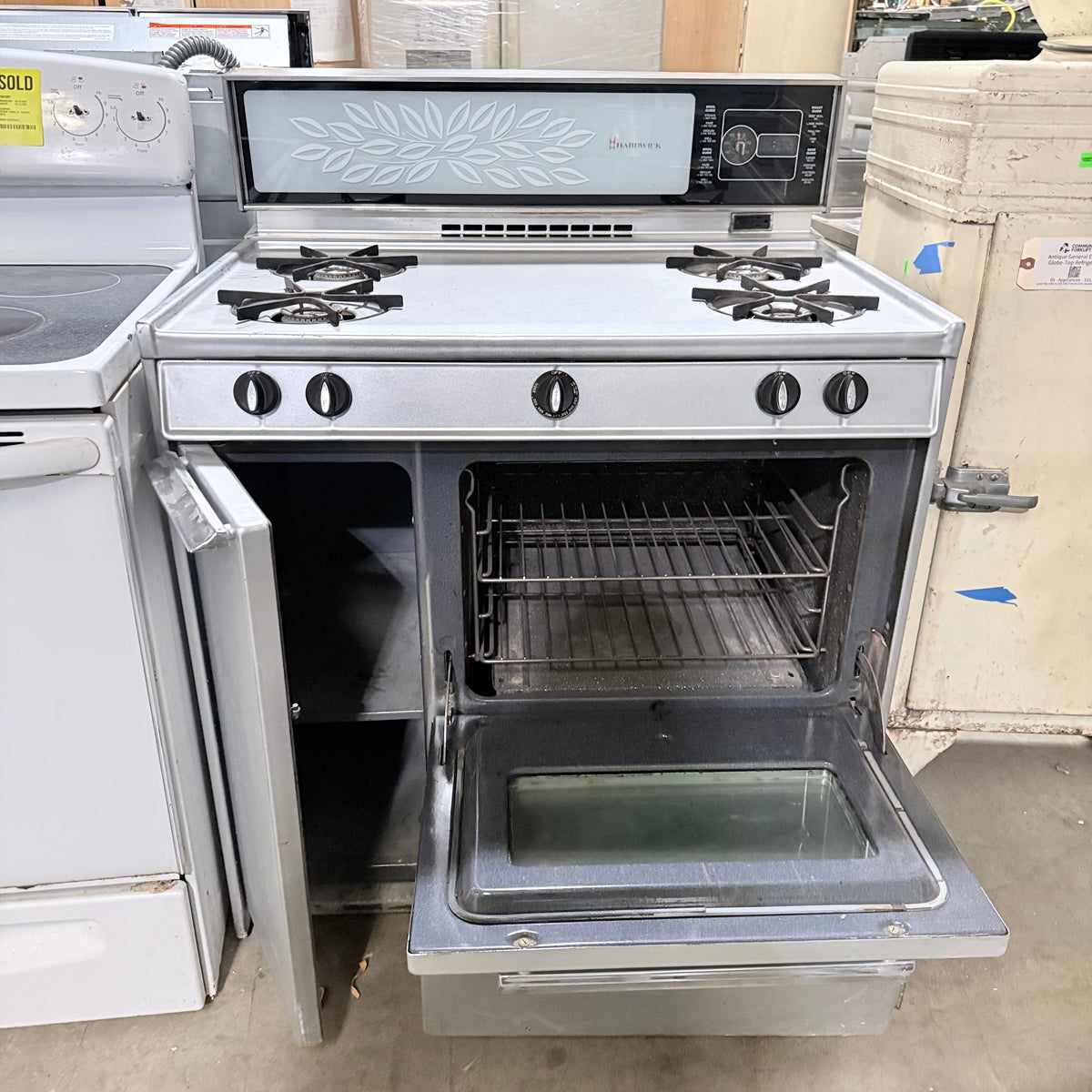 This late 1960s or early 1970's vintage Hardwick gas range is untested and being sold in as-is condition. It has 4 burners, a storage compartment on the left, an oven on the right, and a broiler compartment all the way at the bottom. It also has a backsplash with an air vent in the center, a small clock with a timer right next to it and a 2-prong outlet plug right underneath.