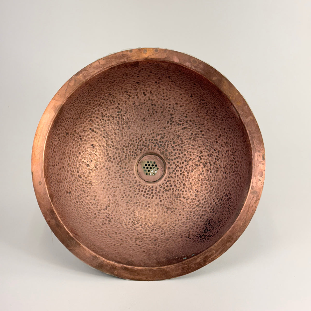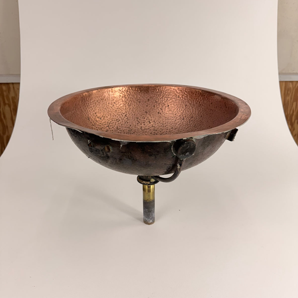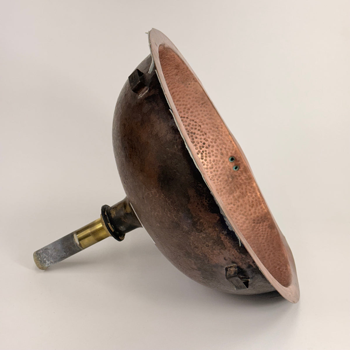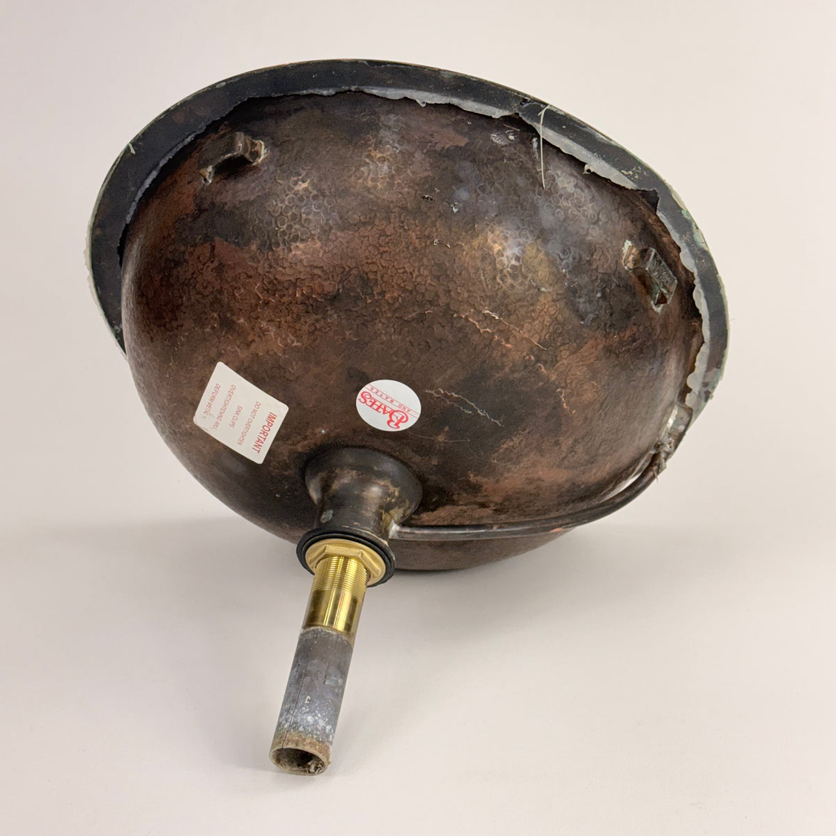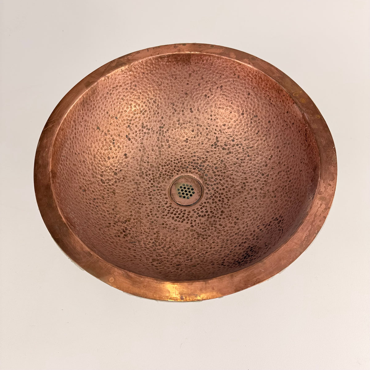 This product is a previously owned round, solid copper, hand-hammered bathroom sink made by Bates and Bates. It's meant to be installed as a drop-in sink and comes with a 5.5" pipe attached.
