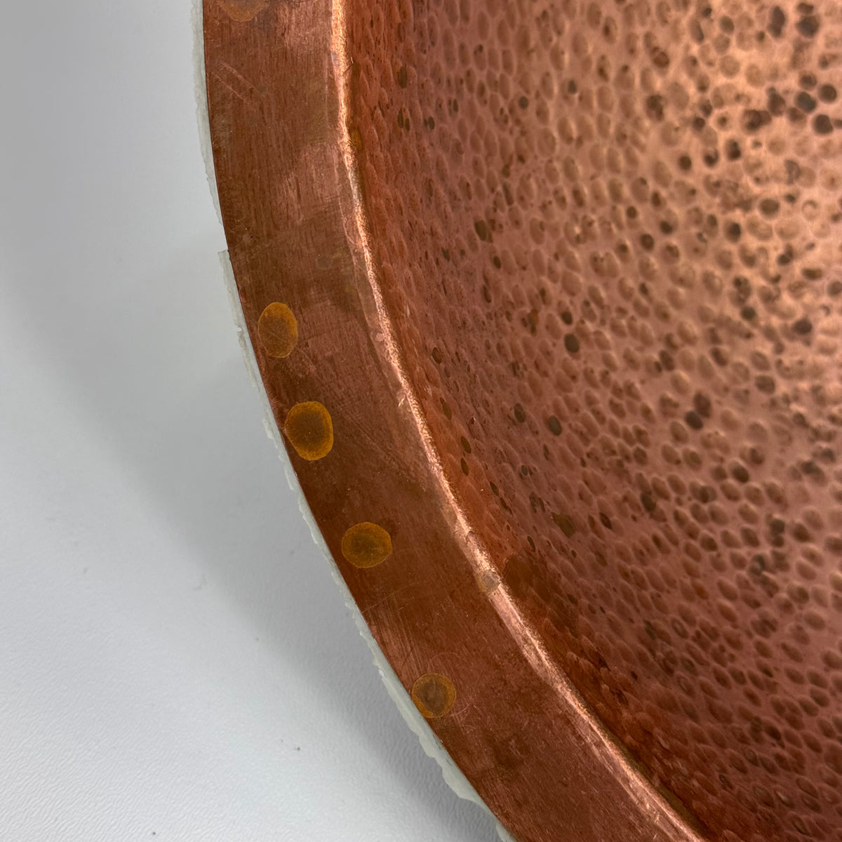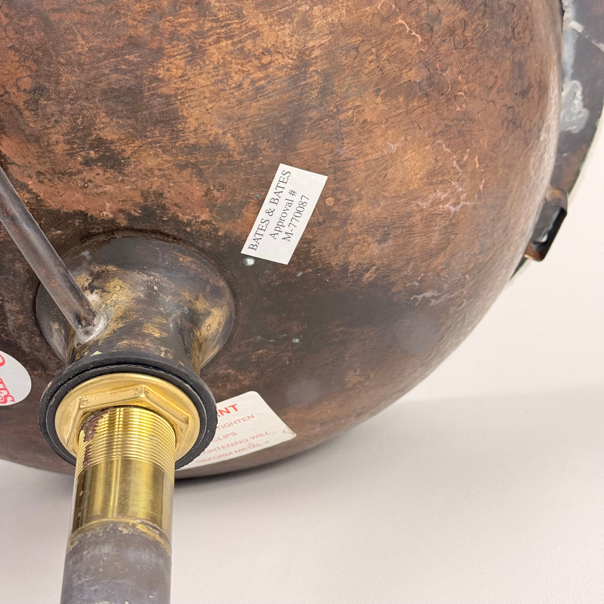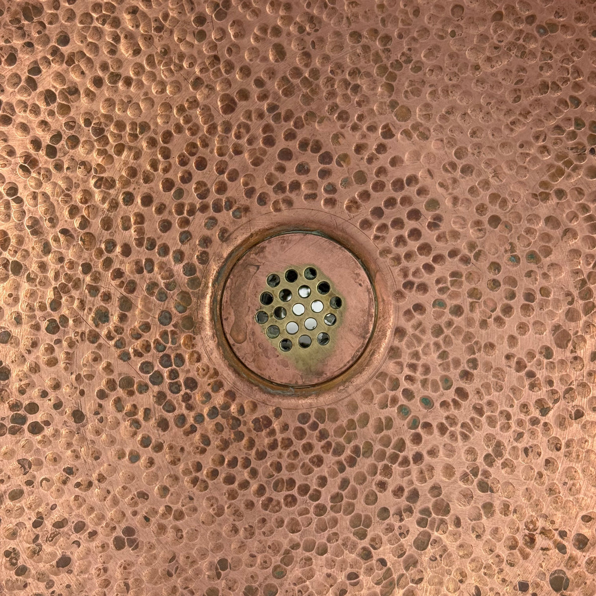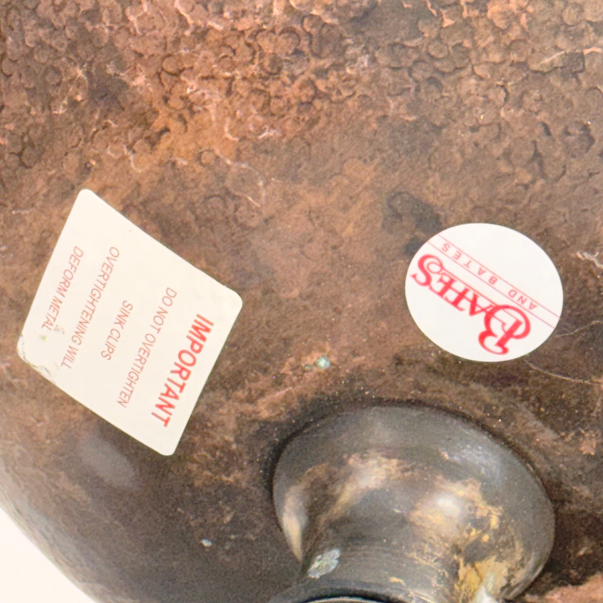 This product is a previously owned round, solid copper, hand-hammered bathroom sink made by Bates and Bates. It's meant to be installed as a drop-in sink and comes with a 5.5" pipe attached.