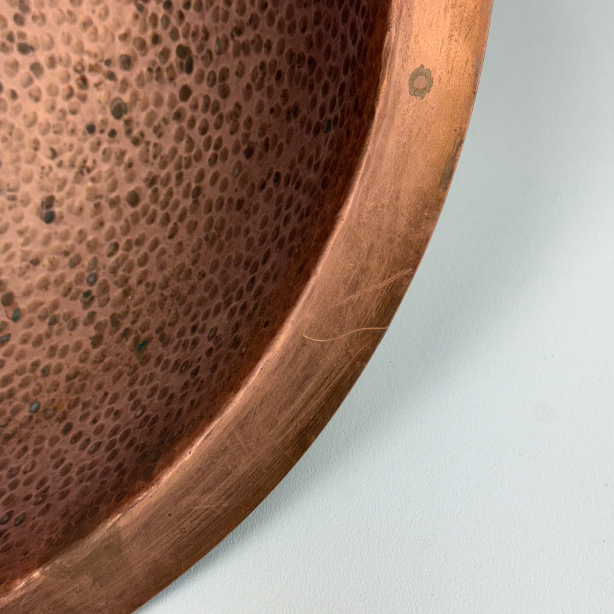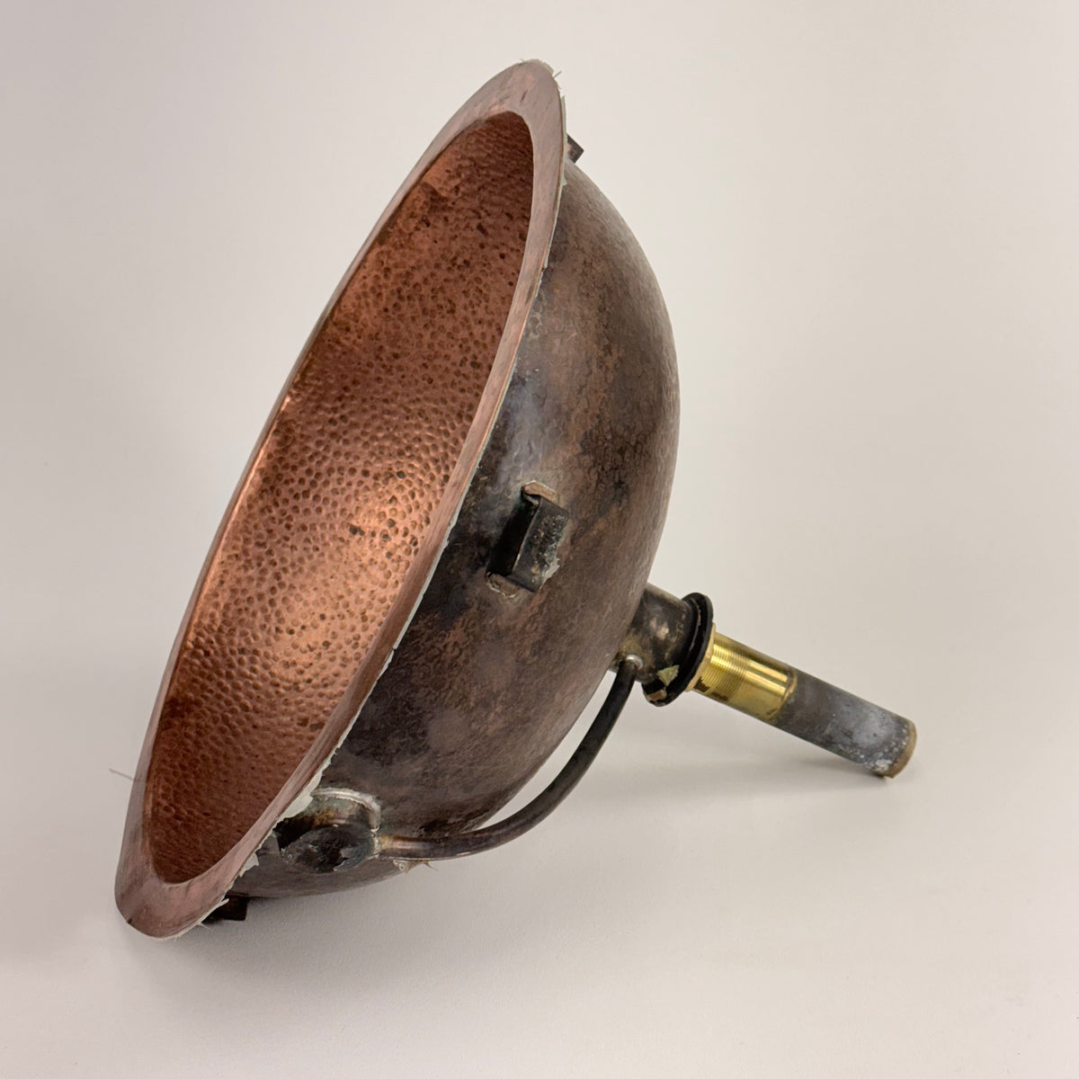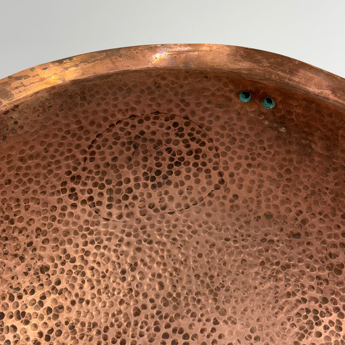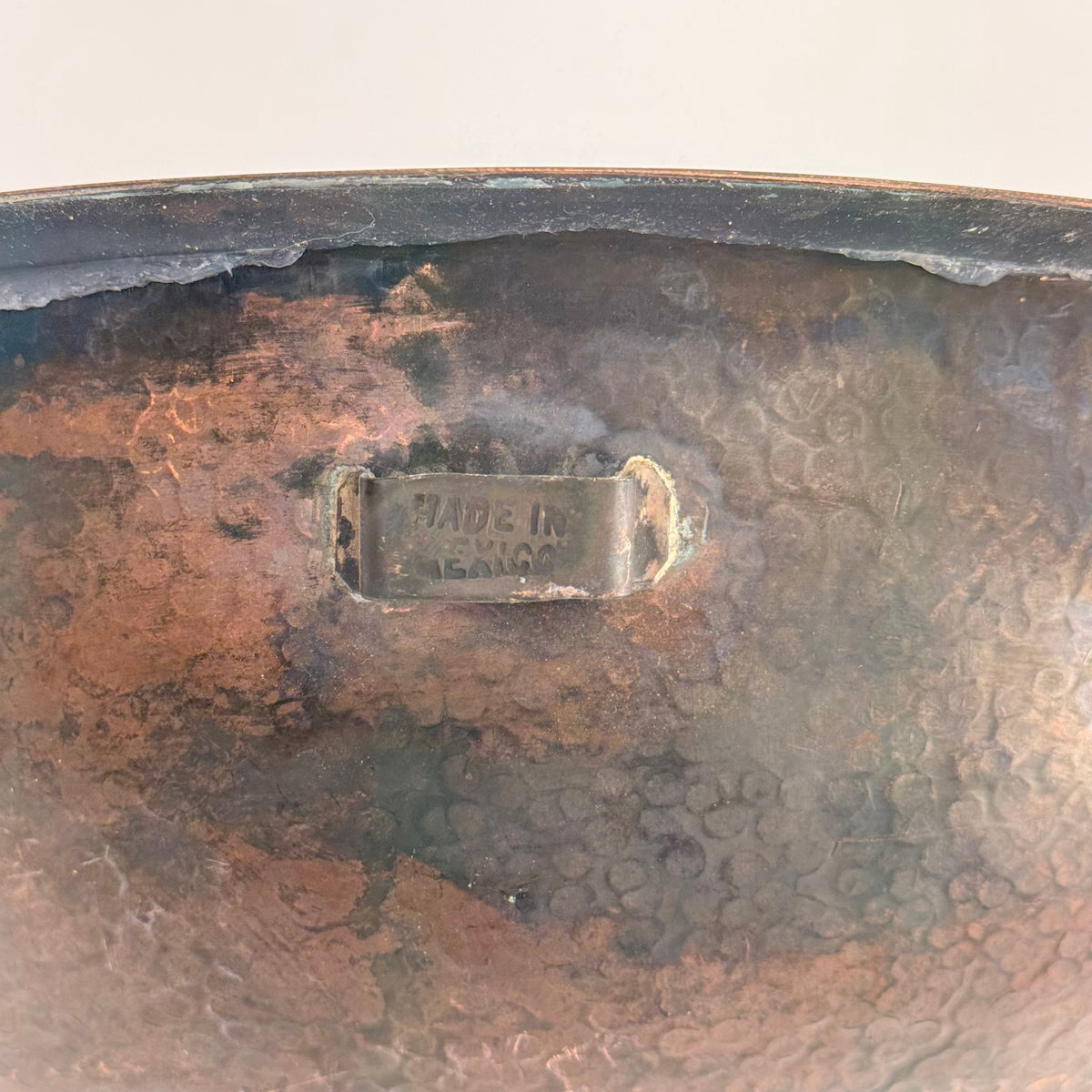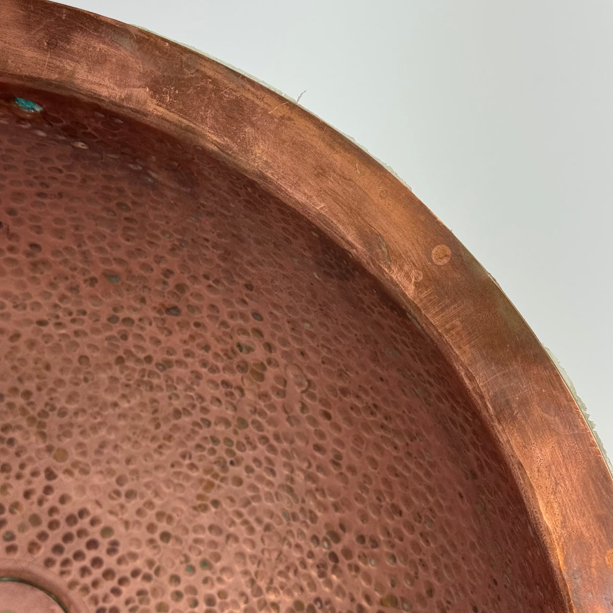 This product is a previously owned round, solid copper, hand-hammered bathroom sink made by Bates and Bates. It's meant to be installed as a drop-in sink and comes with a 5.5" pipe attached.