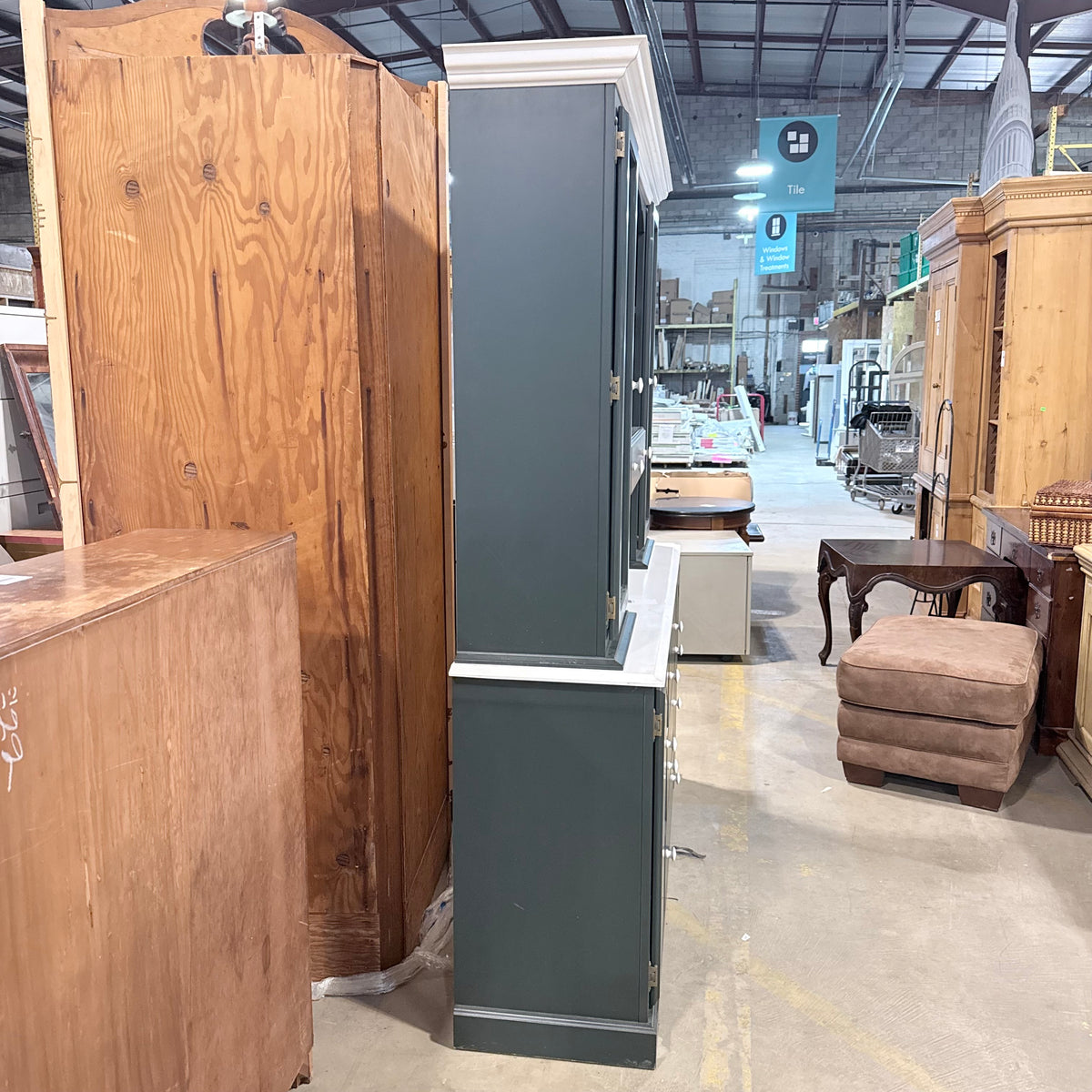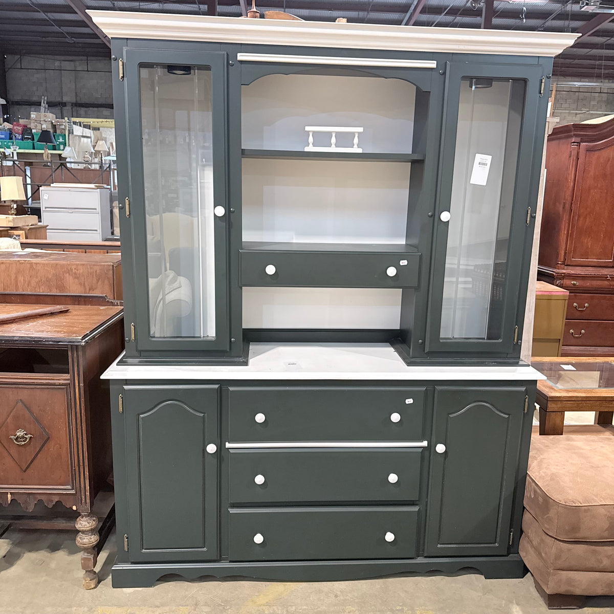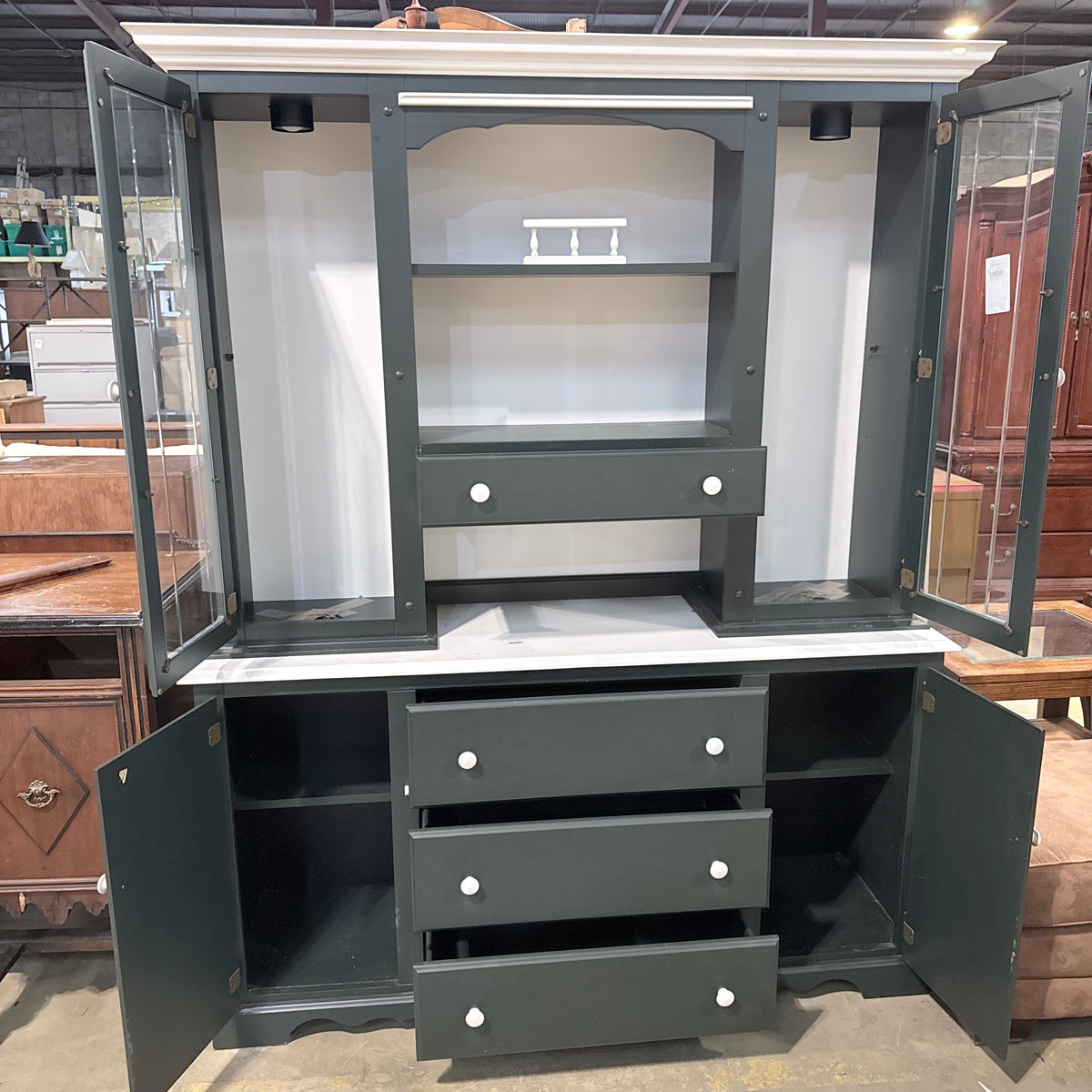 This product is a previously owned two-toned casual dining hutch cabinet with glass doors. It is made in two pieces for moving. The top hutch compartment features an open shelf in the center and a display cabinet at either side behind a glass panel door. The base consists of three drawers and a storage cabinet at either side with a single shelf.