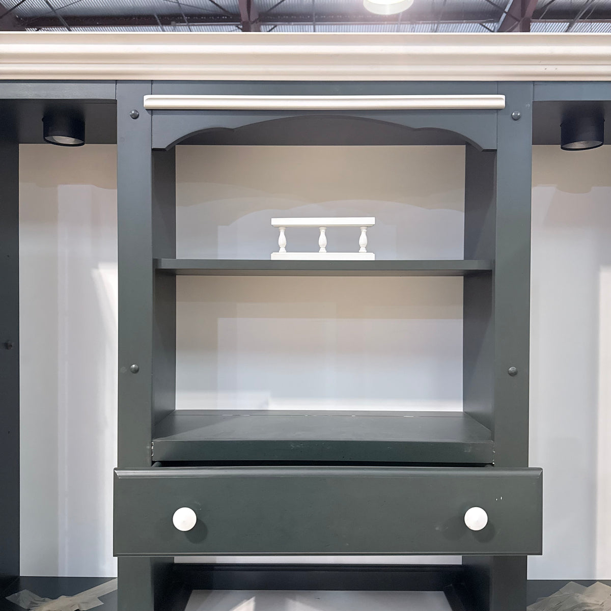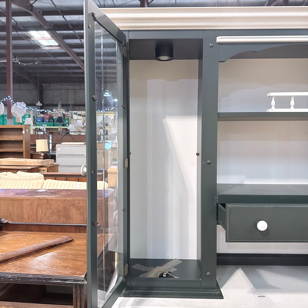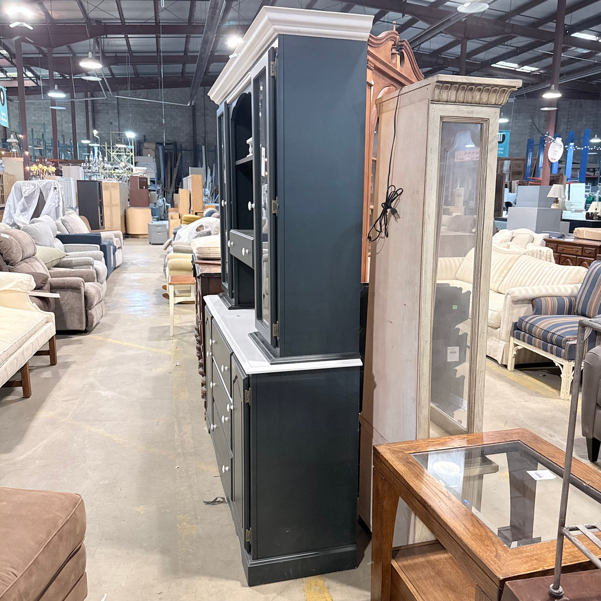 This product is a previously owned two-toned casual dining hutch cabinet with glass doors. It is made in two pieces for moving. The top hutch compartment features an open shelf in the center and a display cabinet at either side behind a glass panel door. The base consists of three drawers and a storage cabinet at either side with a single shelf.