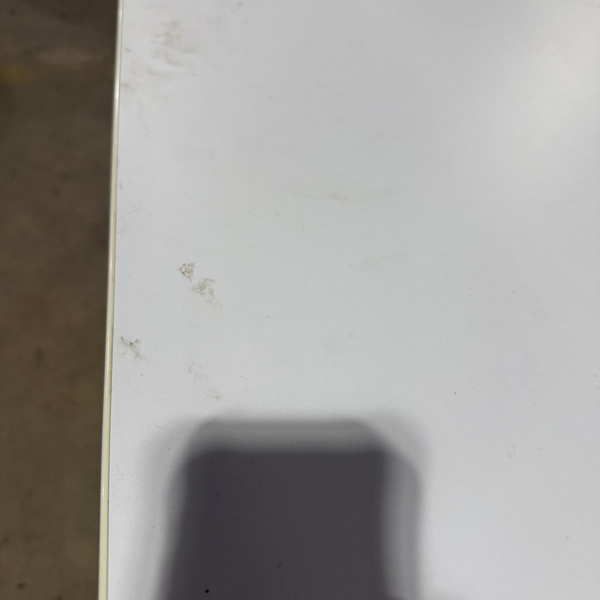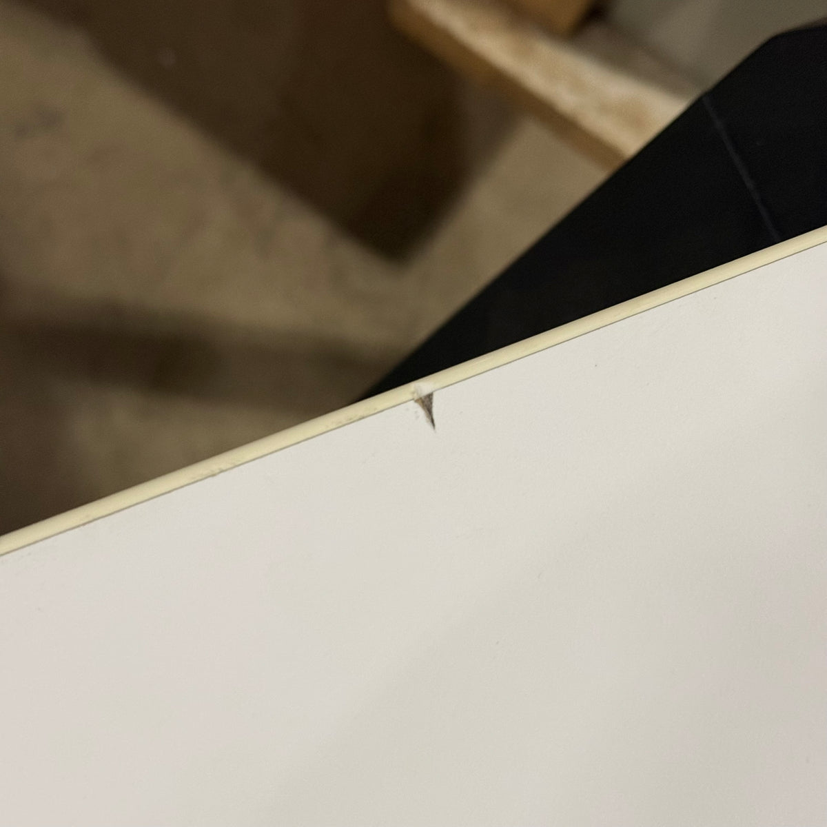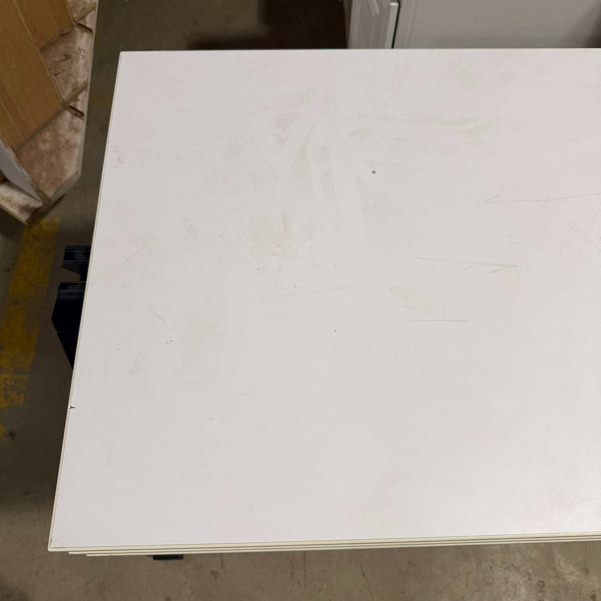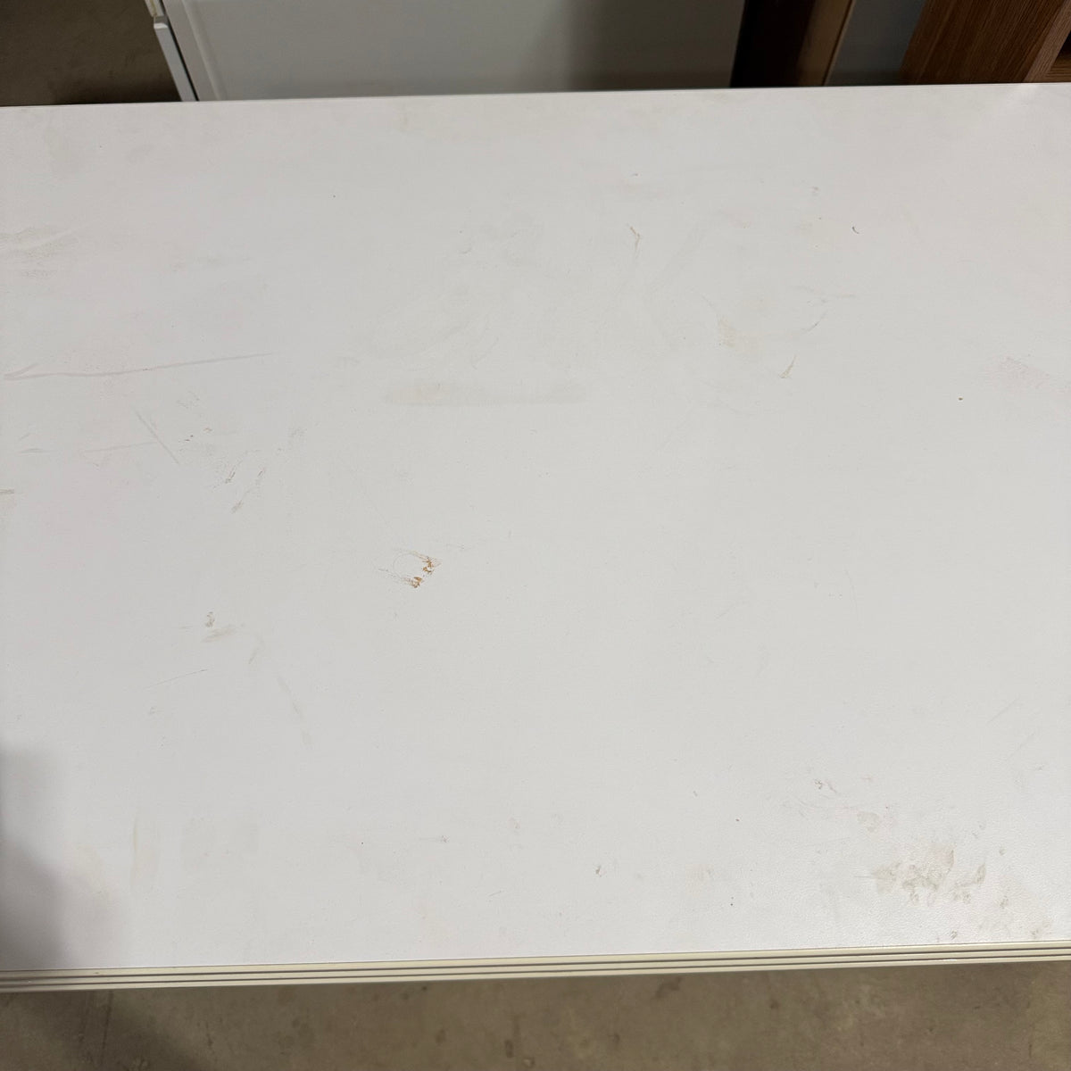 Please note, there are chips to the surface top's laminate finish in a few areas, especially along the edges and corners of the table. There are also scuffs to the metal frame along the feet (see photos).