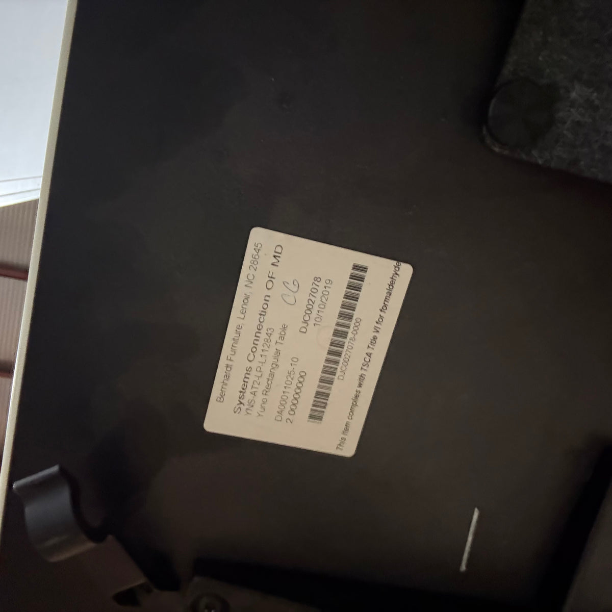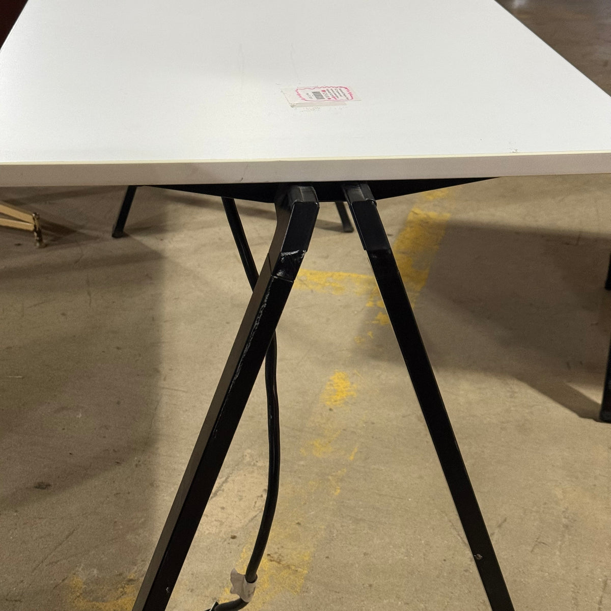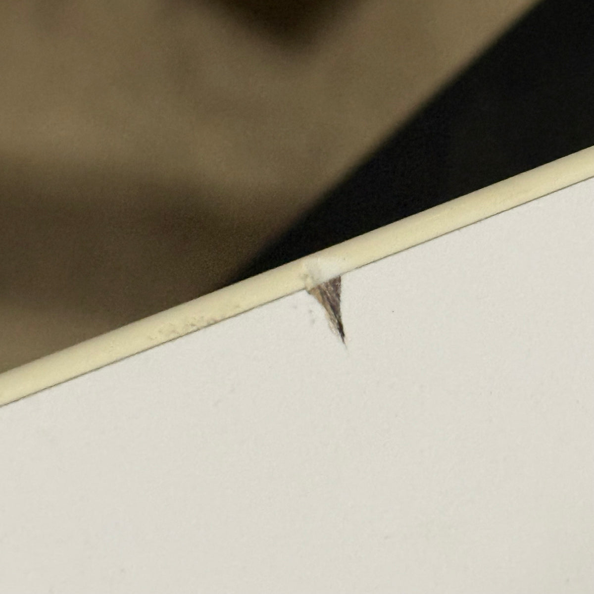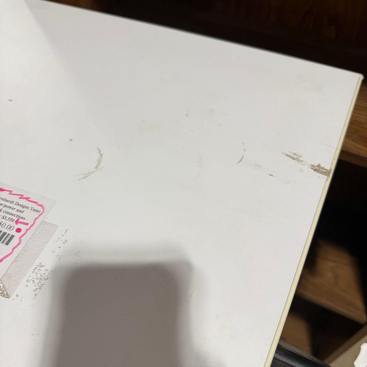 Please note, there are chips to the surface top's laminate finish in a few areas, especially along the edges and corners of the table. There are also scuffs to the metal frame along the feet (see photos).