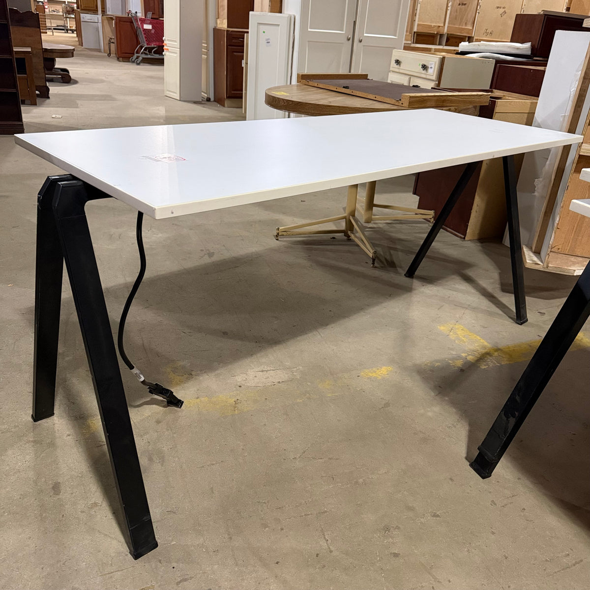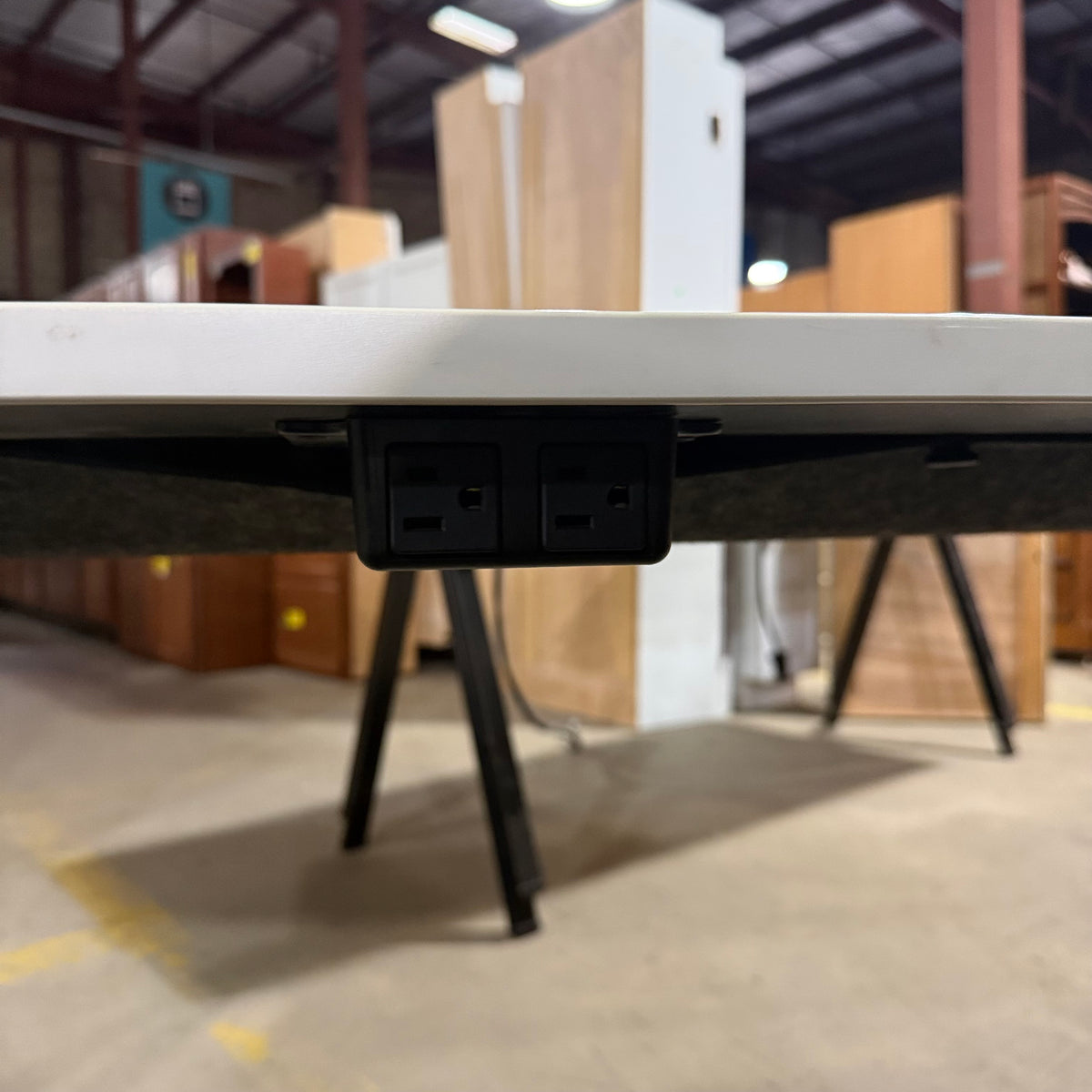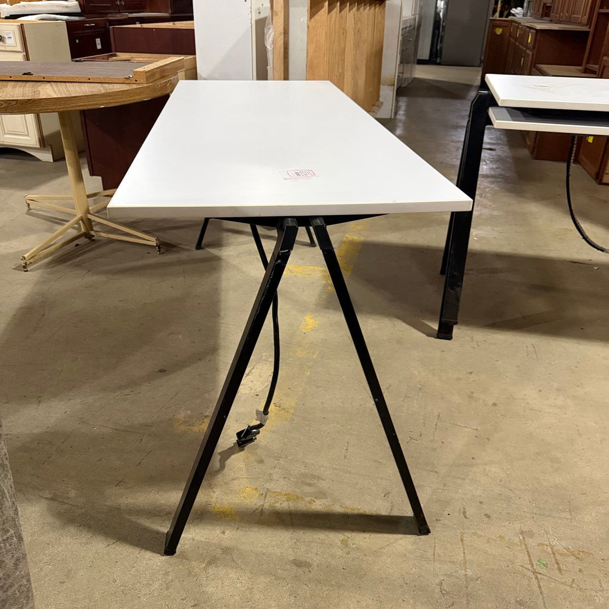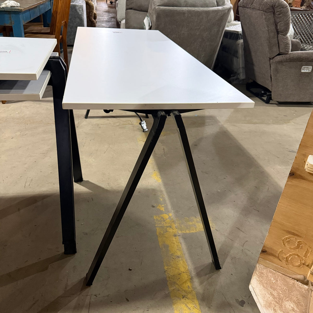 Please note, there are chips to the surface top's laminate finish in a few areas, especially along the edges and corners of the table. There are also scuffs to the metal frame along the feet (see photos).