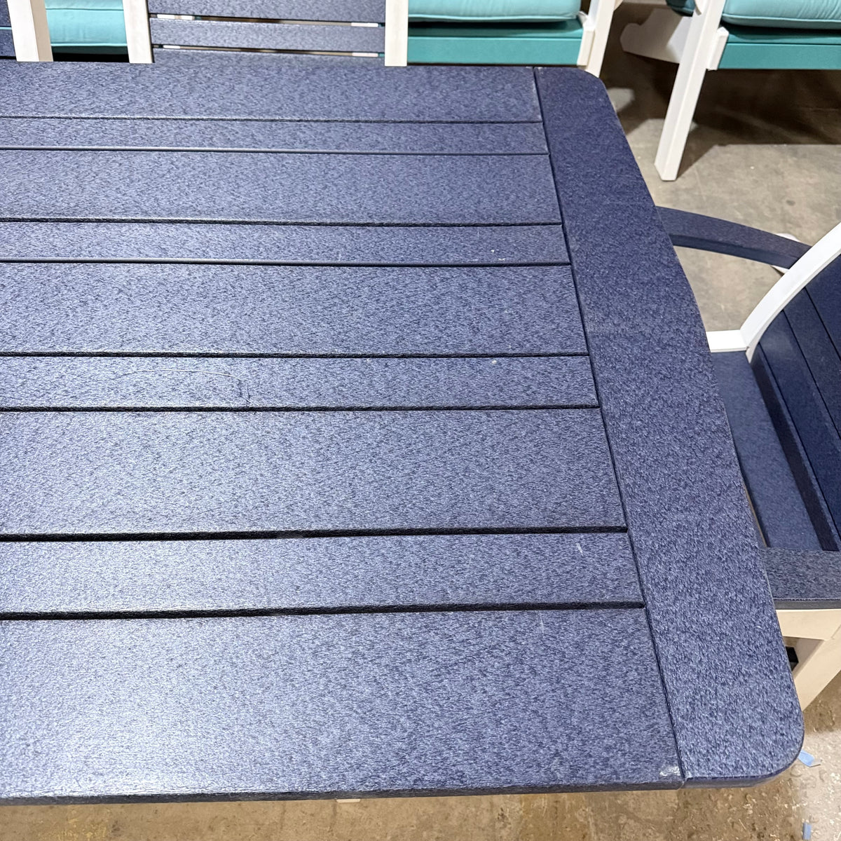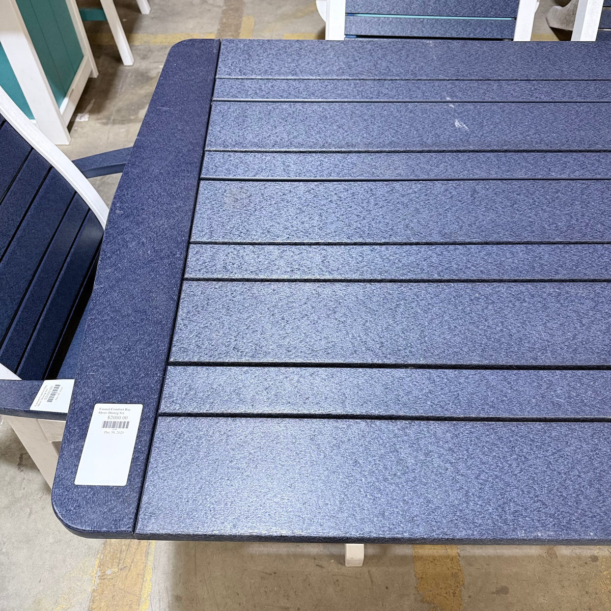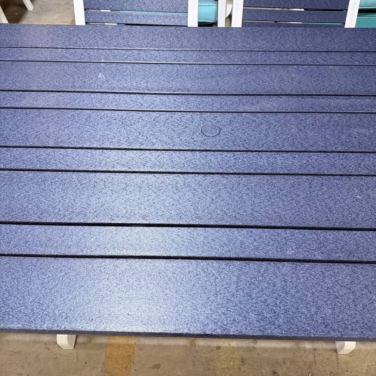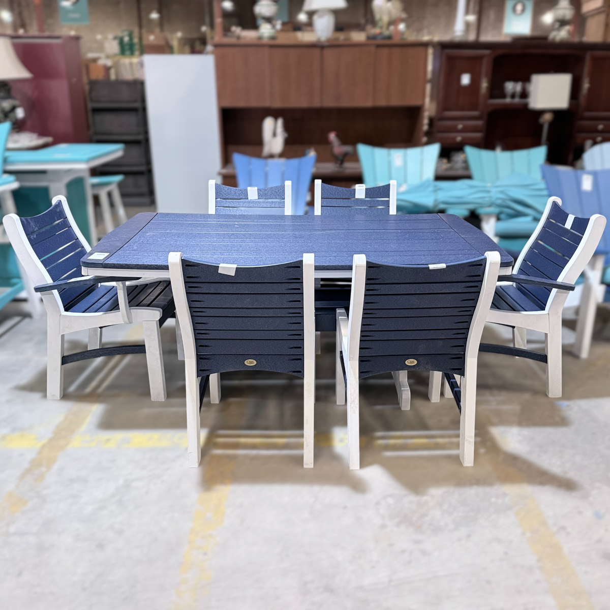 This 7-piece patio dining set by Casual Comfort includes a blue and white, rectangular table with a hole in the center for an umbrella (umbrella not included) and includes four matching side chairs and two matching arm chairs. The table and chairs are constructed from poly lumber which is made from recycled plastic and is not only sustainable and eco-friendly, but also durable and fade-resistant.