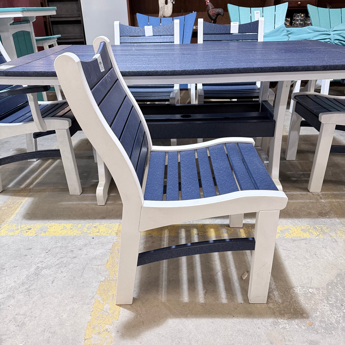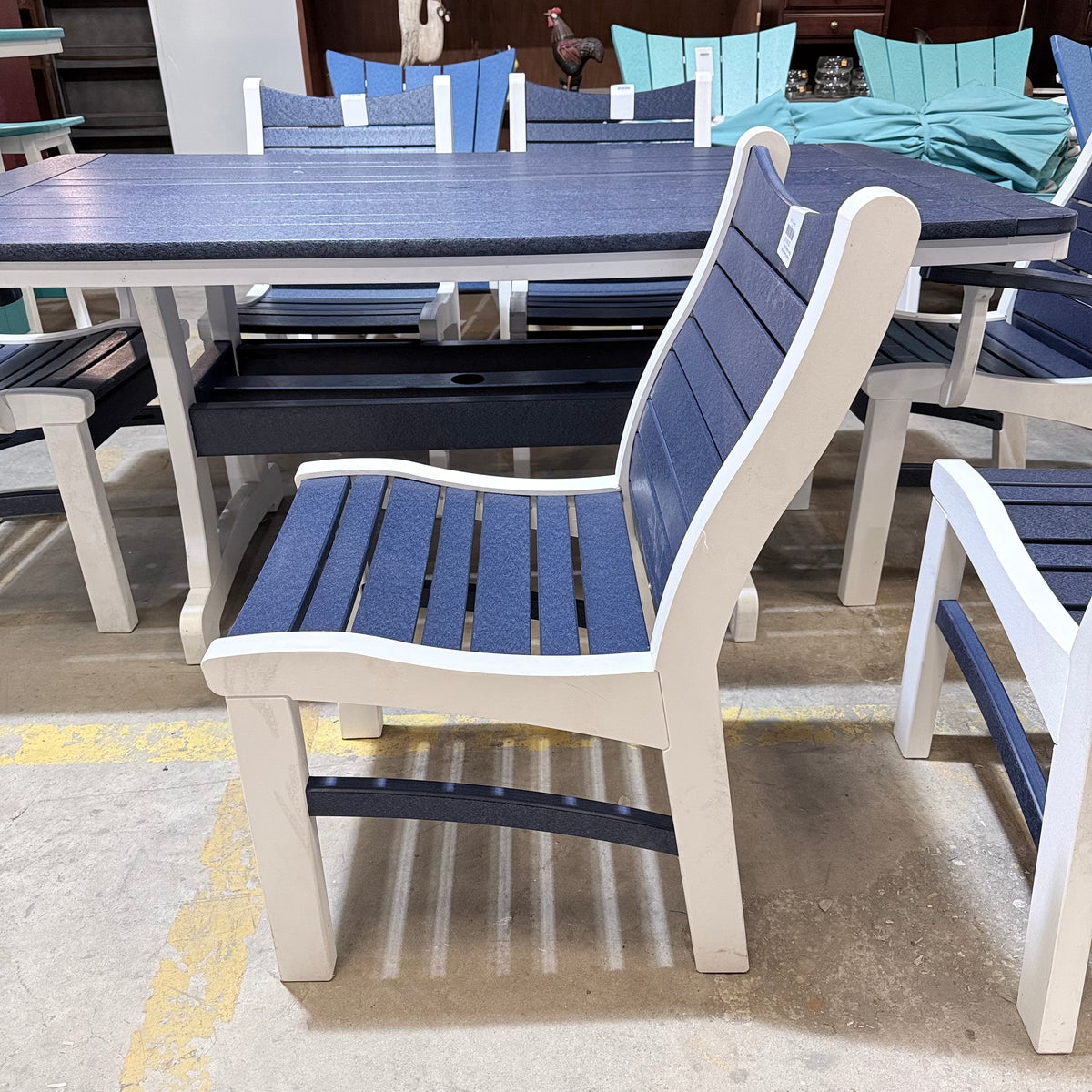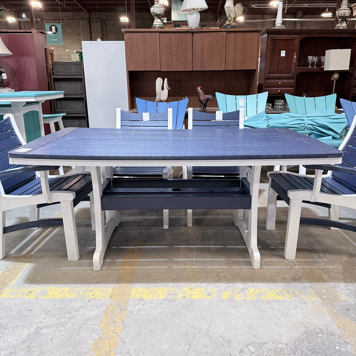 This 7-piece patio dining set by Casual Comfort includes a blue and white, rectangular table with a hole in the center for an umbrella (umbrella not included) and includes four matching side chairs and two matching arm chairs. The table and chairs are constructed from poly lumber which is made from recycled plastic and is not only sustainable and eco-friendly, but also durable and fade-resistant.