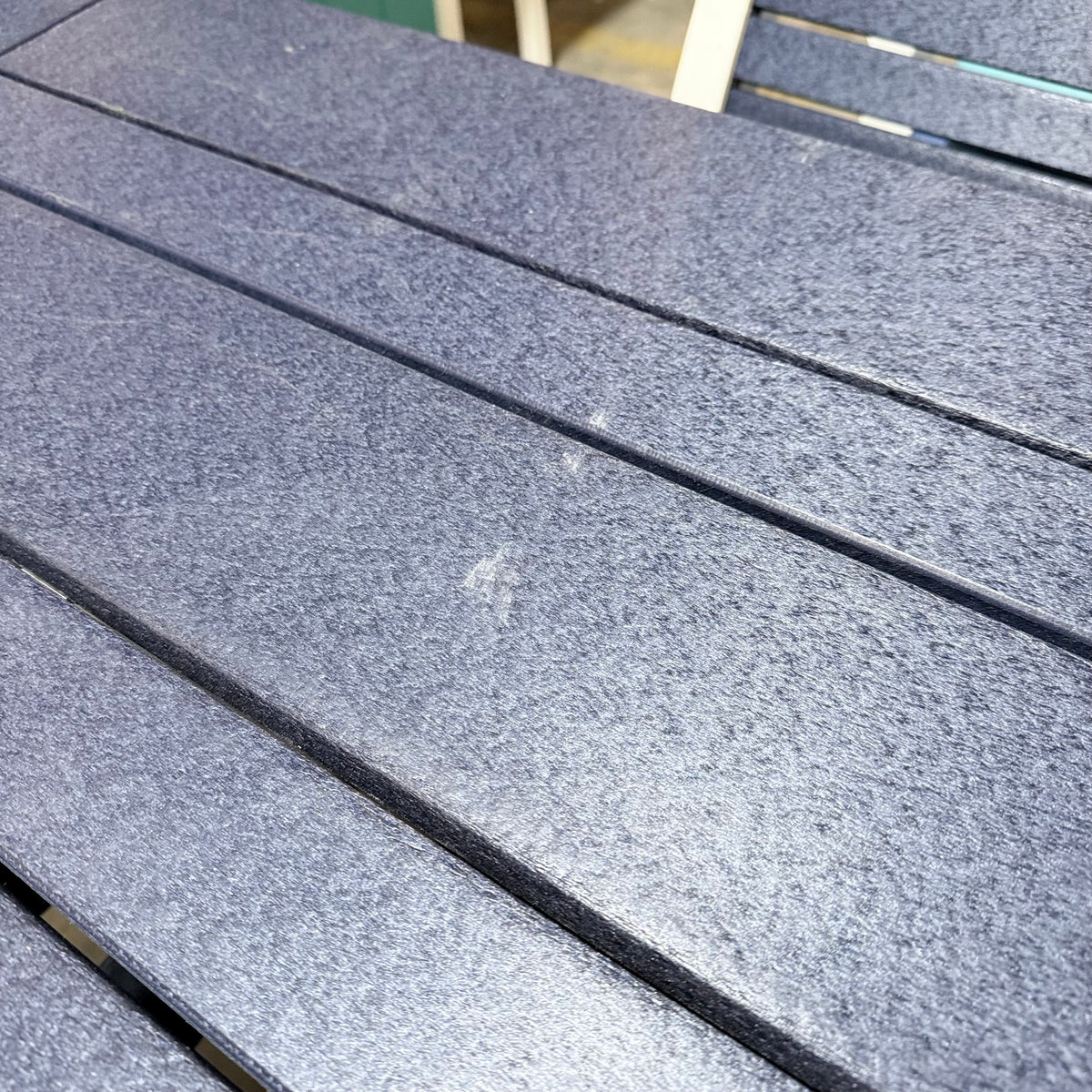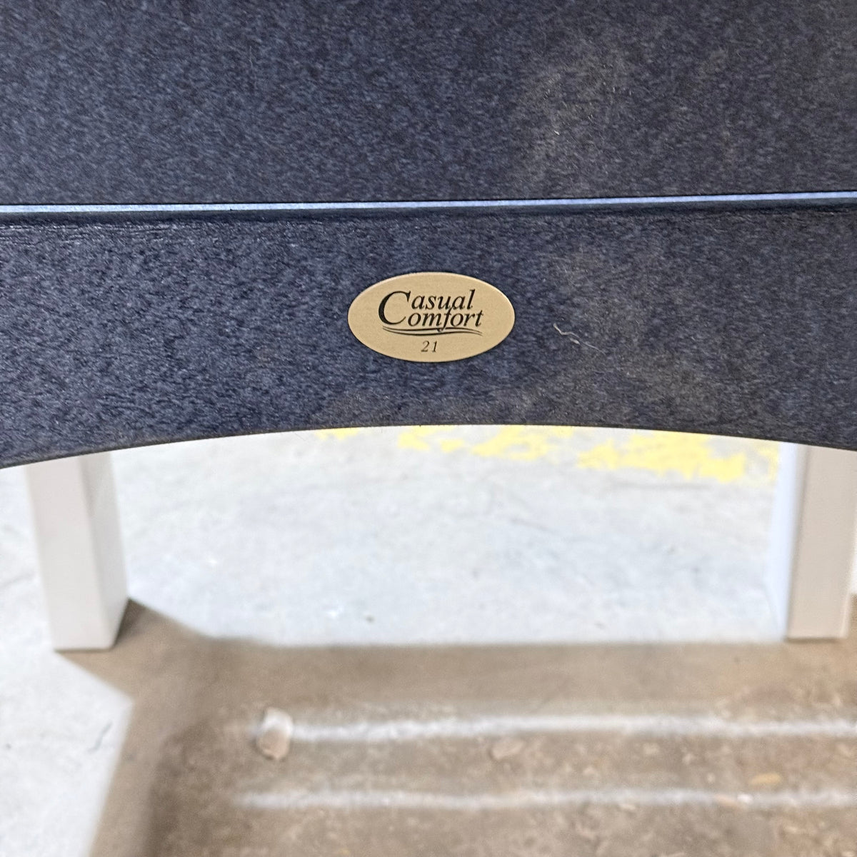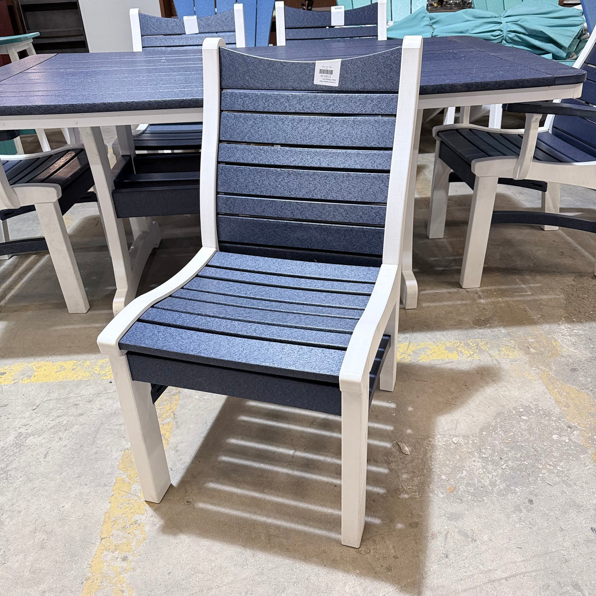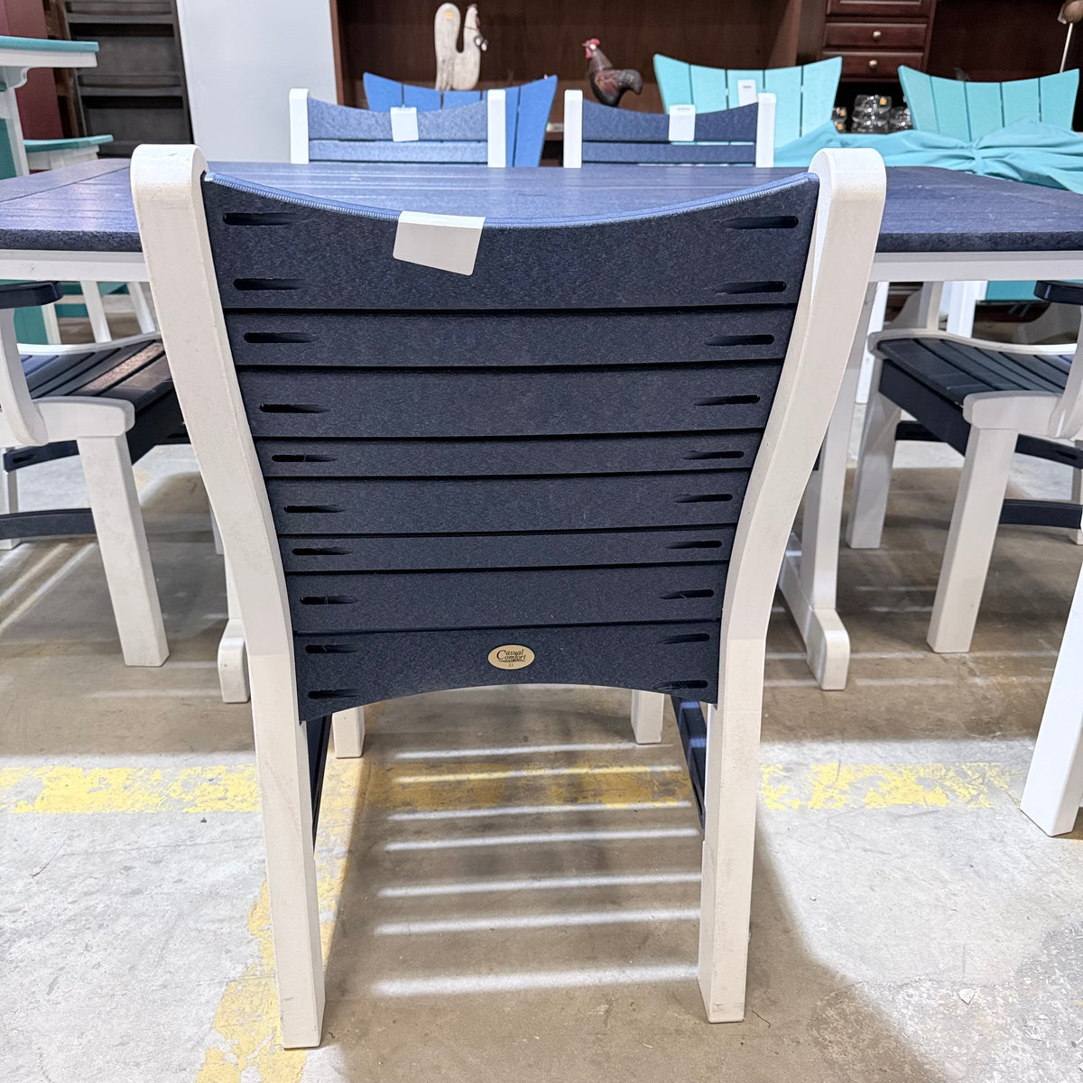 This 7-piece patio dining set by Casual Comfort includes a blue and white, rectangular table with a hole in the center for an umbrella (umbrella not included) and includes four matching side chairs and two matching arm chairs. The table and chairs are constructed from poly lumber which is made from recycled plastic and is not only sustainable and eco-friendly, but also durable and fade-resistant.