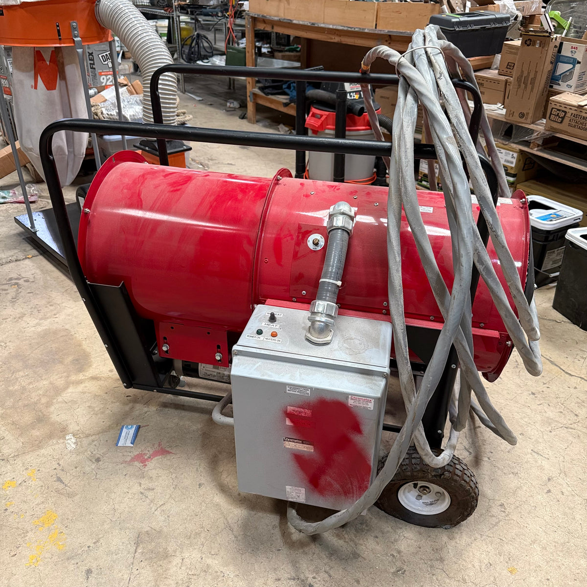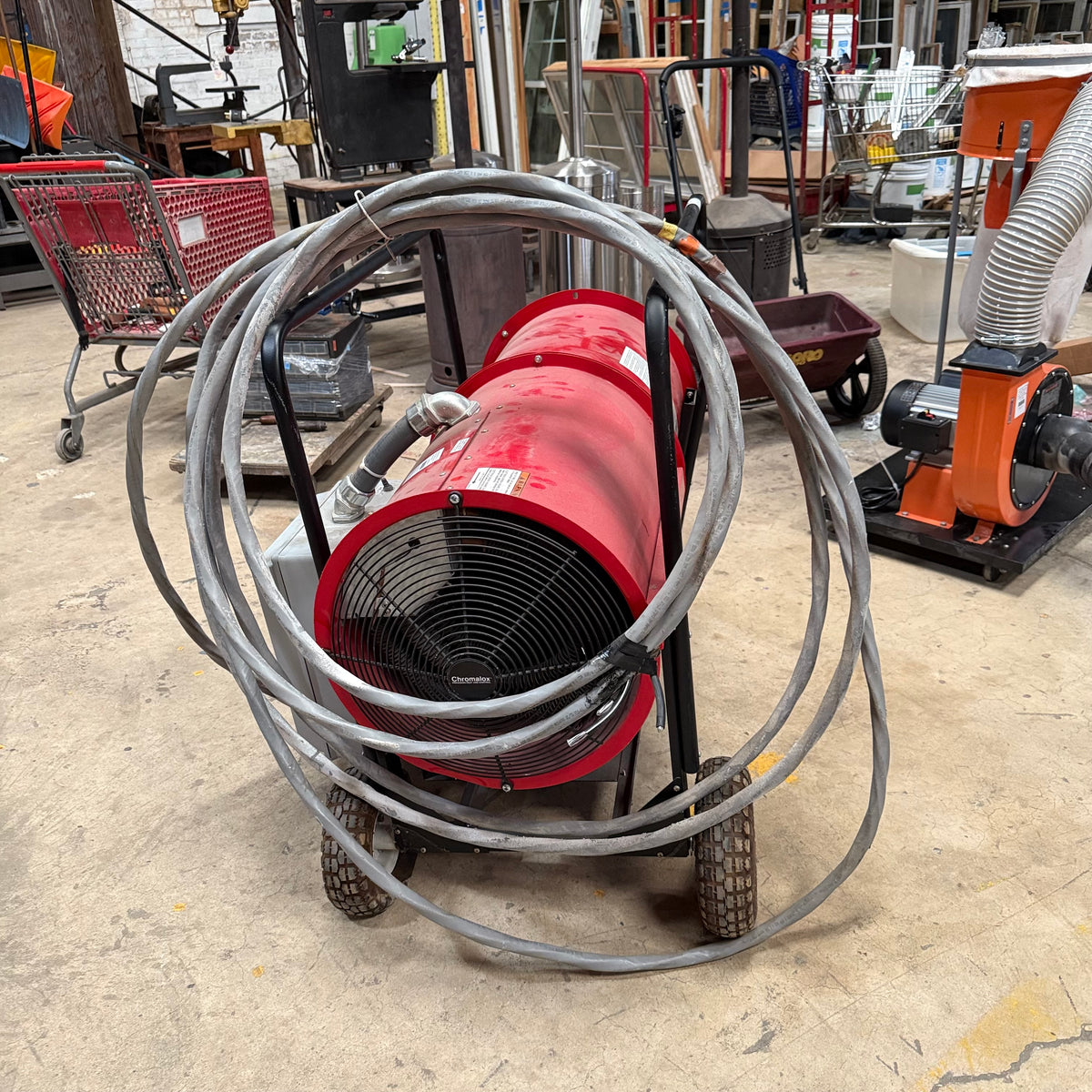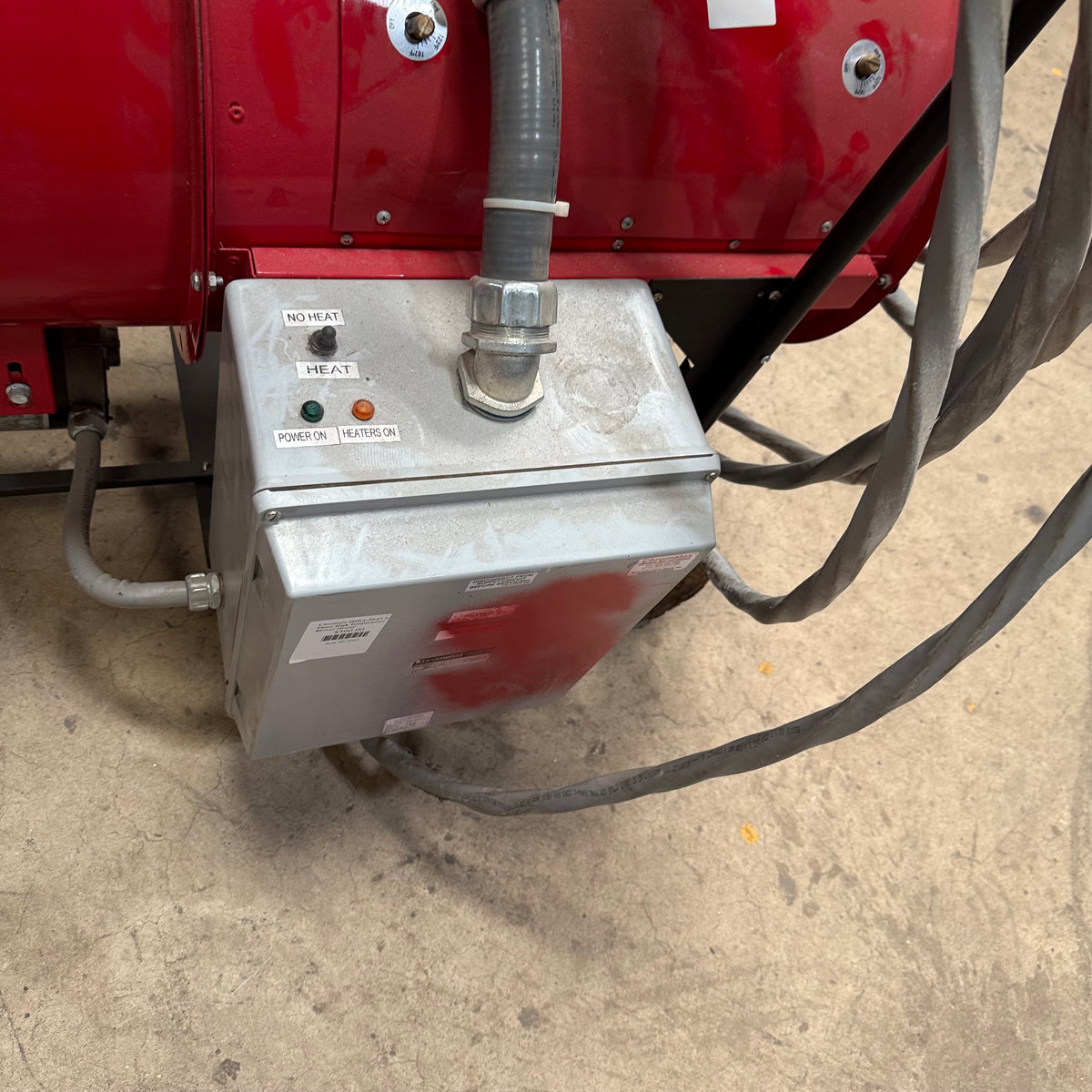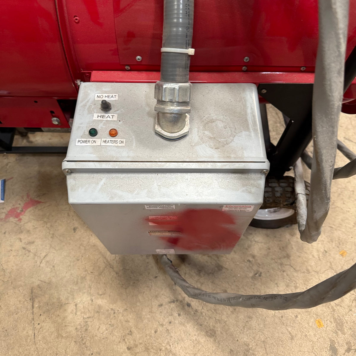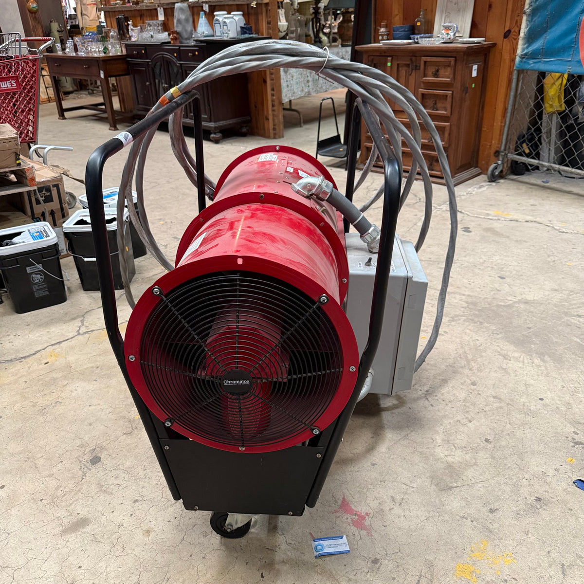 This product is a previously owned Chromalox 3-phase high temperature blower heater. Please note, one of the wheels on the cart has gone flat and may need to be replaced (see photos).
