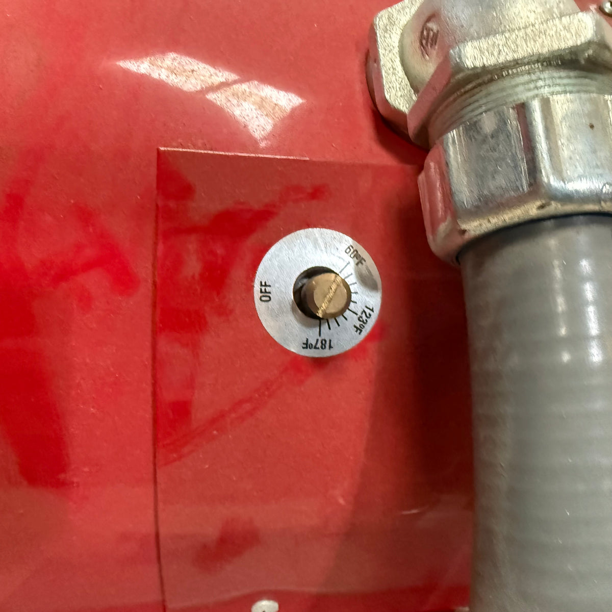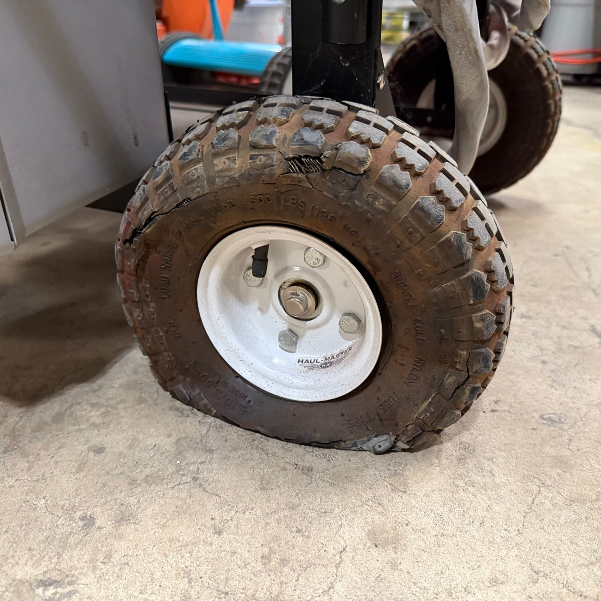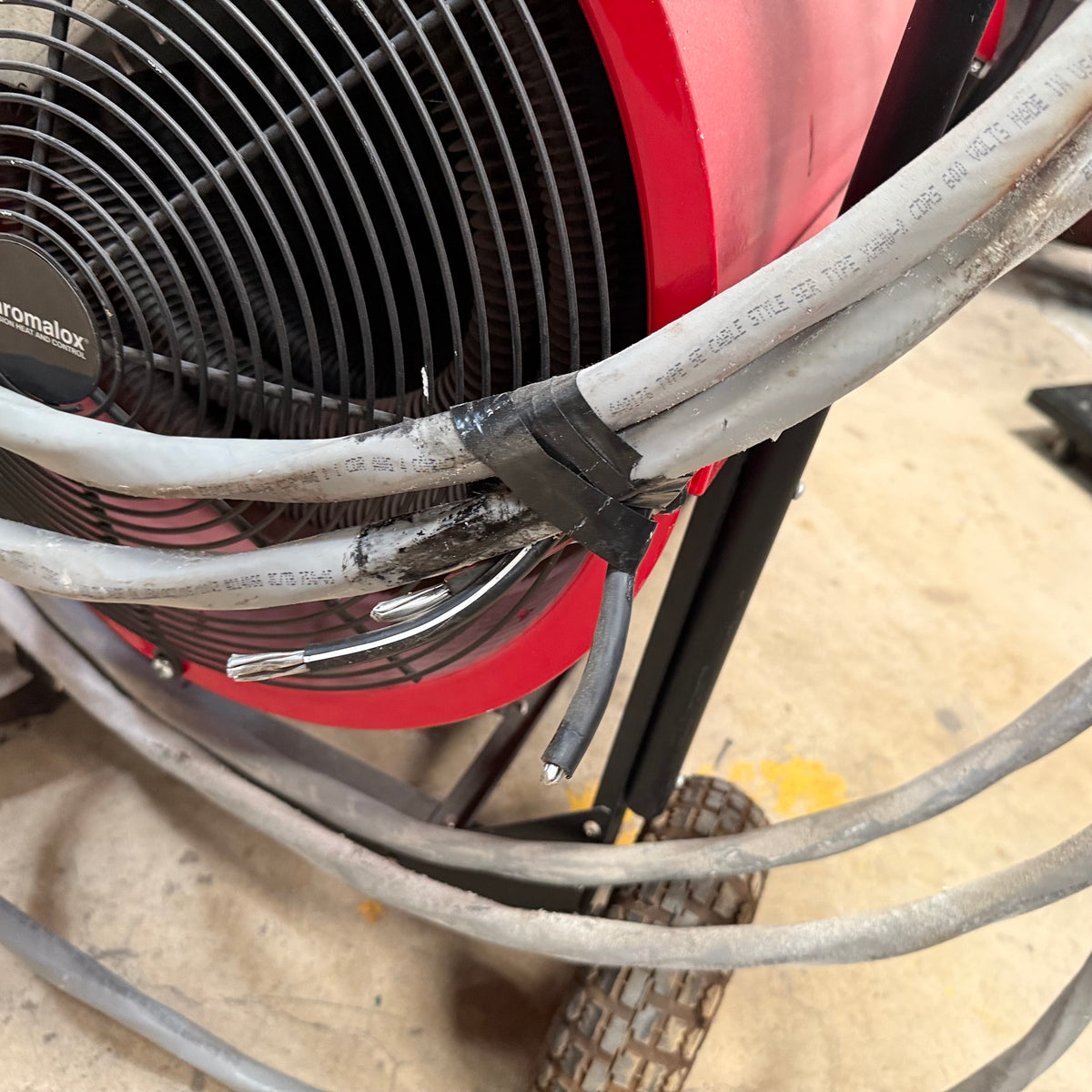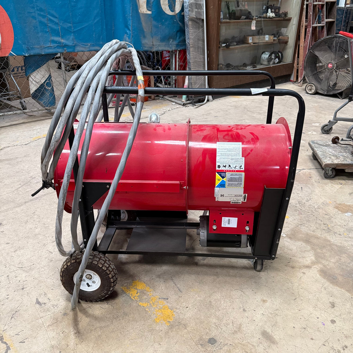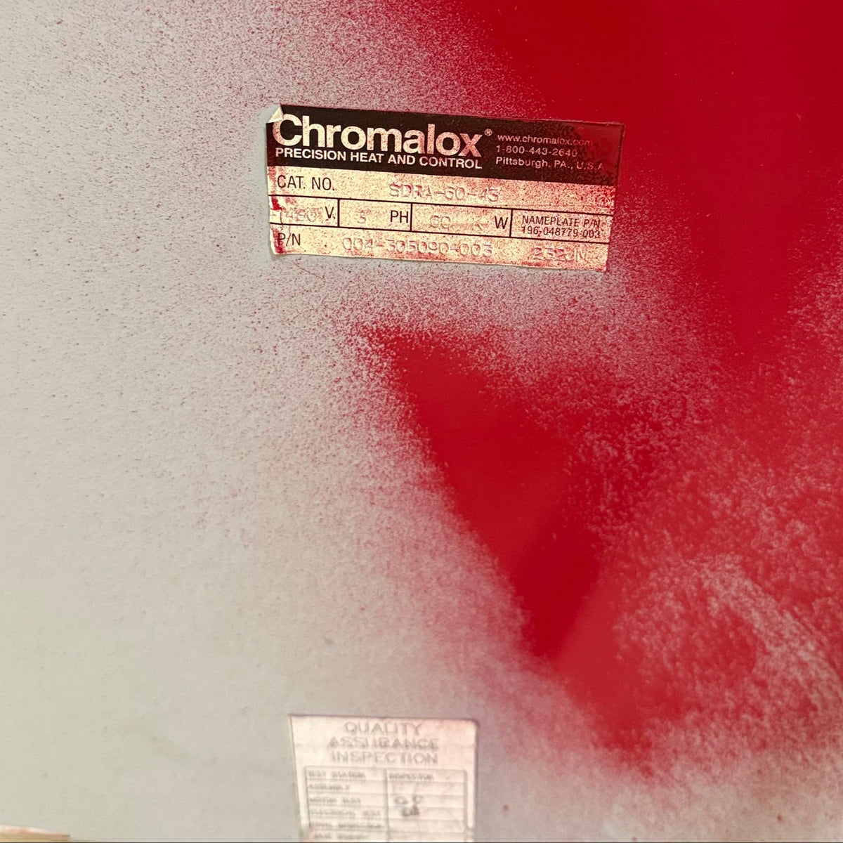 This product is a previously owned Chromalox 3-phase high temperature blower heater. Please note, one of the wheels on the cart has gone flat and may need to be replaced (see photos).