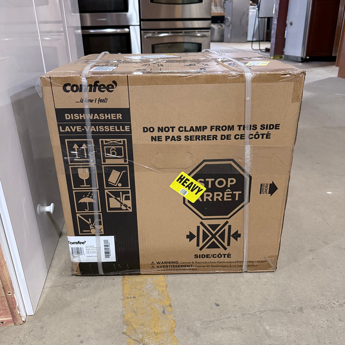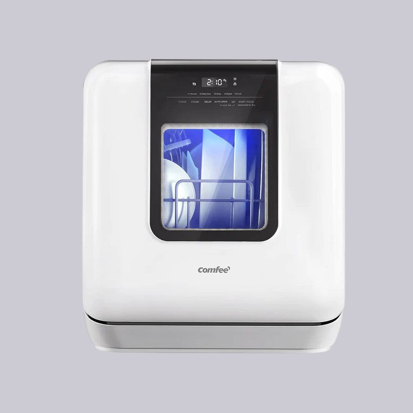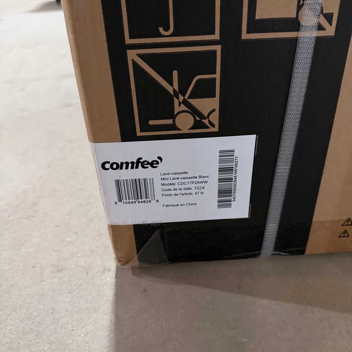 This is a new, in open-box COMFEE' compact countertop/portable dishwasher. Its box has been opened to inspect the contents. Features: