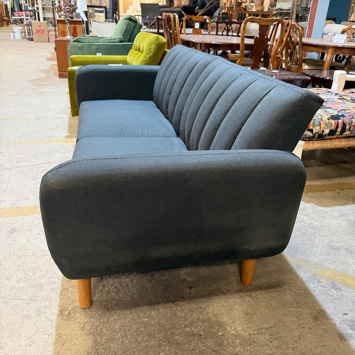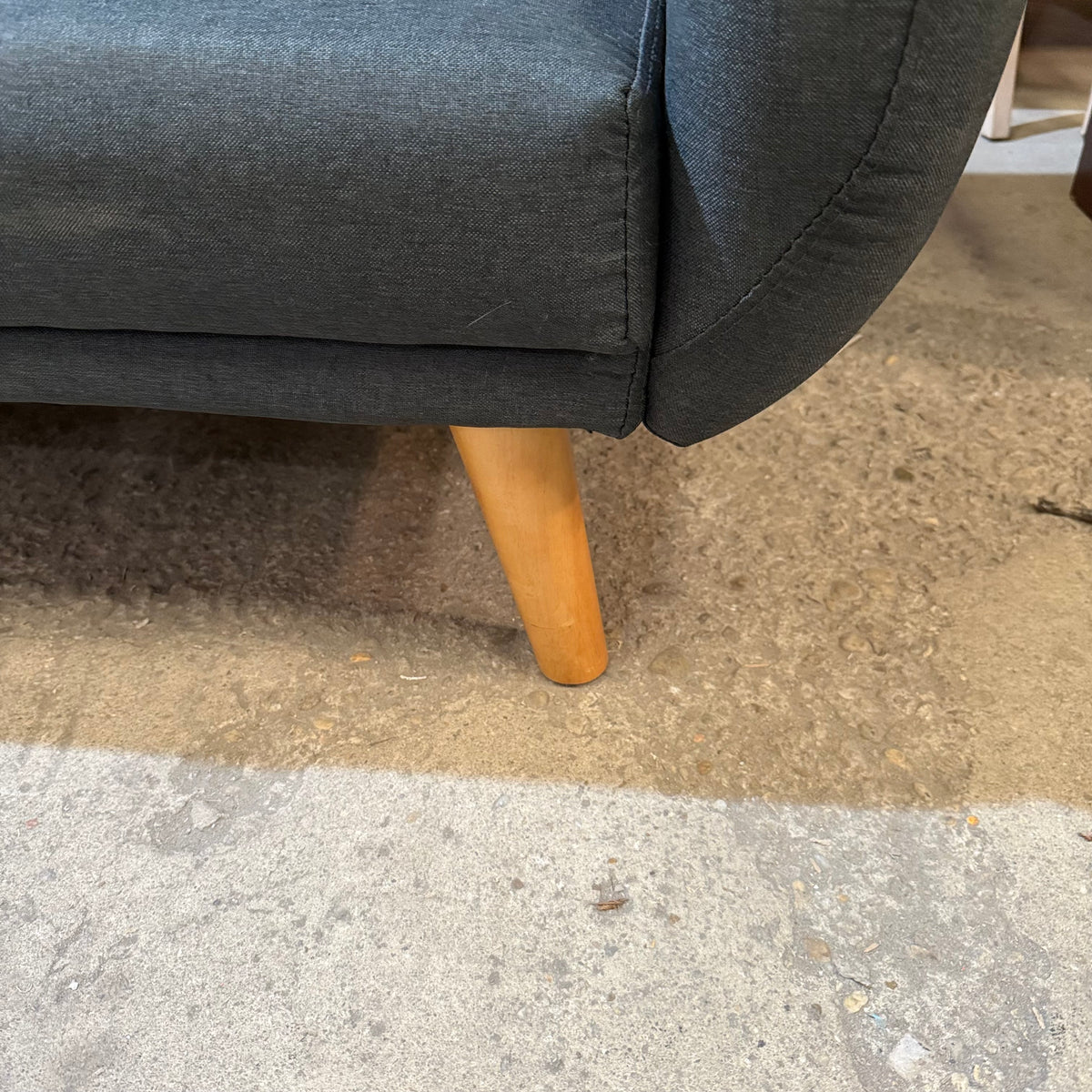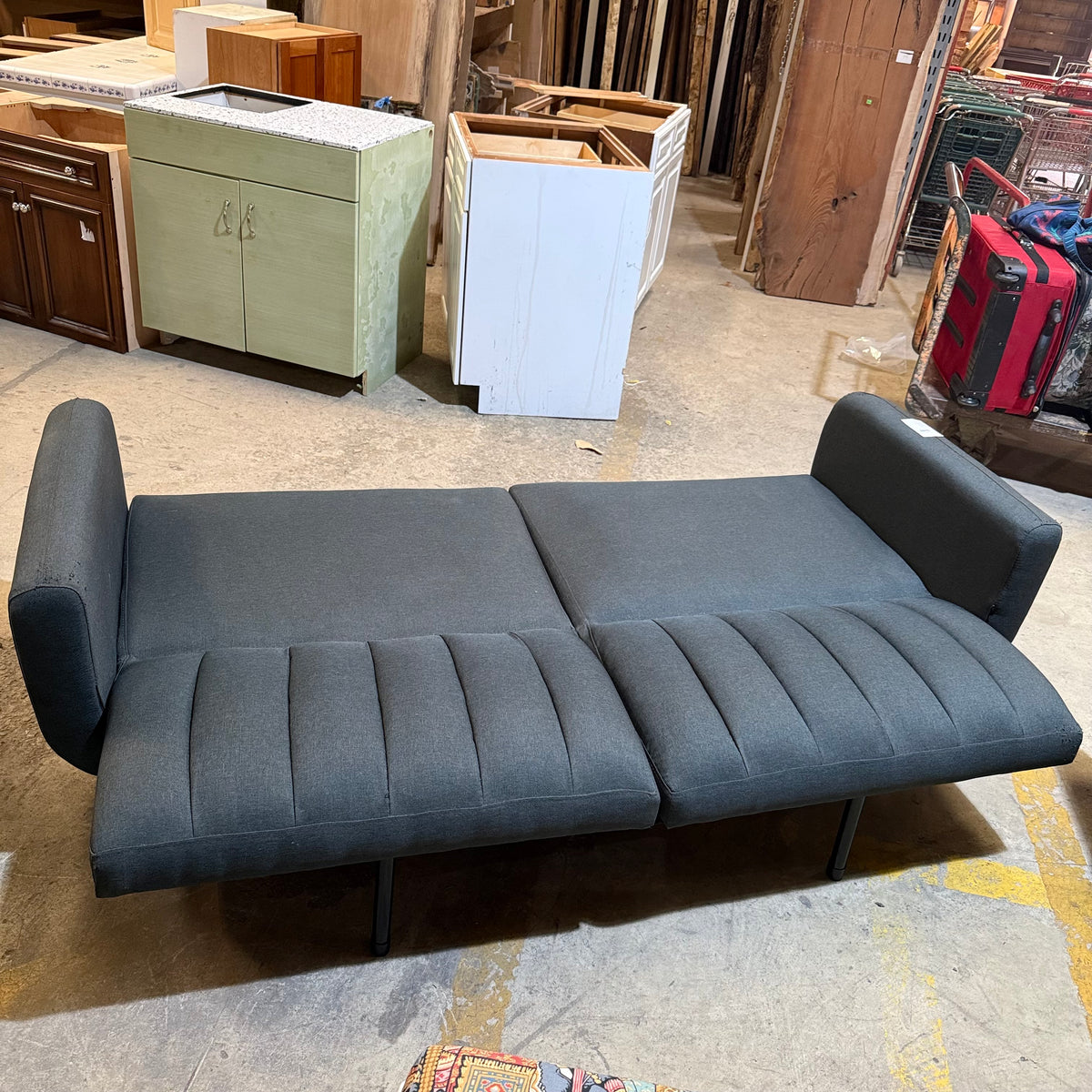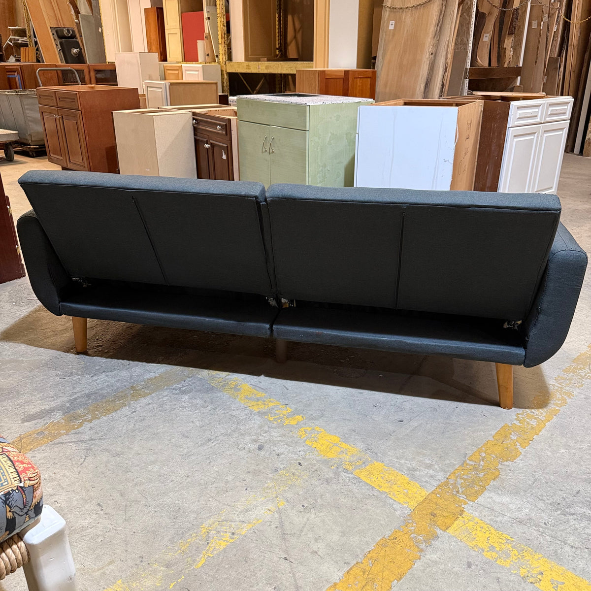 This product is a previously owned dark gray linen upholstered sleeper sofa by Dorel Home Furnishings. This sleeper sofa easily converts into a bed with two-positions to choose from -- upright or fully flipped all the way down. It sits on splayed, tapered wooden feet and is upholstered in a dark gray linen fabric.