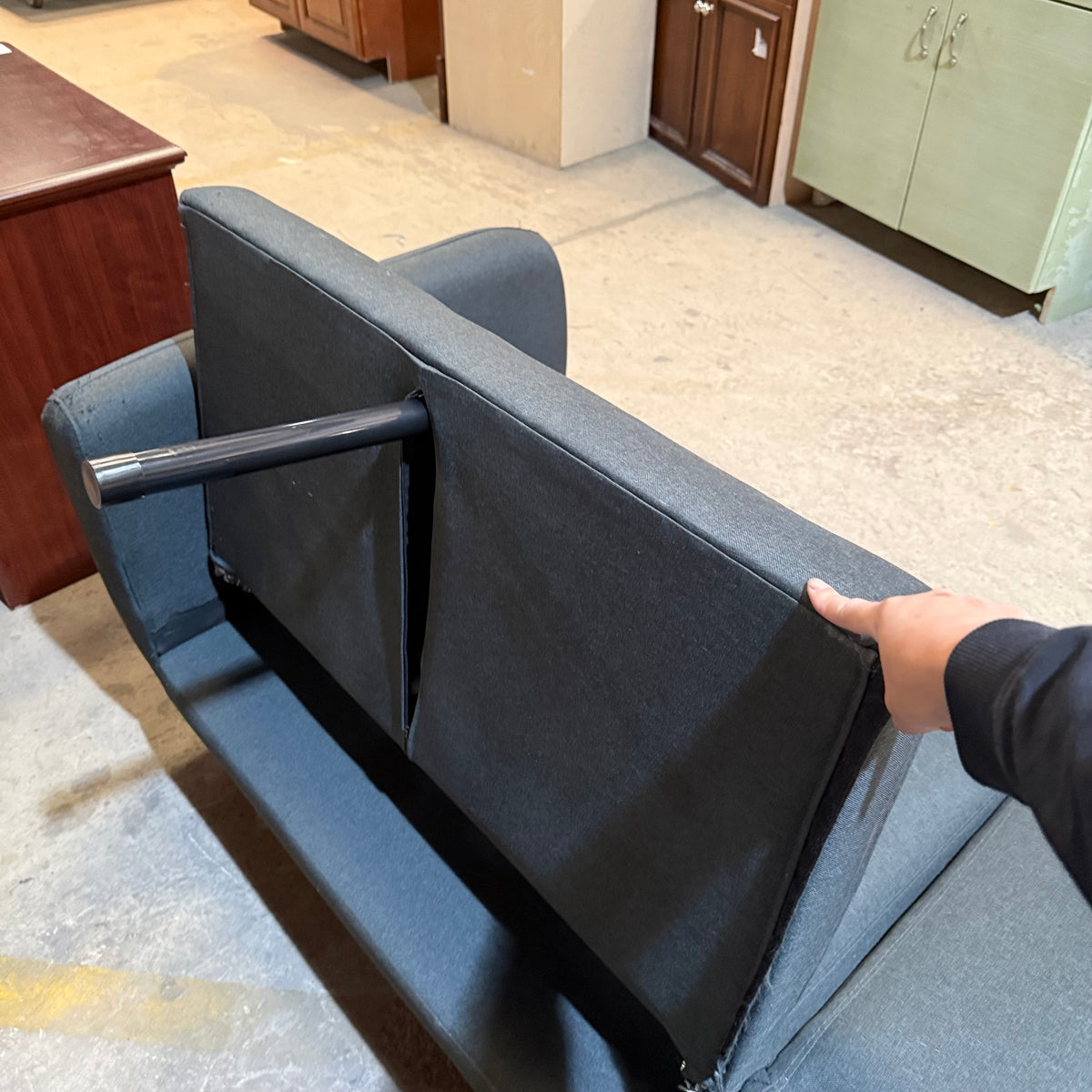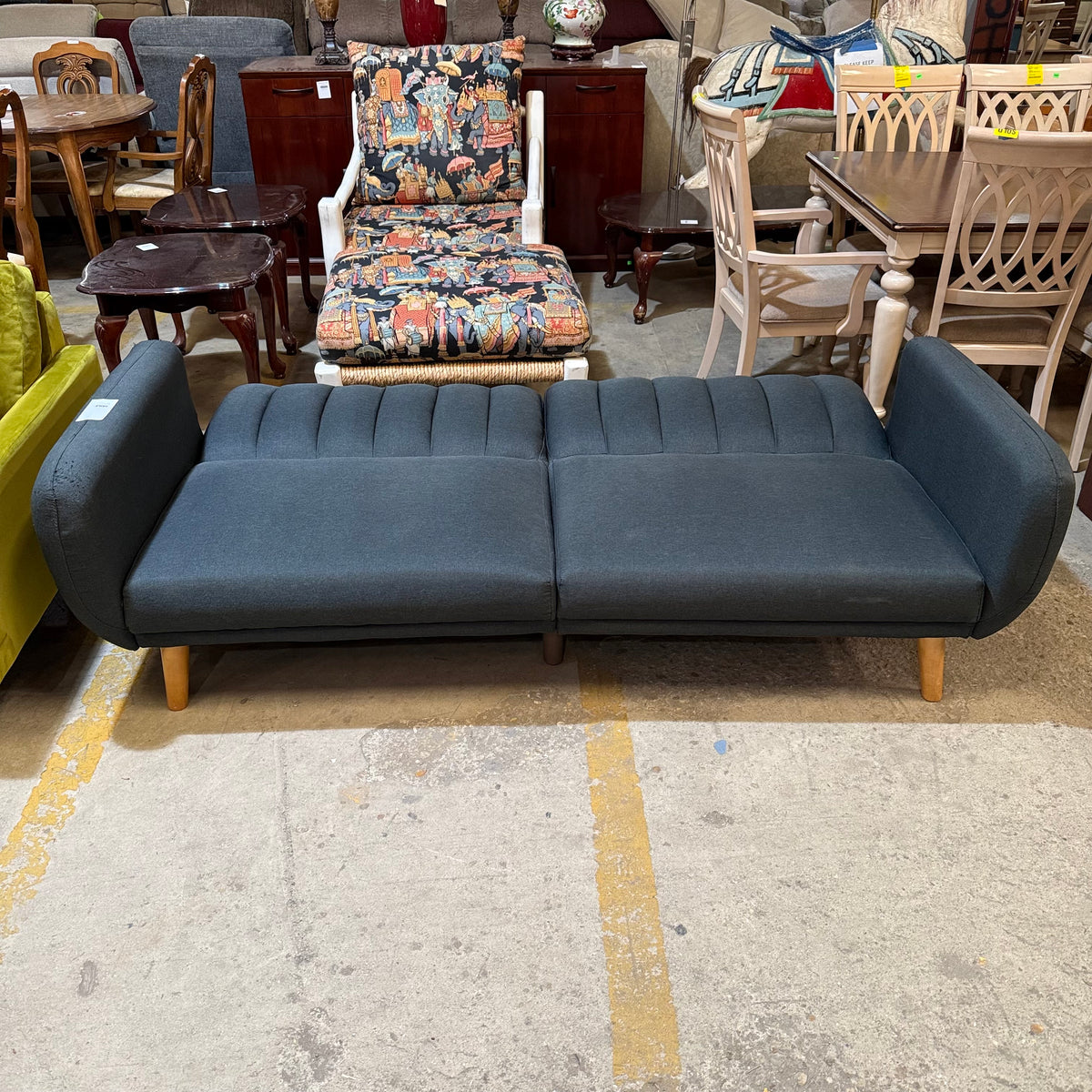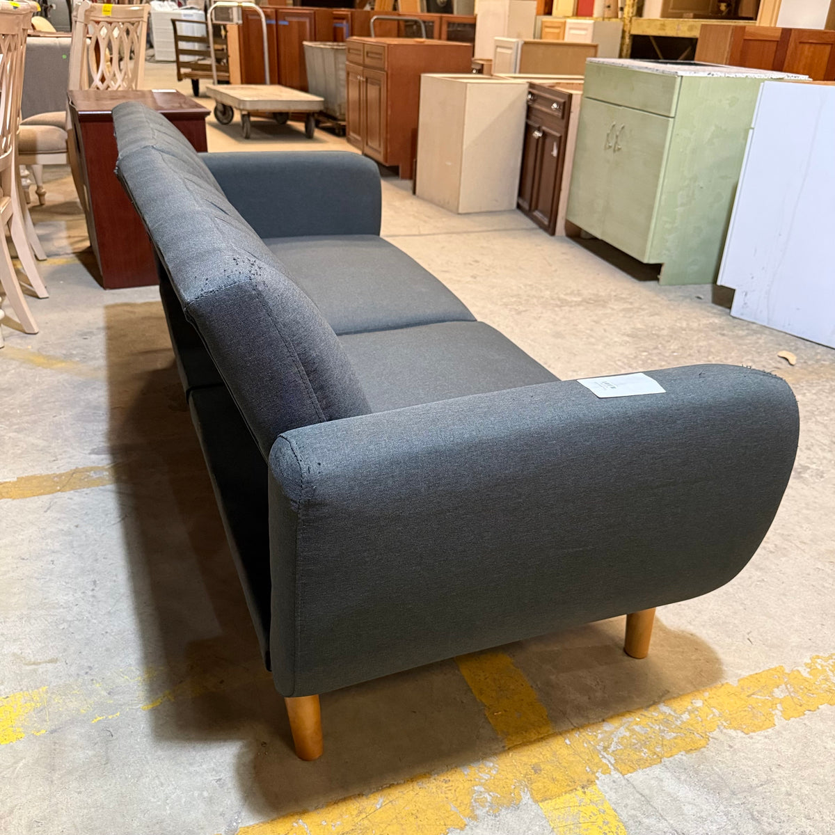 This product is a previously owned dark gray linen upholstered sleeper sofa by Dorel Home Furnishings. This sleeper sofa easily converts into a bed with two-positions to choose from -- upright or fully flipped all the way down. It sits on splayed, tapered wooden feet and is upholstered in a dark gray linen fabric.